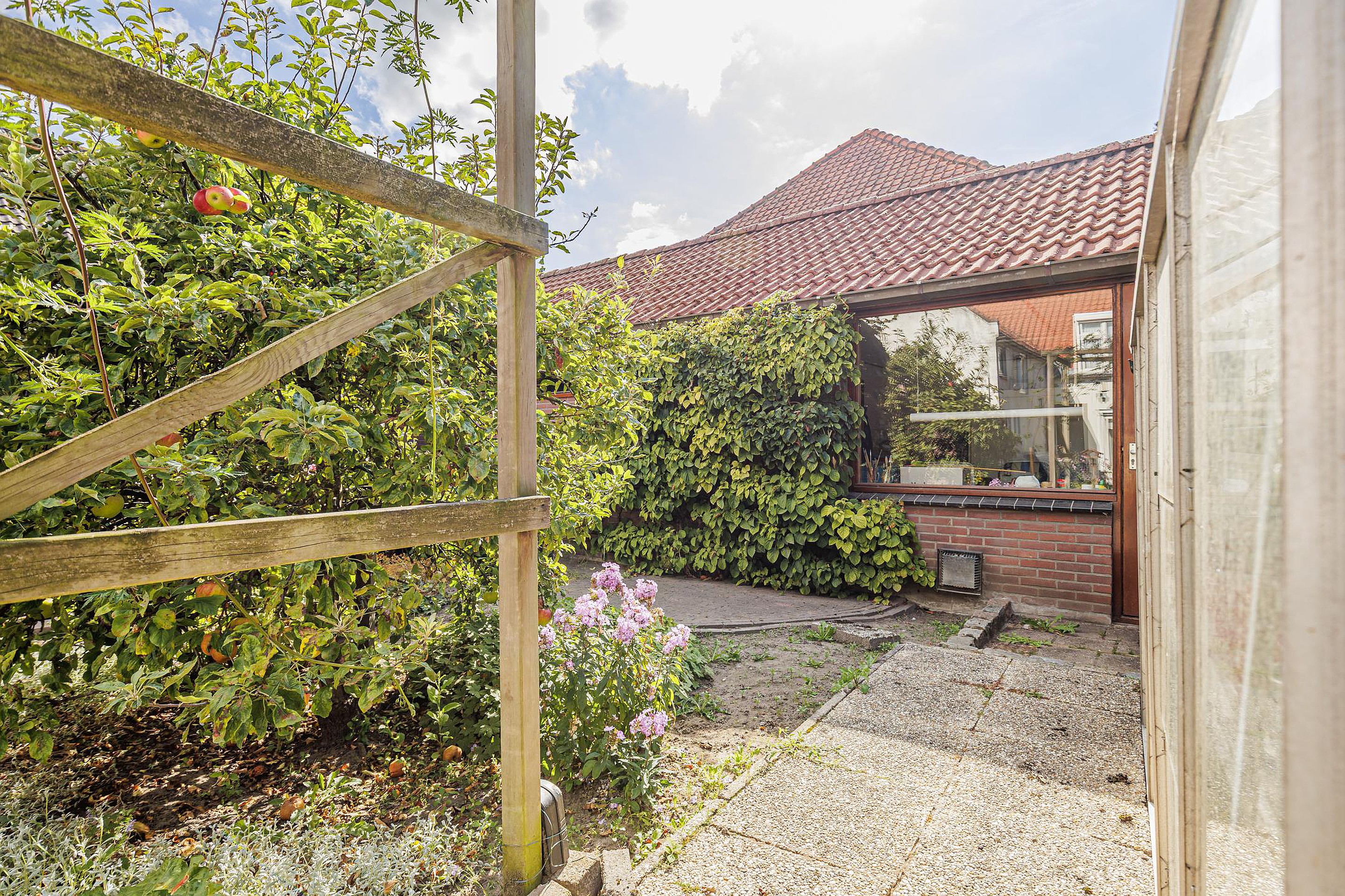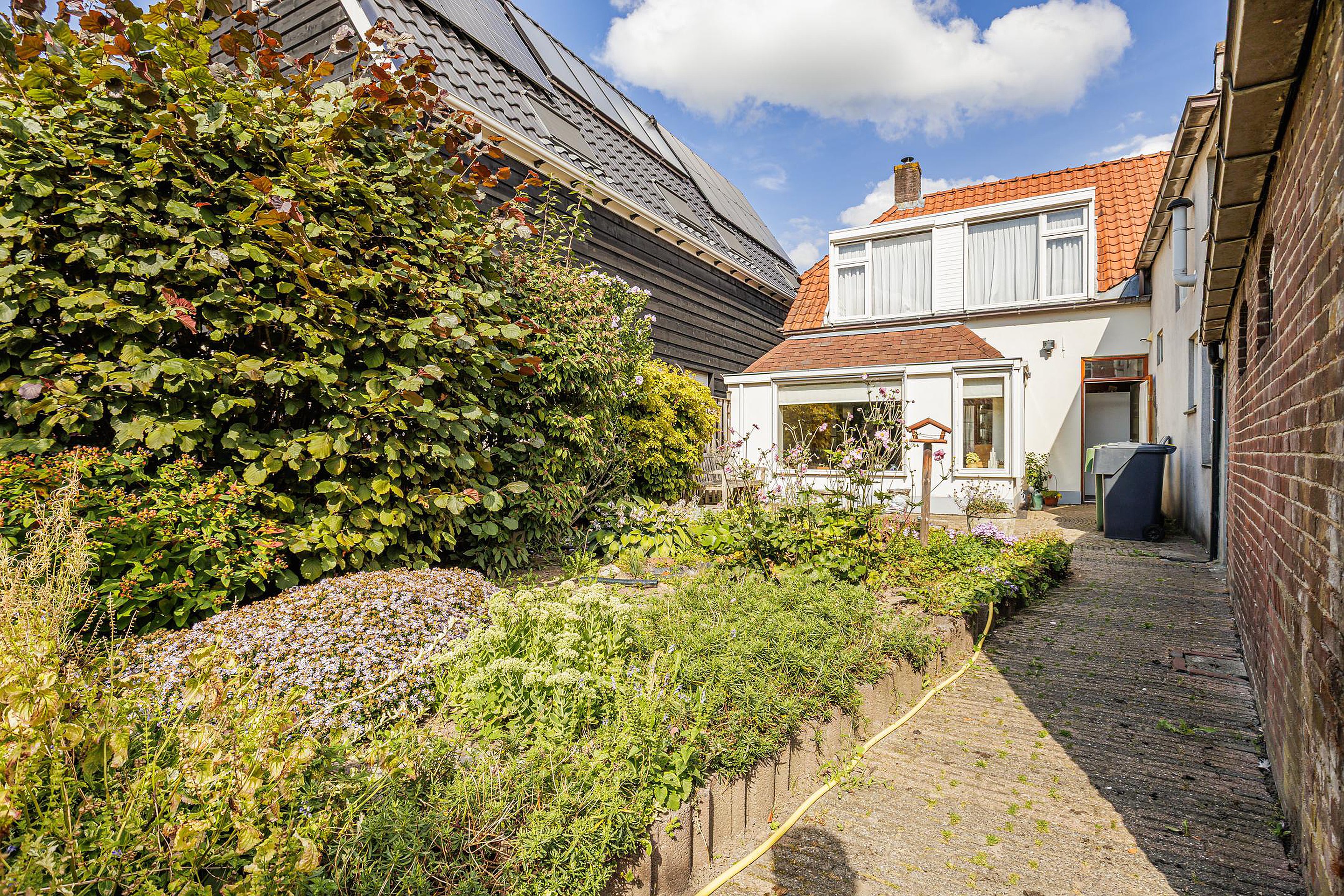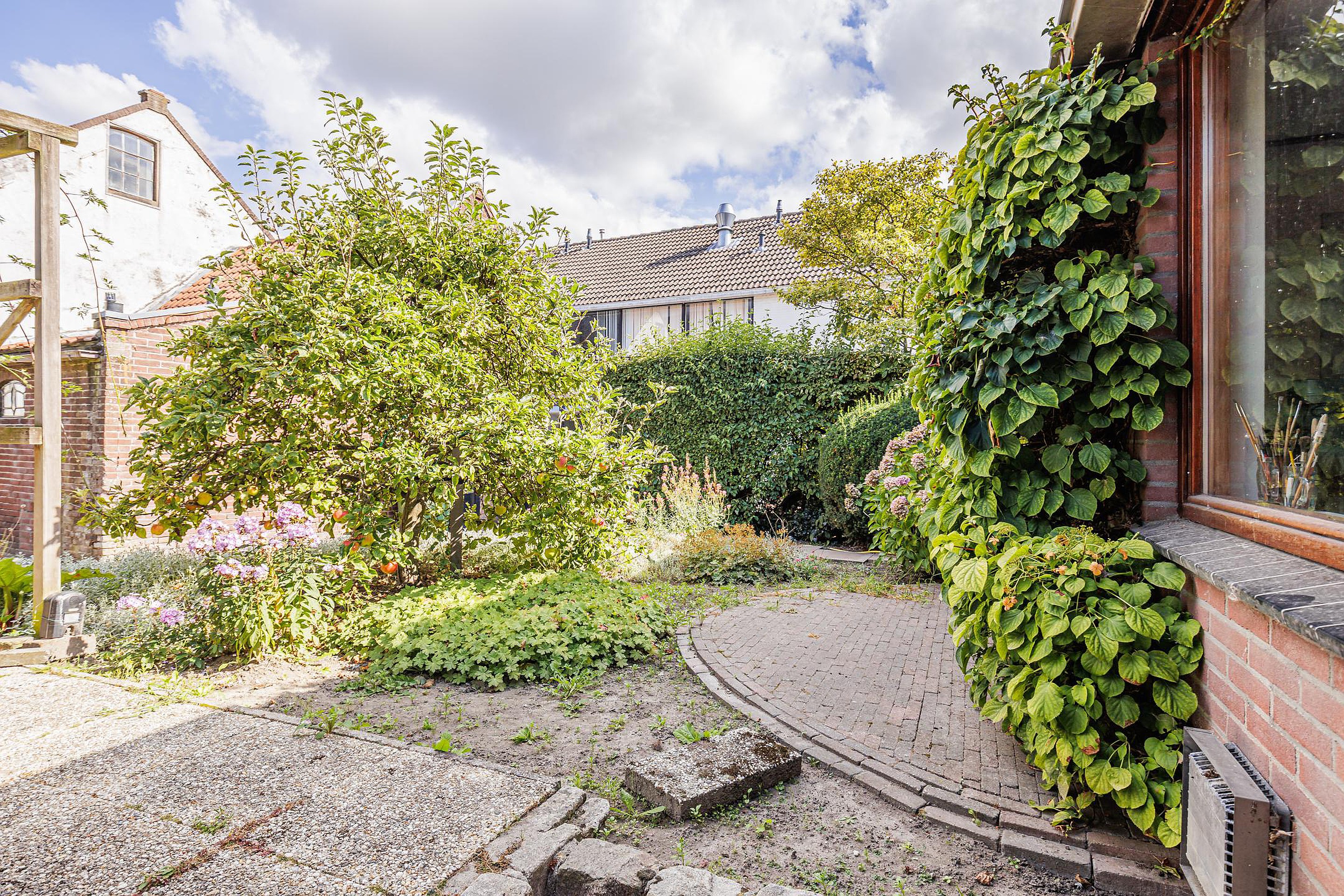 De achtertuin is gelegen op het westen en ingericht met verschillende zitjes waar je de hele dag door een plekje in de zon of schaduw kunt vinden. Achter op het perceel staat de ruime gemetselde garage/schuur met zadeldak, elektra en eigen aansluitingen – perfect voor hobby’s, klussen of opslag.