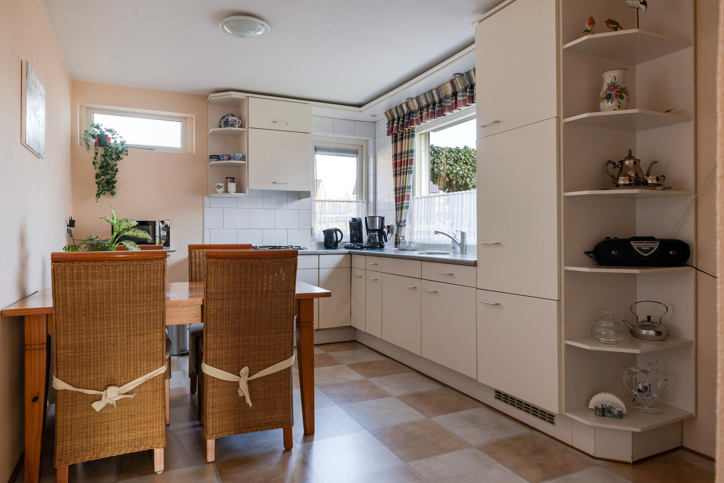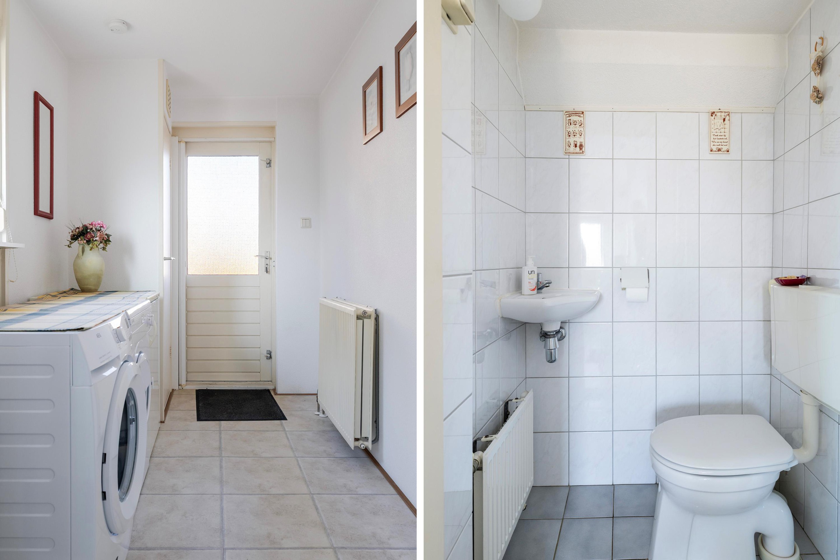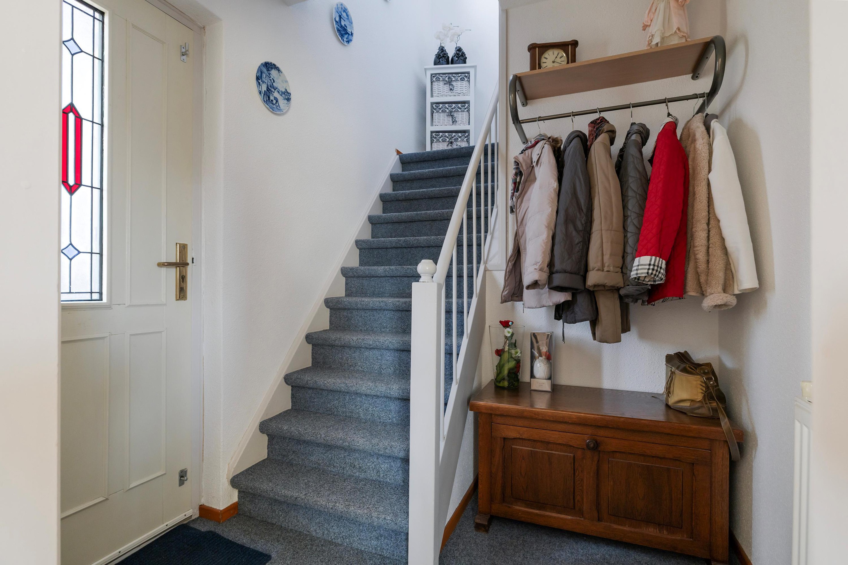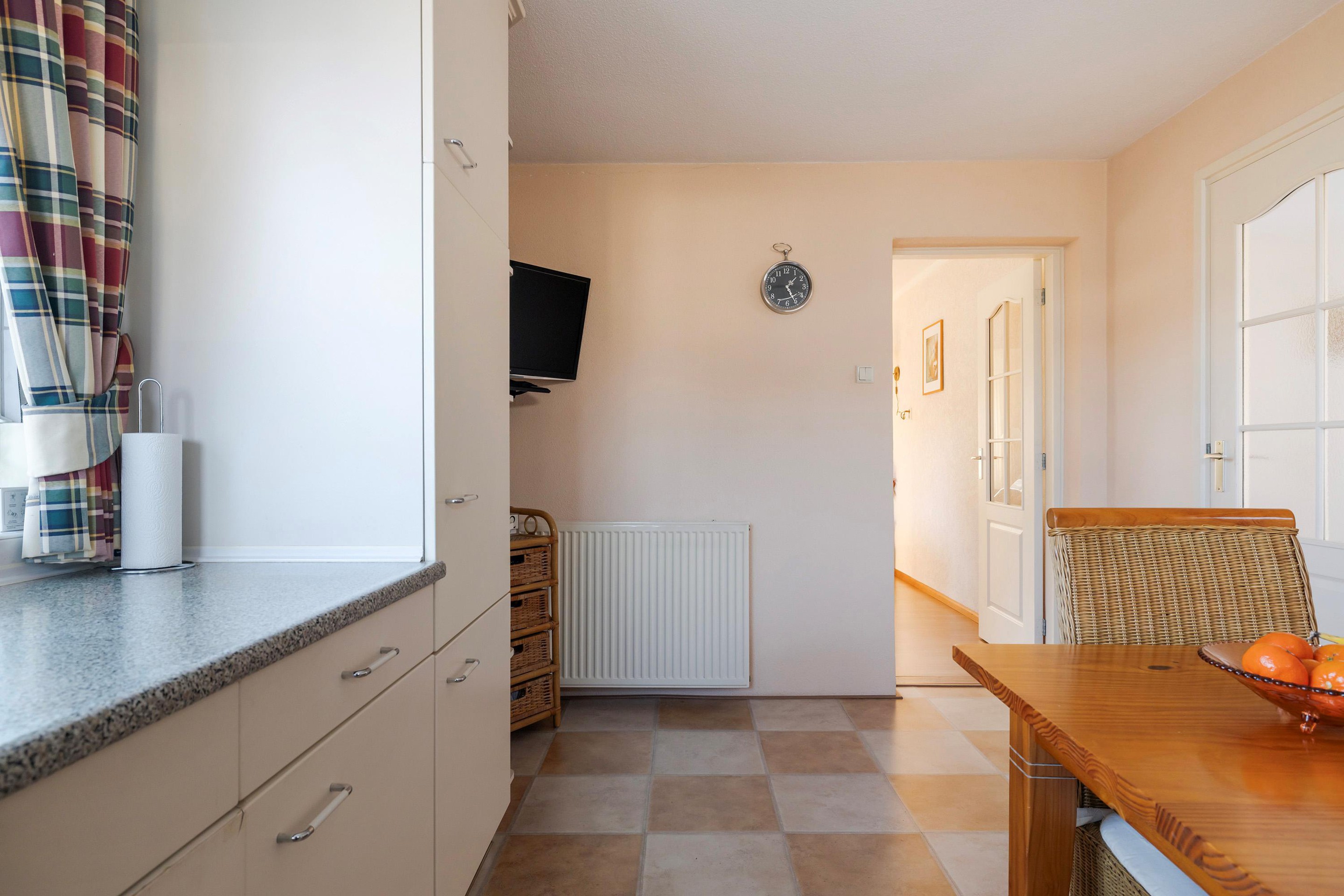 Hal met toilet en trapopgang, lichte woonkamer en eetkamer. De praktische keuken en de bijkeuken met cv-opstelling maken het geheel compleet.