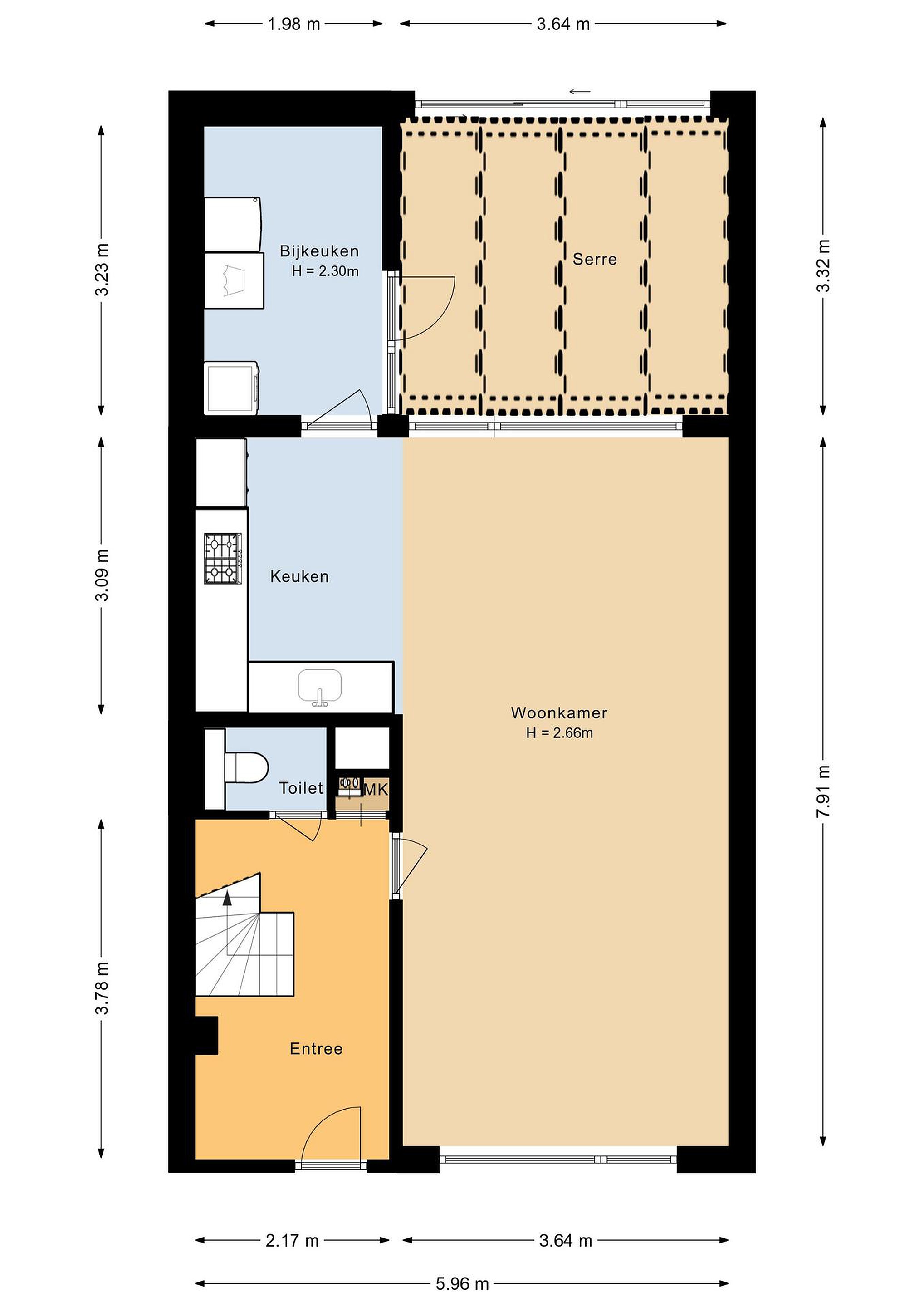 Begane grond Via de entree kom je in de hal met toilet, meterkast en trapopgang. De lichte en ruime woonkamer profiteert van extra zijramen dankzij de hoekligging, wat zorgt voor een prettige lichtinval.