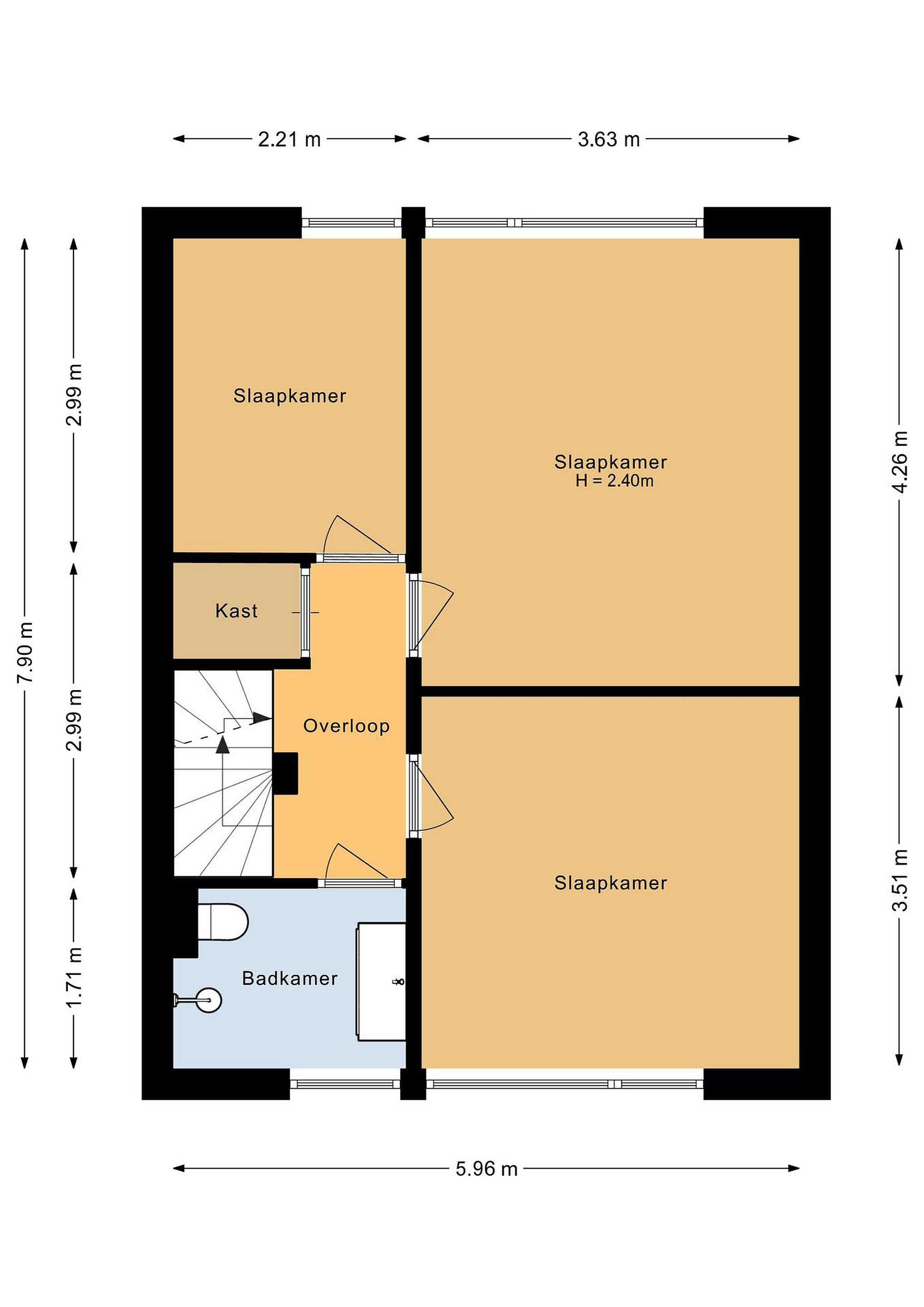 Eerste verdieping Op de eerste verdieping bevinden zich drie ruime slaapkamers en de badkamer.