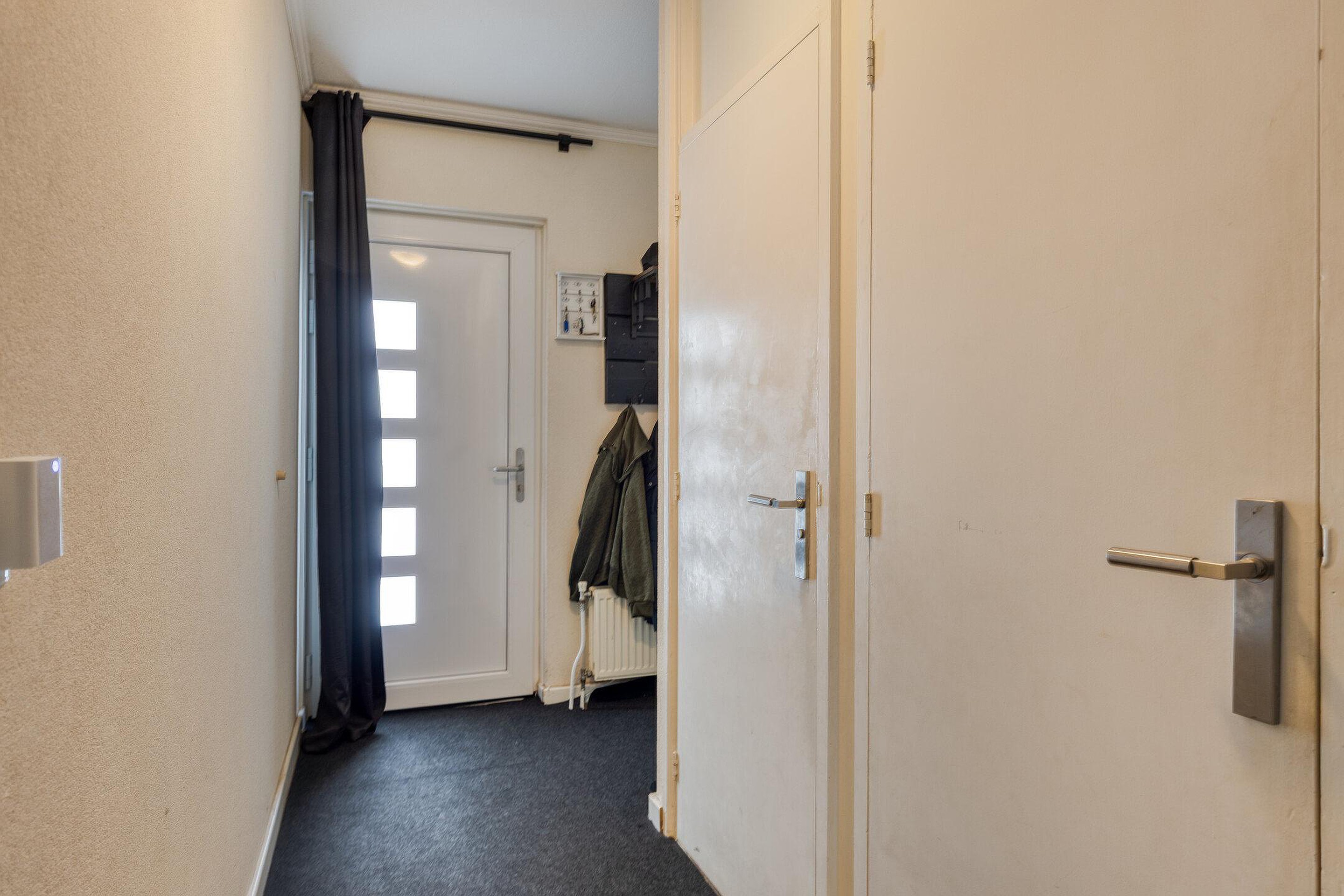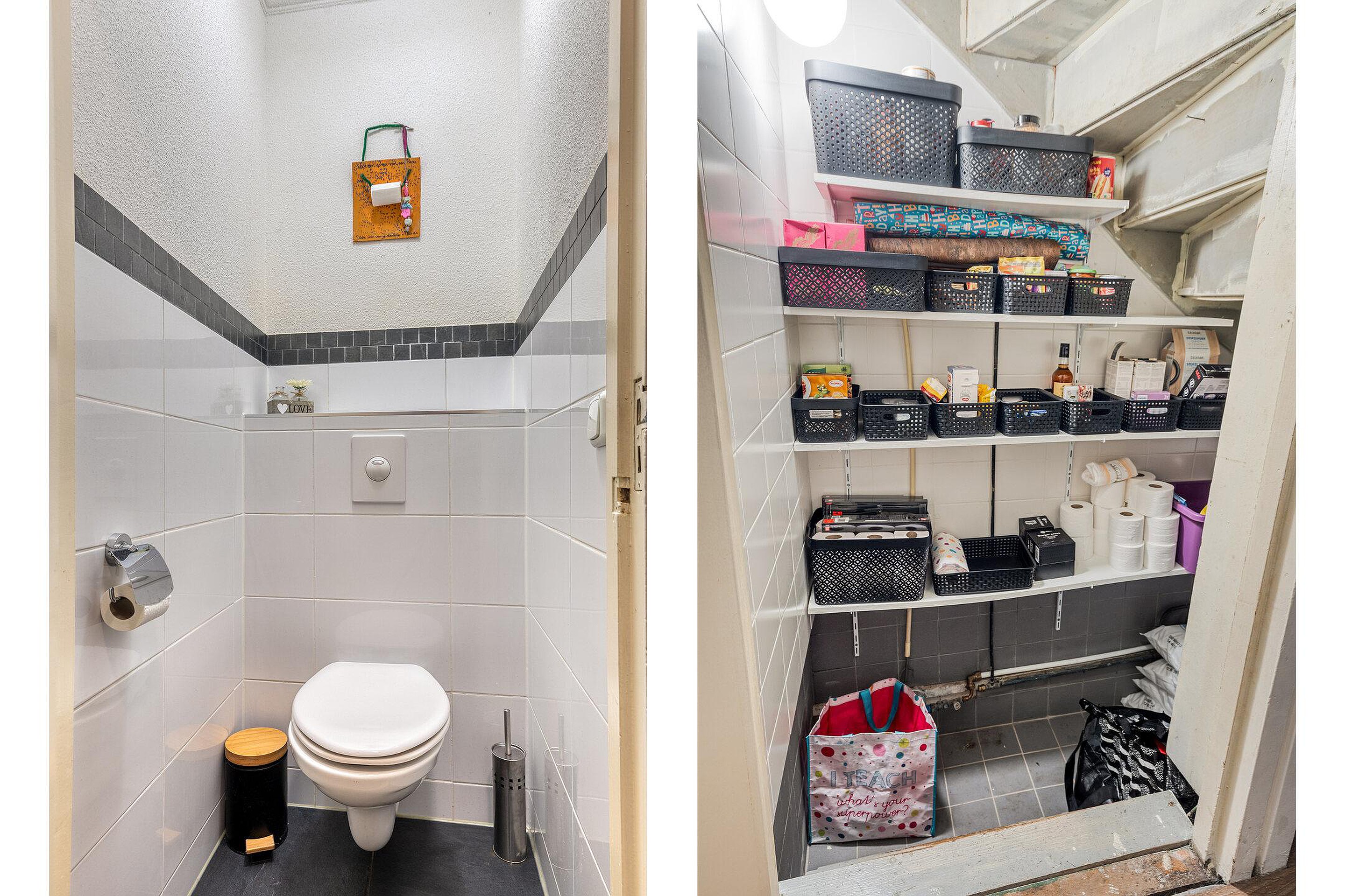 Via de hal zijn de meterkast, het toilet, de kelderkast, de trap en woonkamer bereikbaar.
