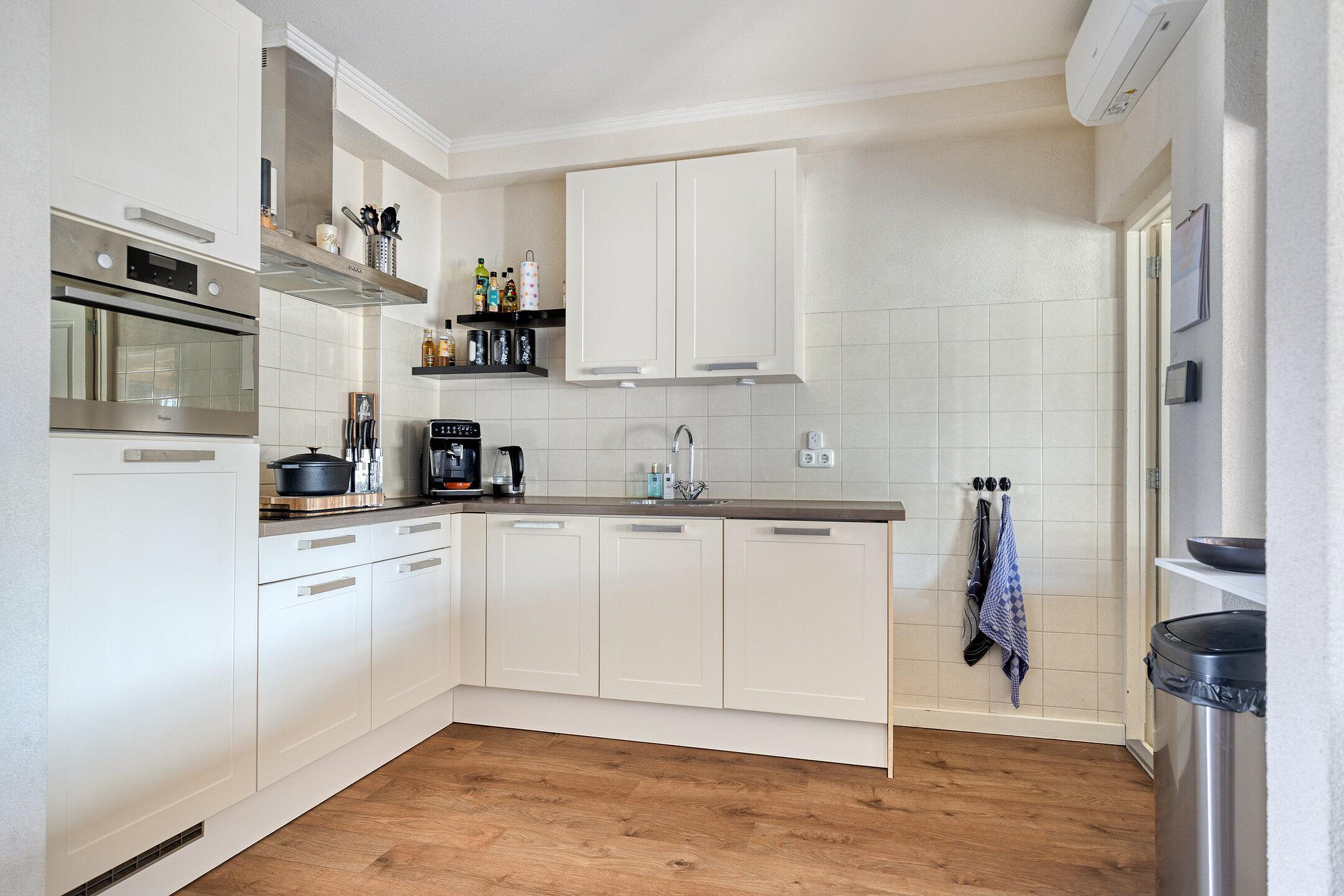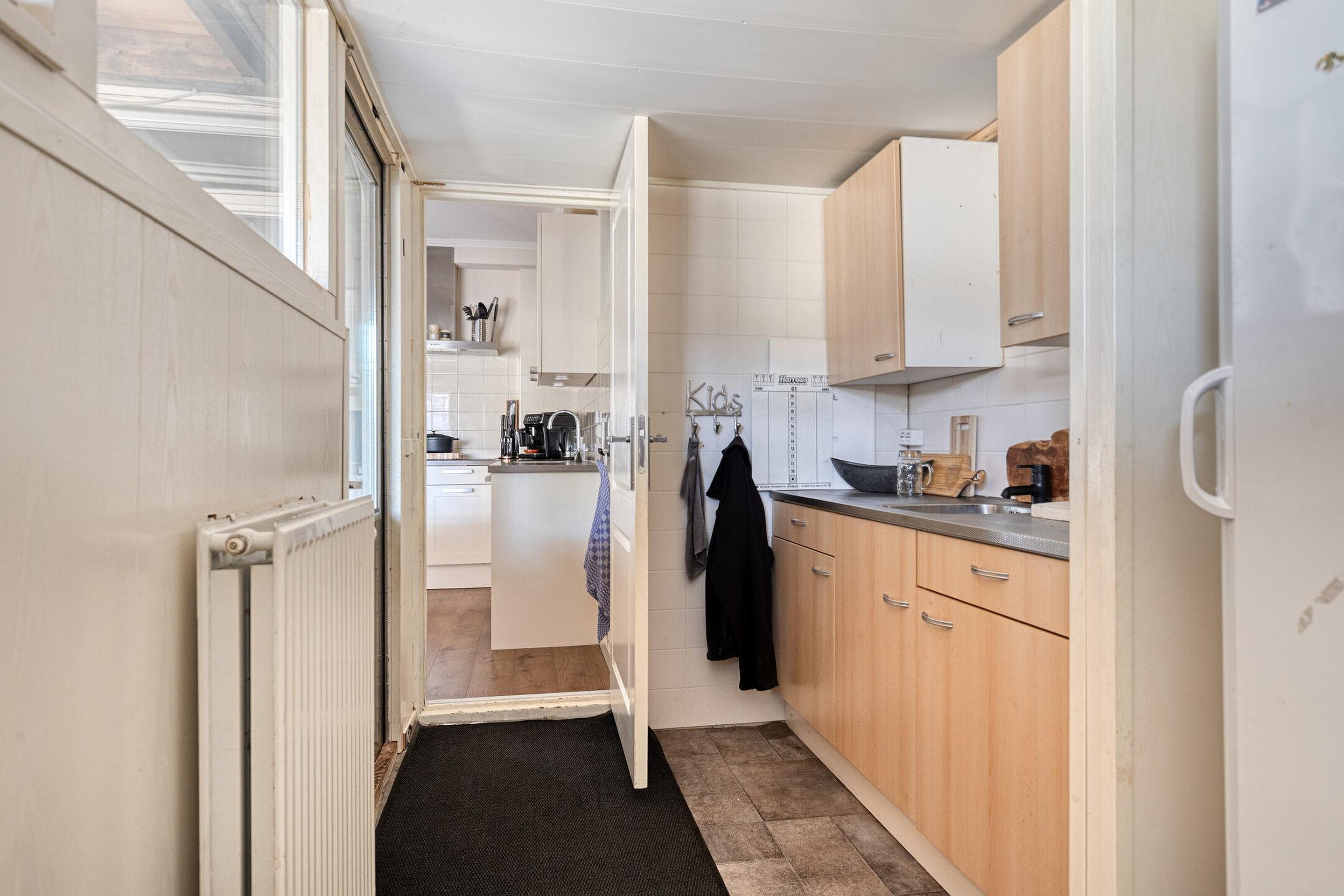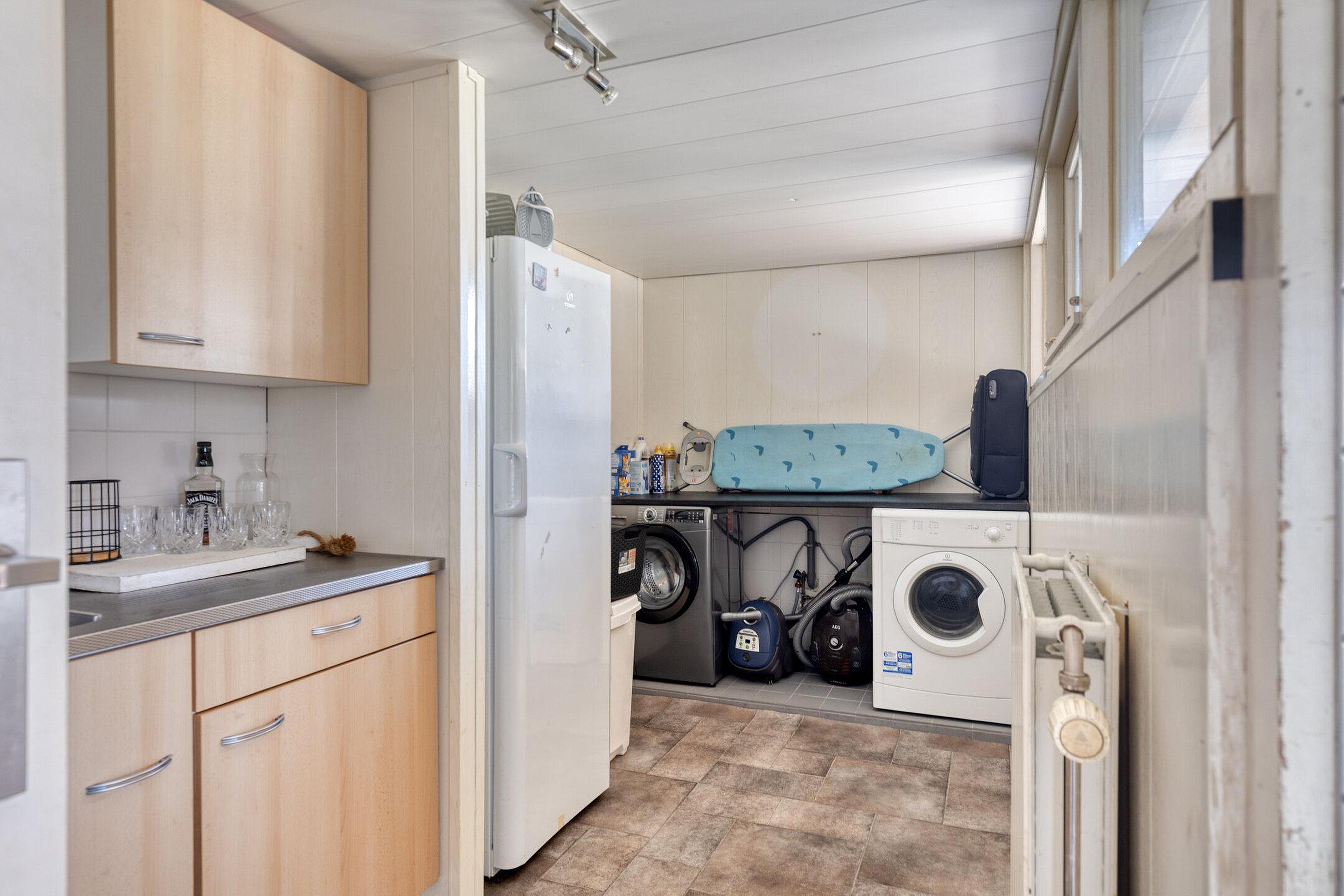 De woonkamer heeft veel lichtinval, een zit- en eethoek en vrij zicht naar de keuken. De keuken is voorzien van een nette hoekkeuken met diverse inbouwapparatuur. Een berging ontbreekt uiteraard niet. Hier zijn de aansluitingen voor de was- en droogmachine gemaakt. Tevens is de serre via de berging bereikbaar. De serre is voorzien van een glazen schuifwand, waardoor je optimaal zicht op de tuin hebt.