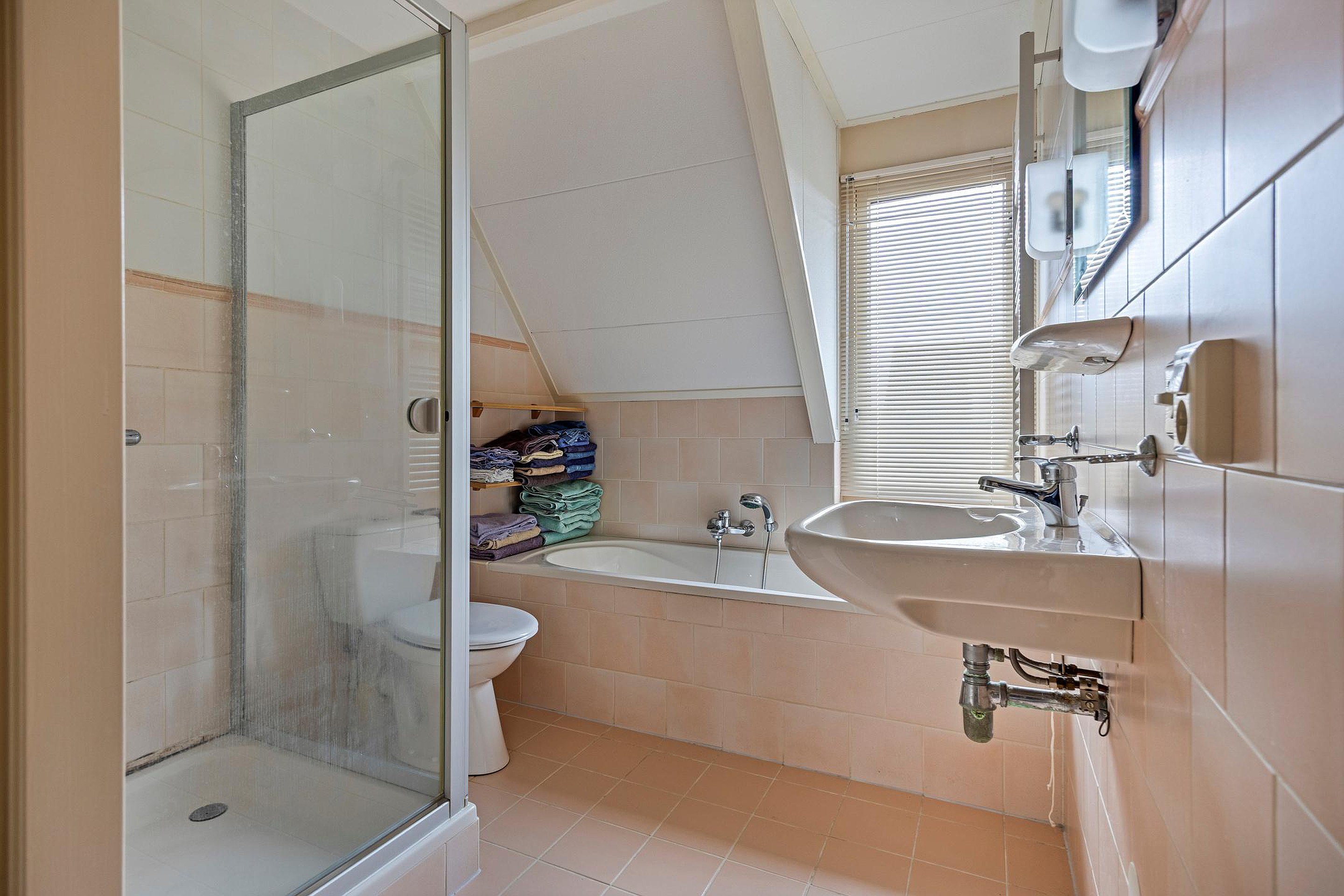 De badkamer is comfortabel ingericht met een ligbad, douche, toilet en wastafel.