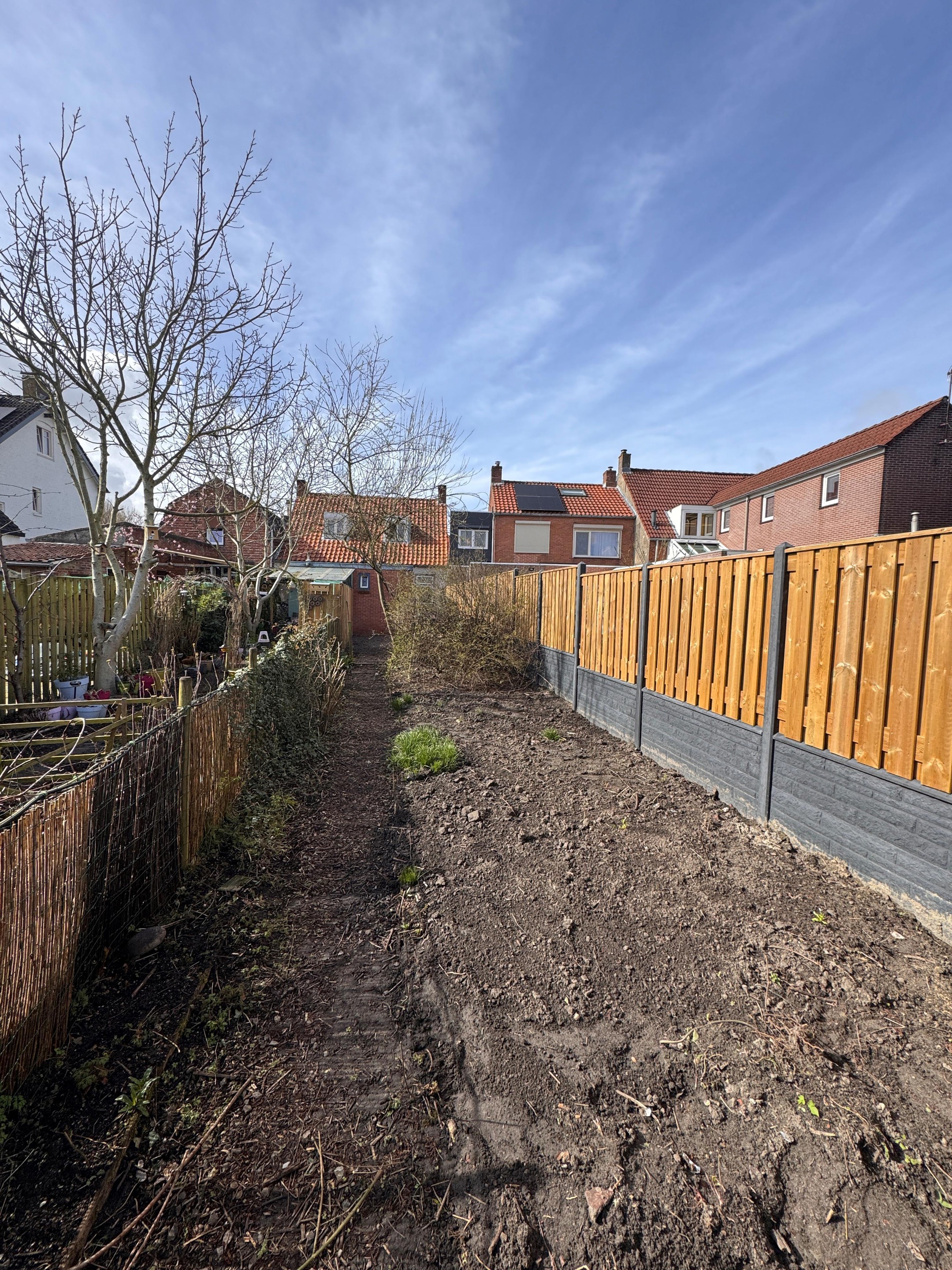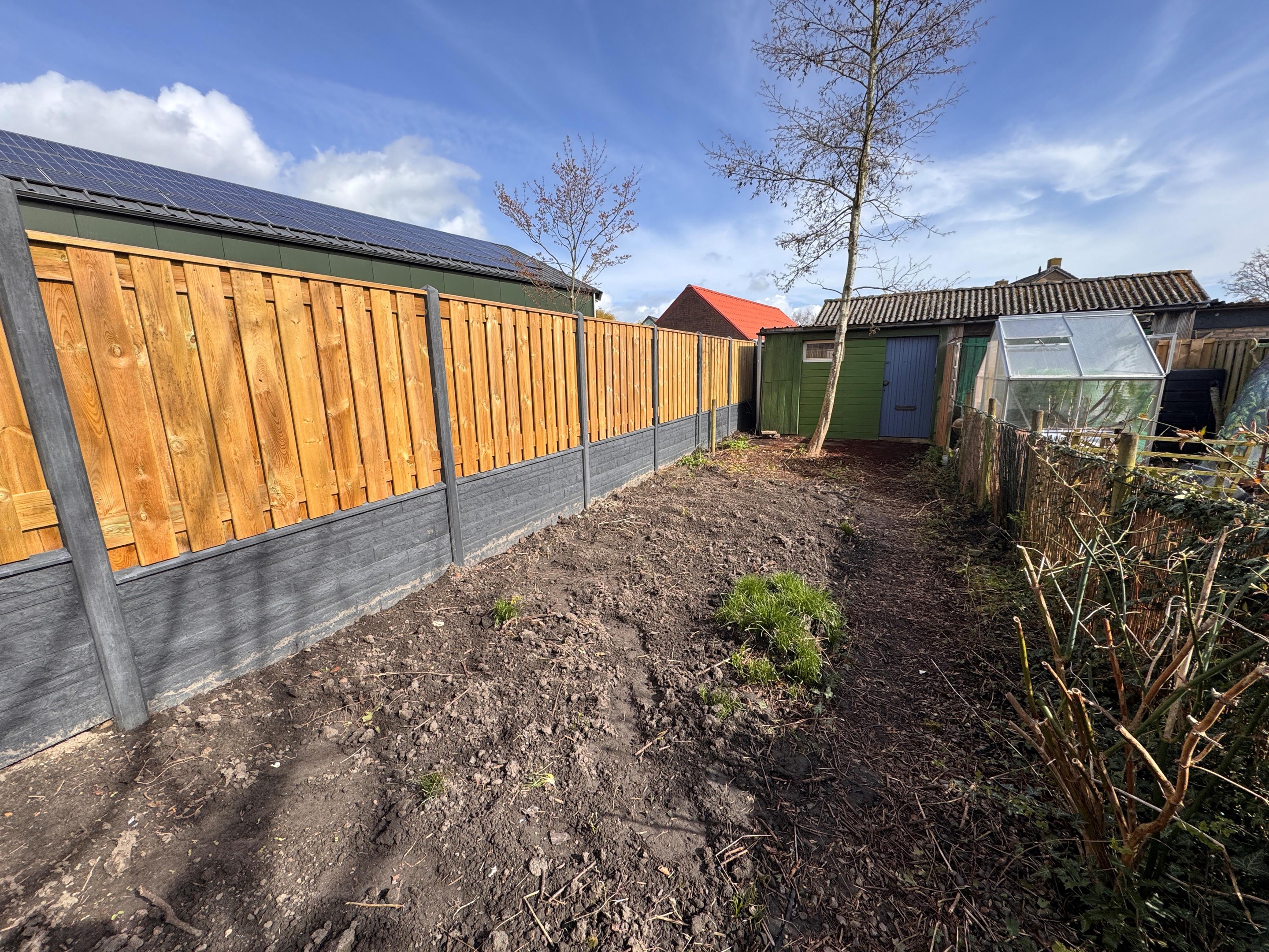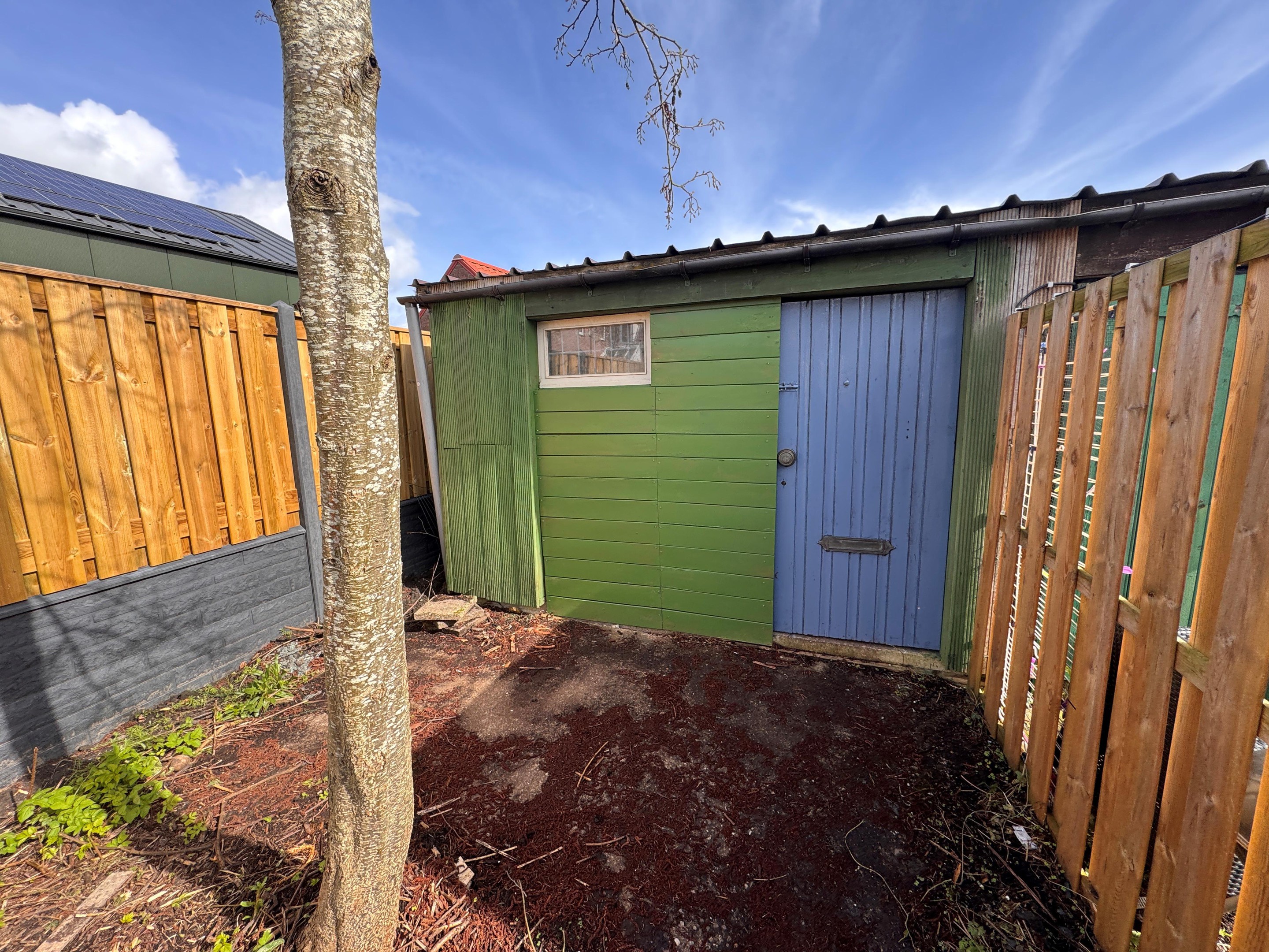 Diepe achtertuin met berging