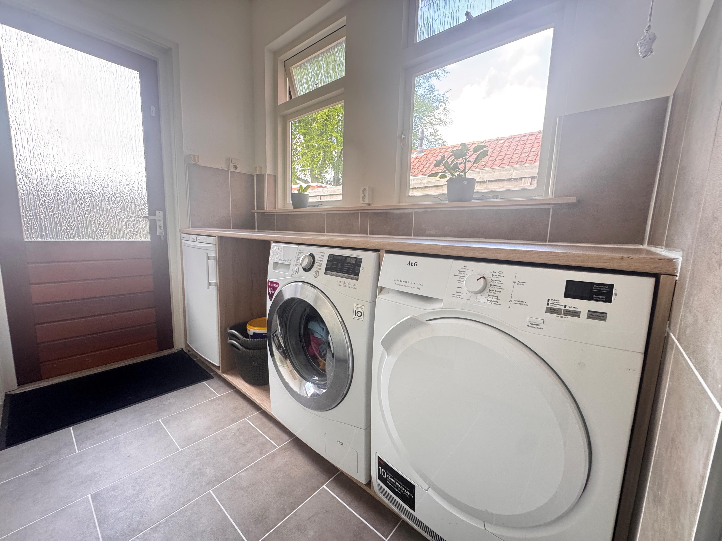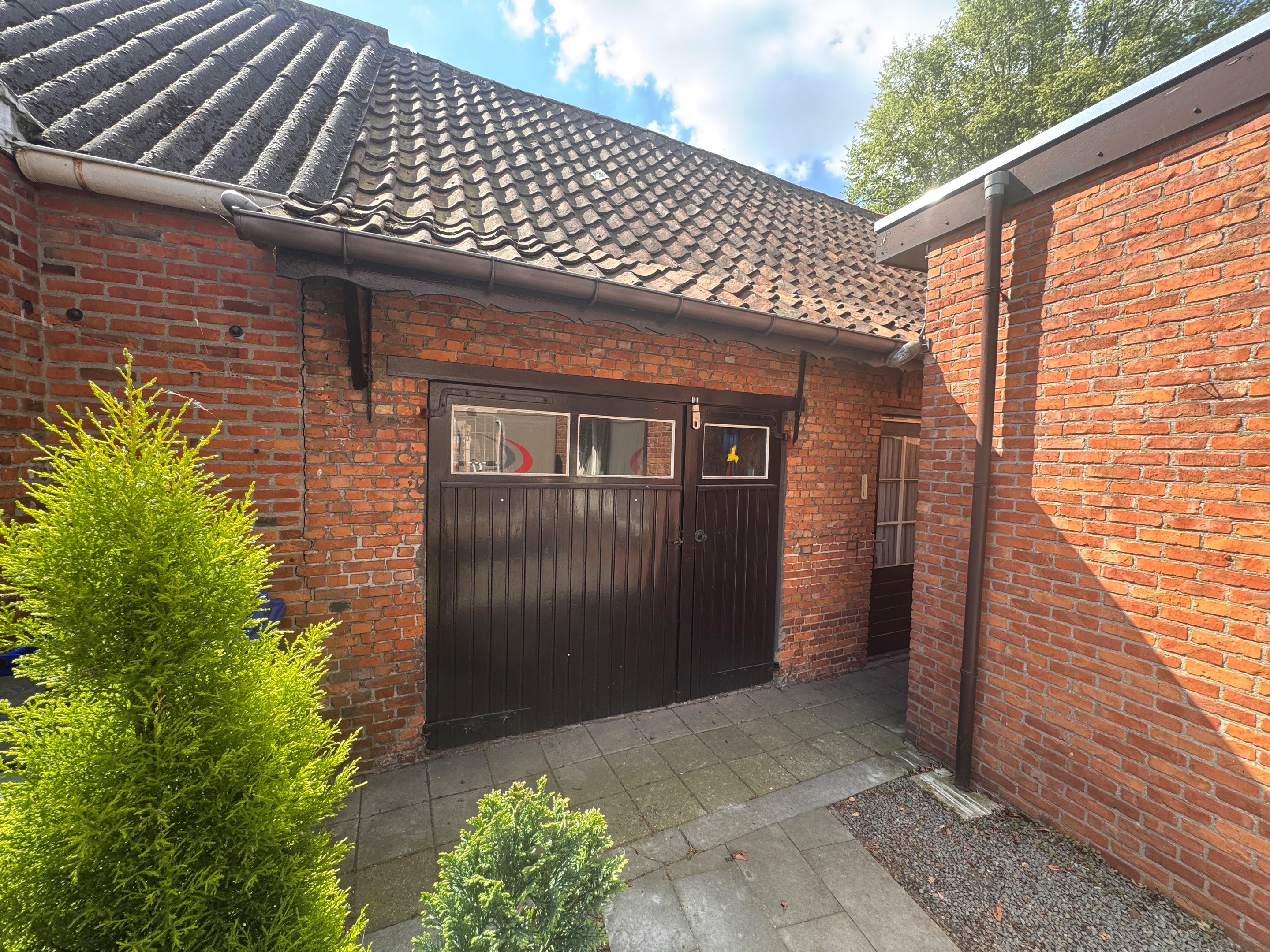 De onderhoudsvriendelijke tuin ligt op het zuidwesten — dus lekker zonnig van 's middags tot 's avonds. De grote vrijstaande schuur is verdeeld in drie ruimten: een berging met cv-ketel 2023, bergruimte en een ruime garage met kelder, vliering én oprit voor twee auto's (of een camper). Alles afsluitbaar met een ijzeren hek.