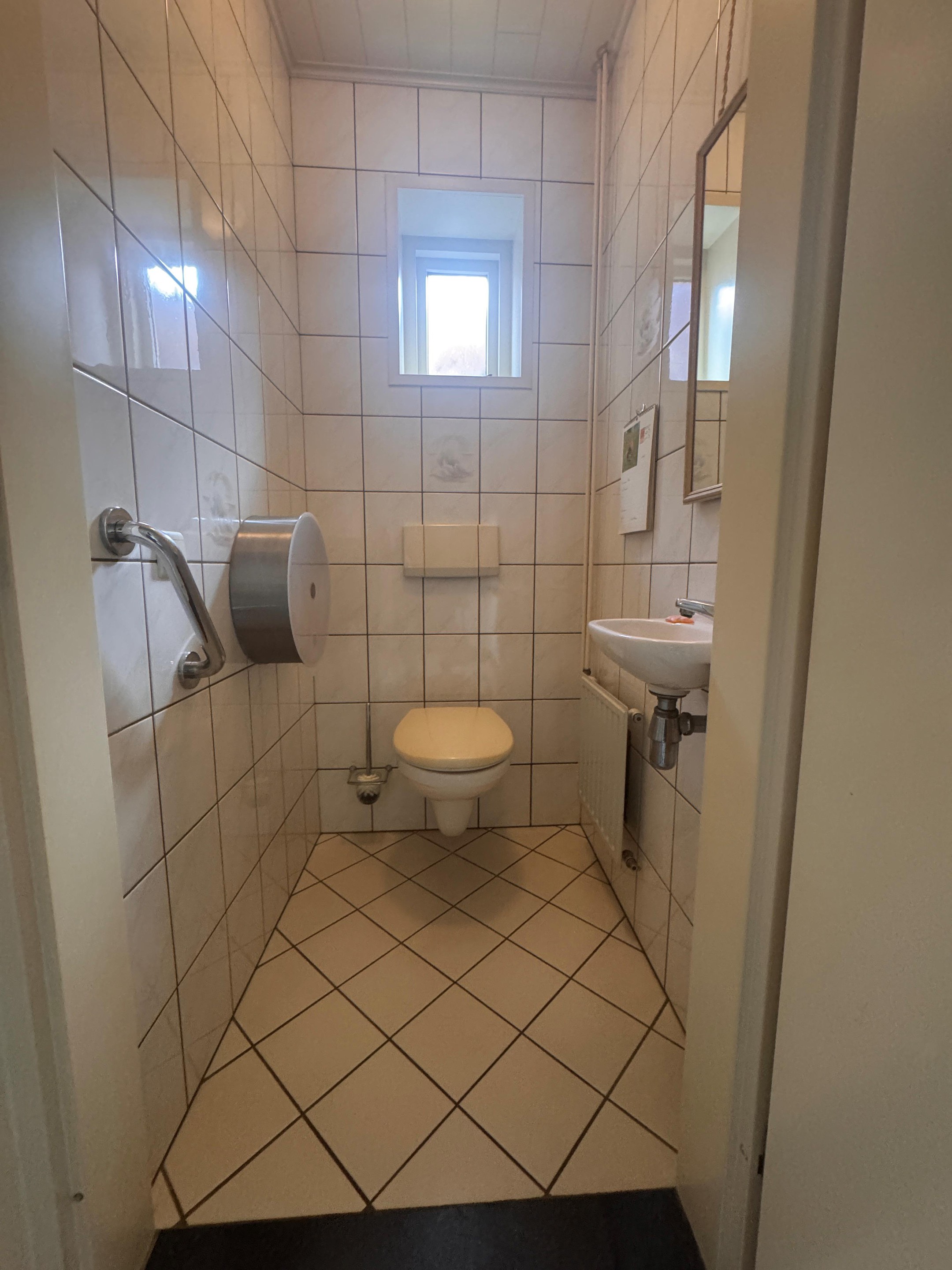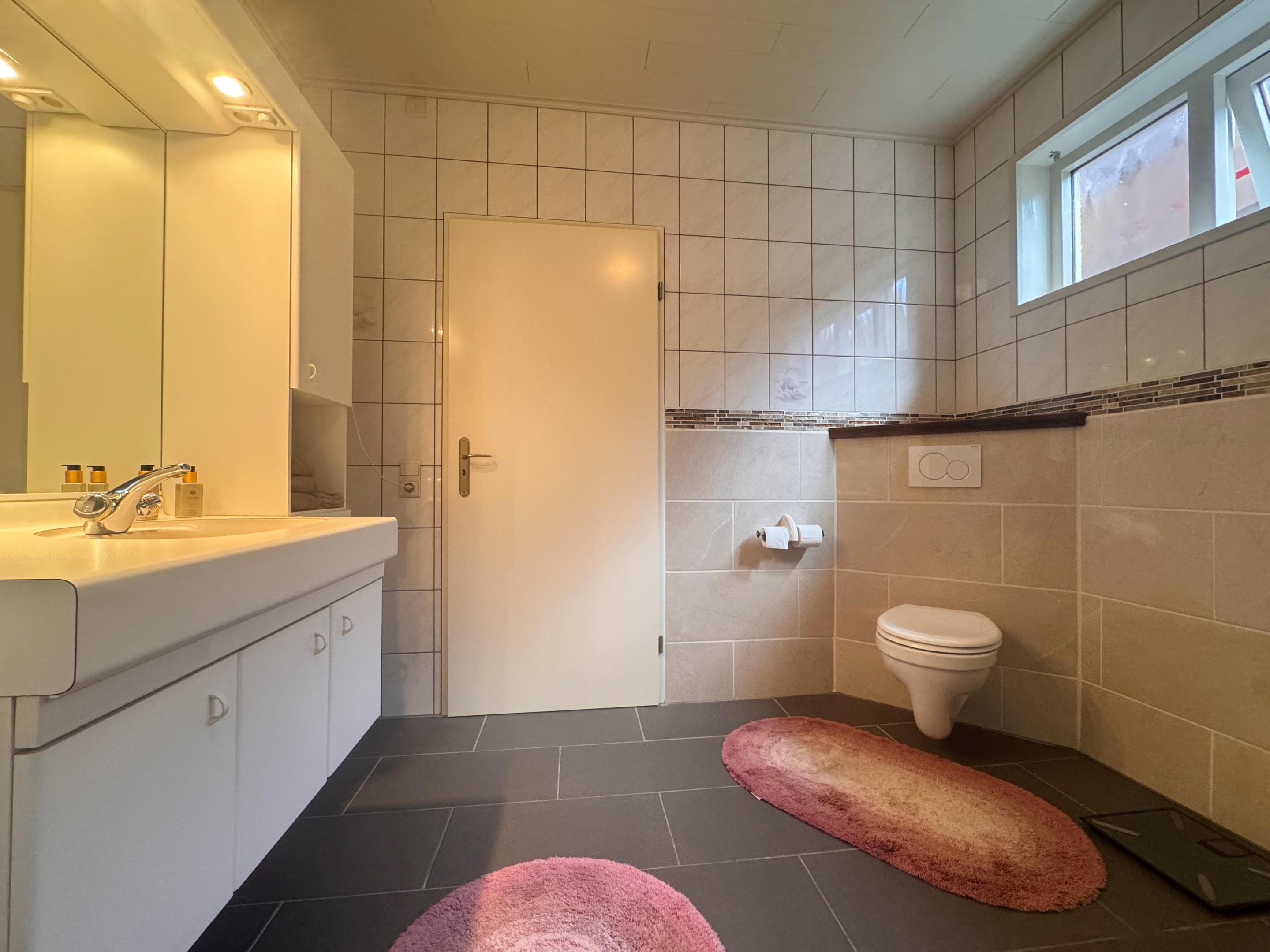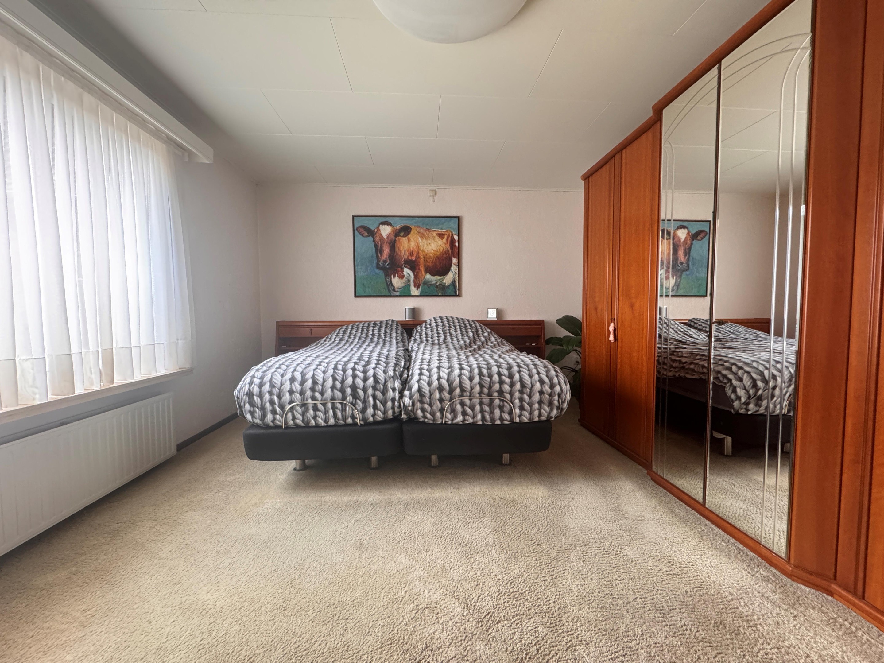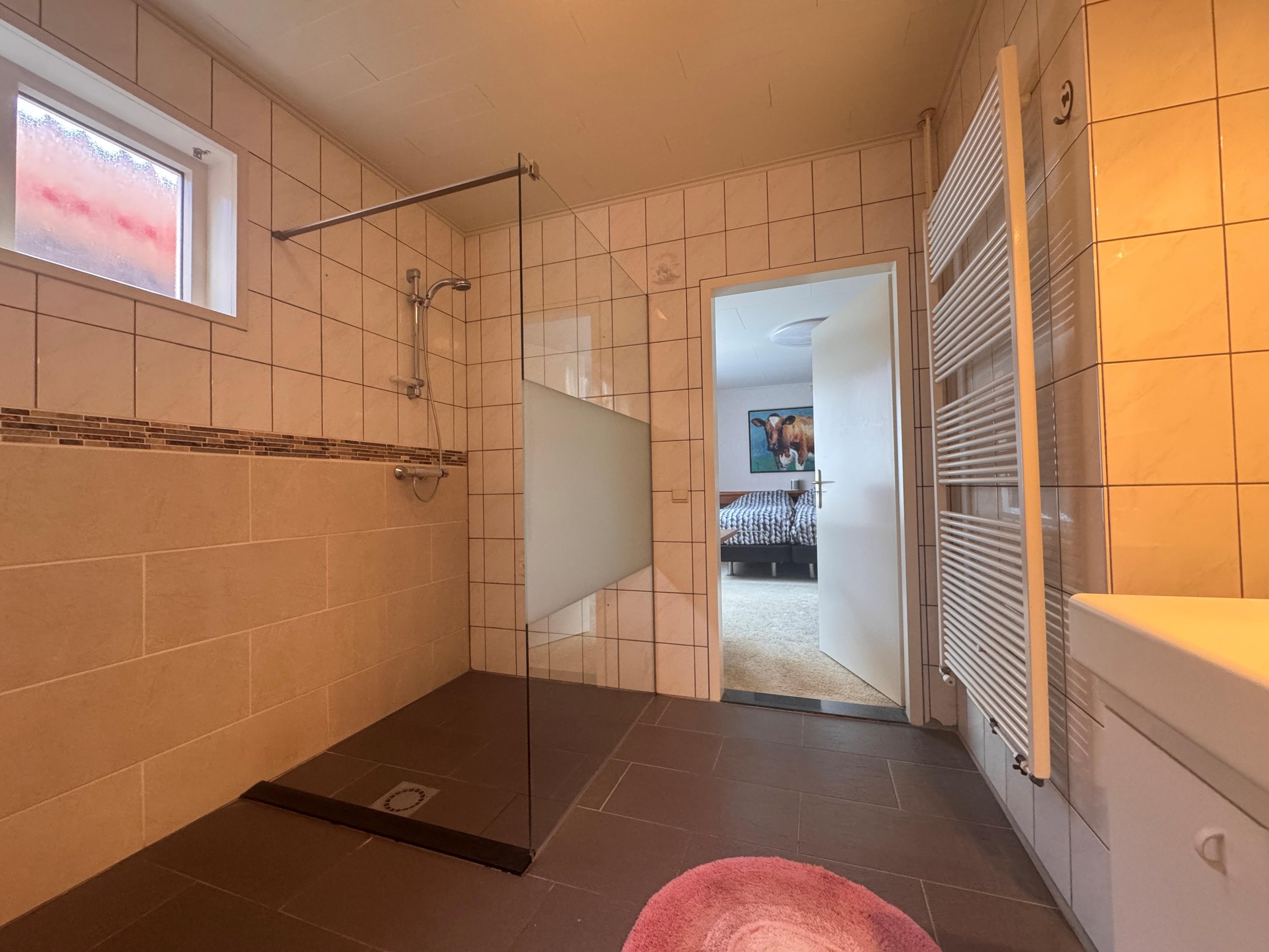 Met een ruime slaapkamer én een complete badkamer op de begane grond is deze woning volledig levensloopbestendig. De badkamer beschikt een inloopdouche, toilet en wastafelmeubel. Vanuit de slaapkamer loop je zo weer terug naar de hal — de hele benedenverdieping is rondom bereikbaar.