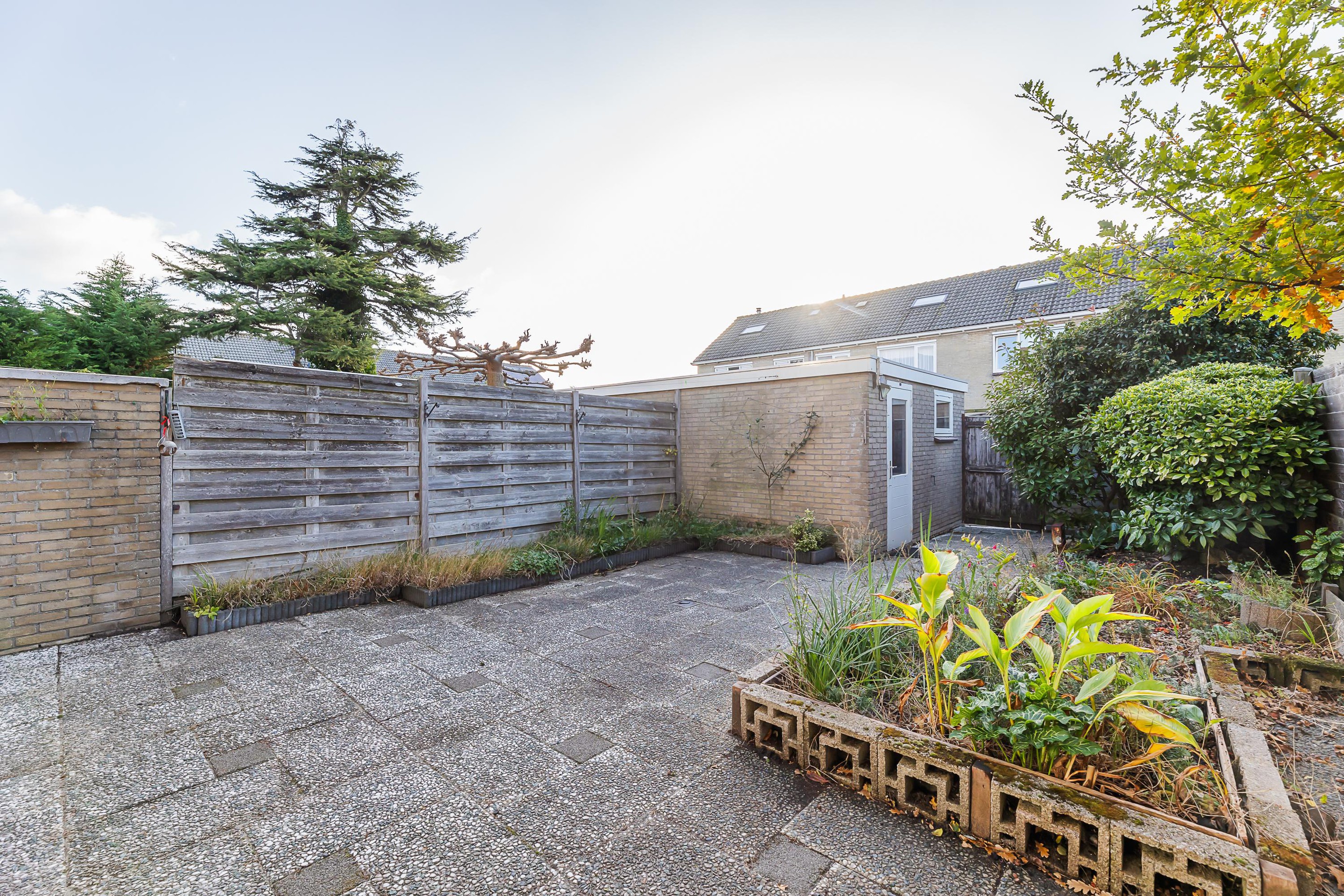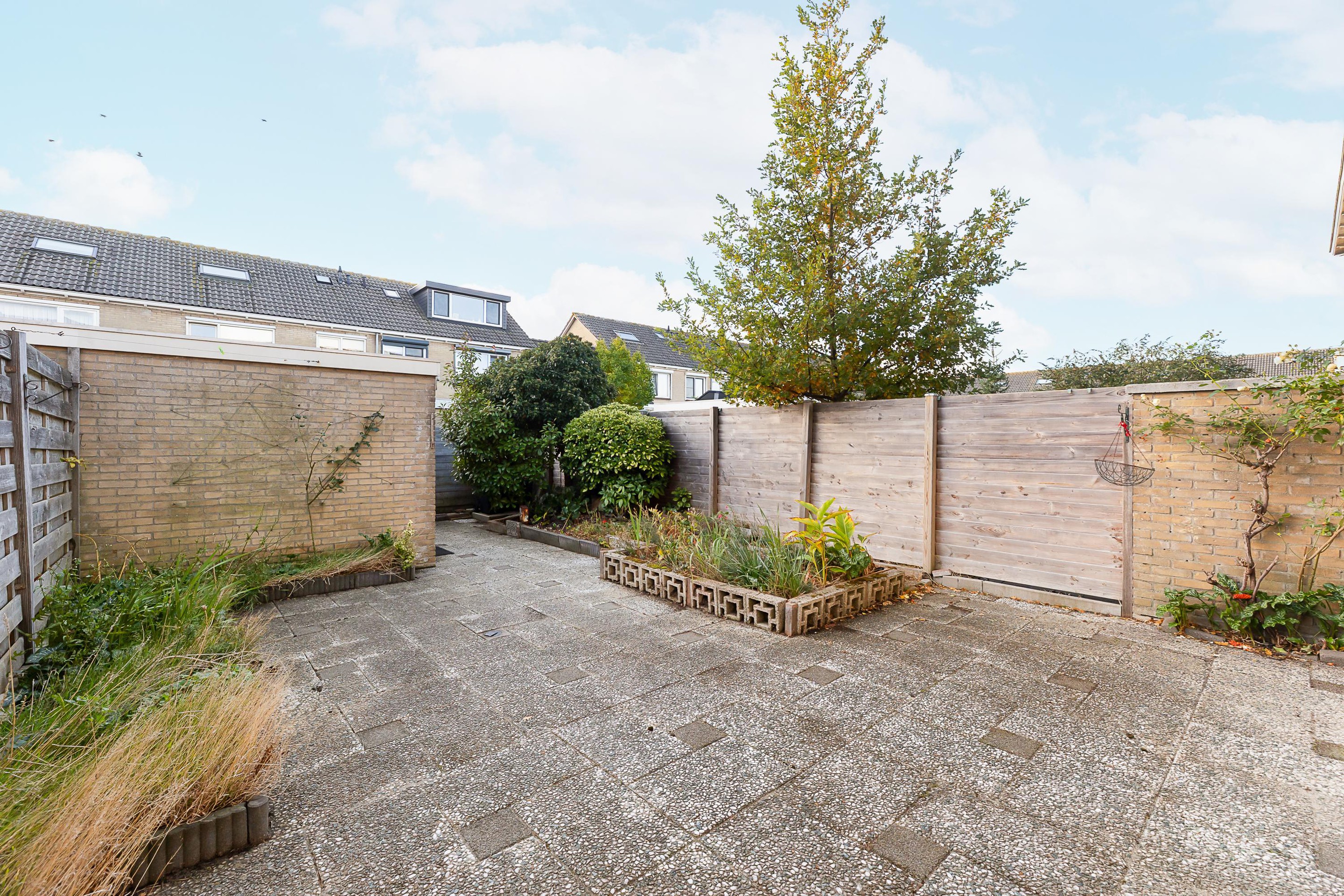 Betegelde tuin voorzien van borders met vaste planten. De fietsenberging en vrije achterom maken het geheel compleet.
