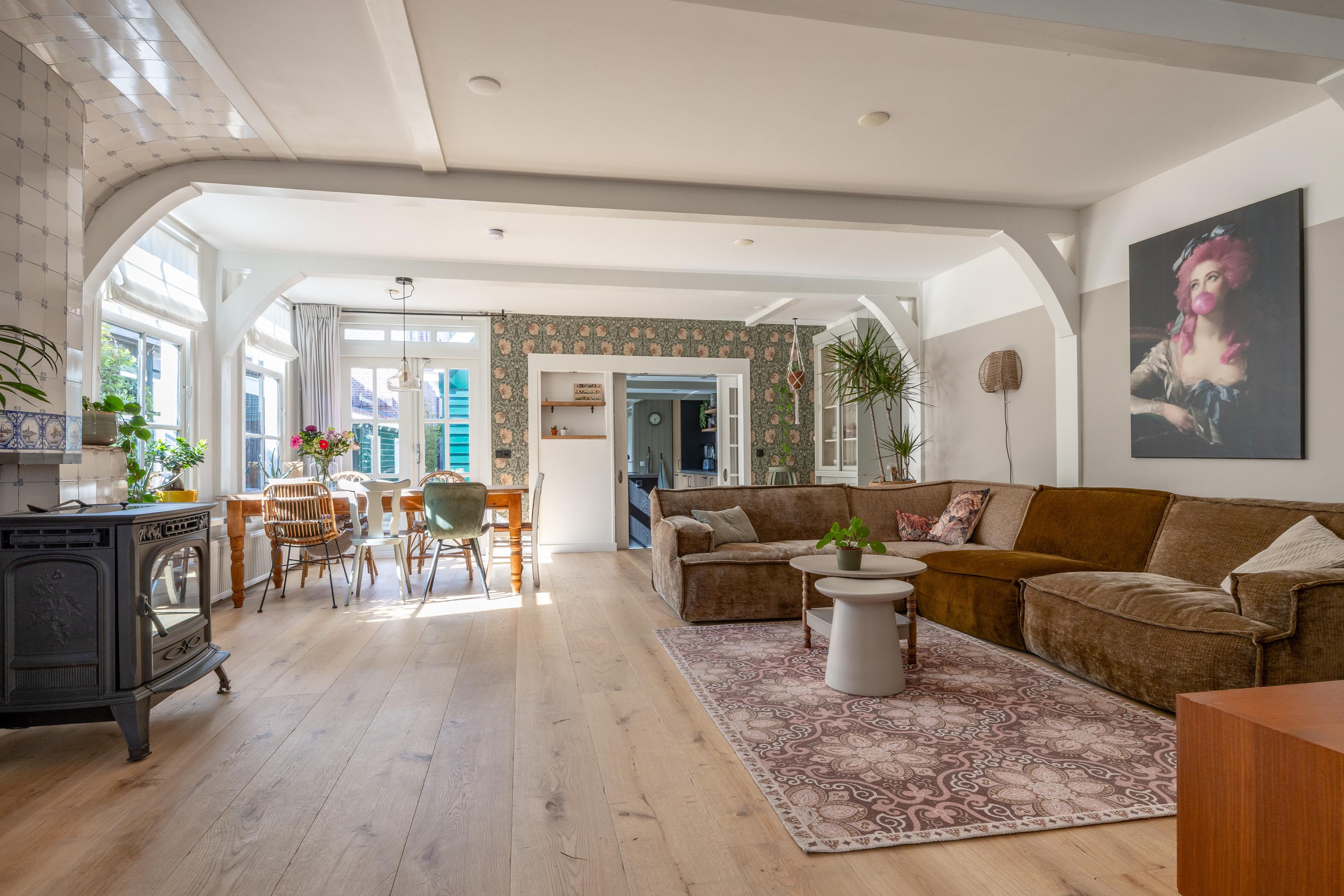 The bright living room, with a wooden floor, offers plenty of opportunities to create different living areas. Cozy gatherings around the monumental "smuiger" (Zaanse fireplace) with a pellet stove give the room exactly the ambiance you're looking for: warmth, space, and coziness.