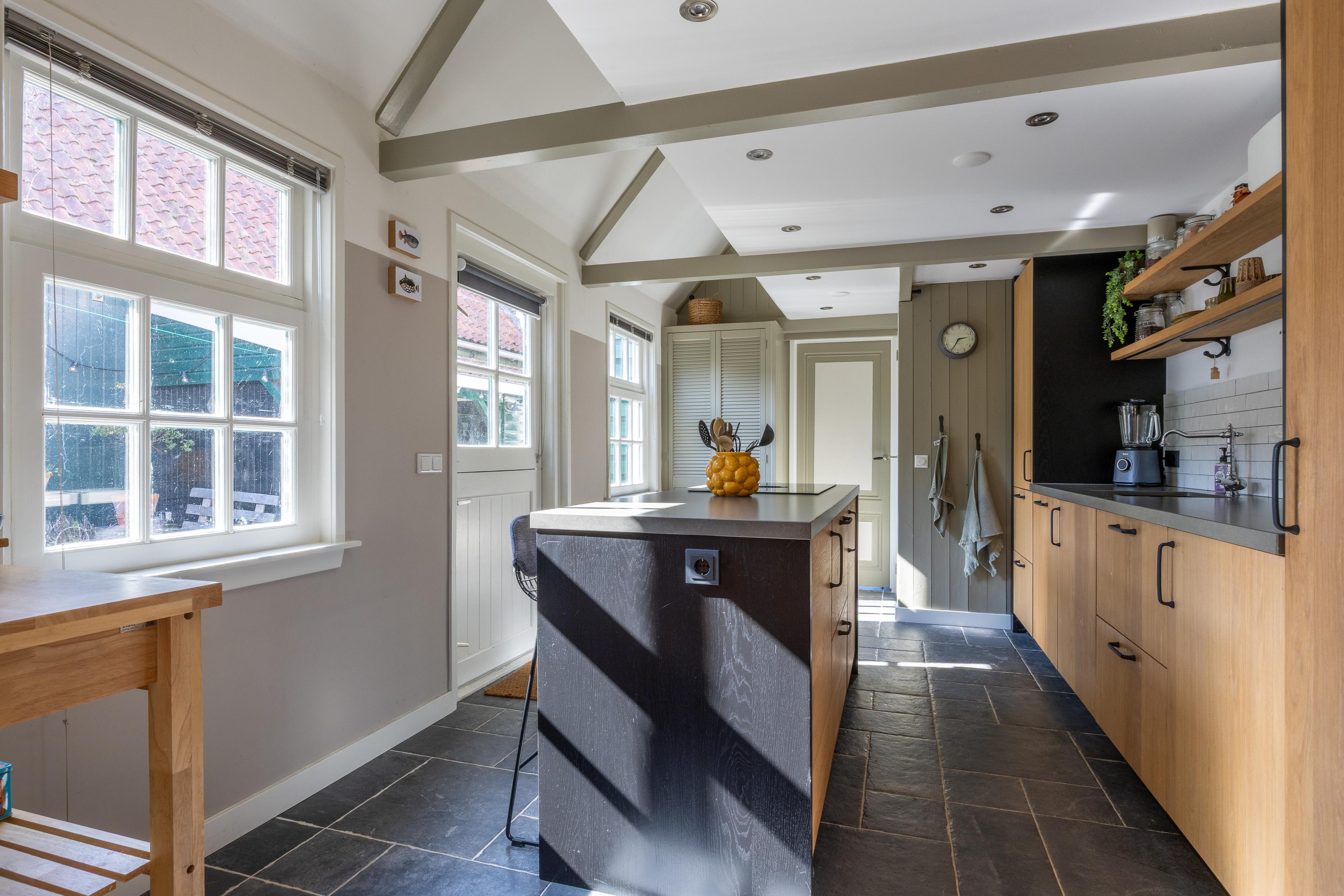 Aansluitend vind je de moderne keuken met kookeiland, volledig uitgerust met een vaatwasser, koelkast met vriezer, combi-oven en een royale 6-pits inductieplaat met geïntegreerde afzuiging. Ook vanuit de keuken heb je toegang tot de tuin.