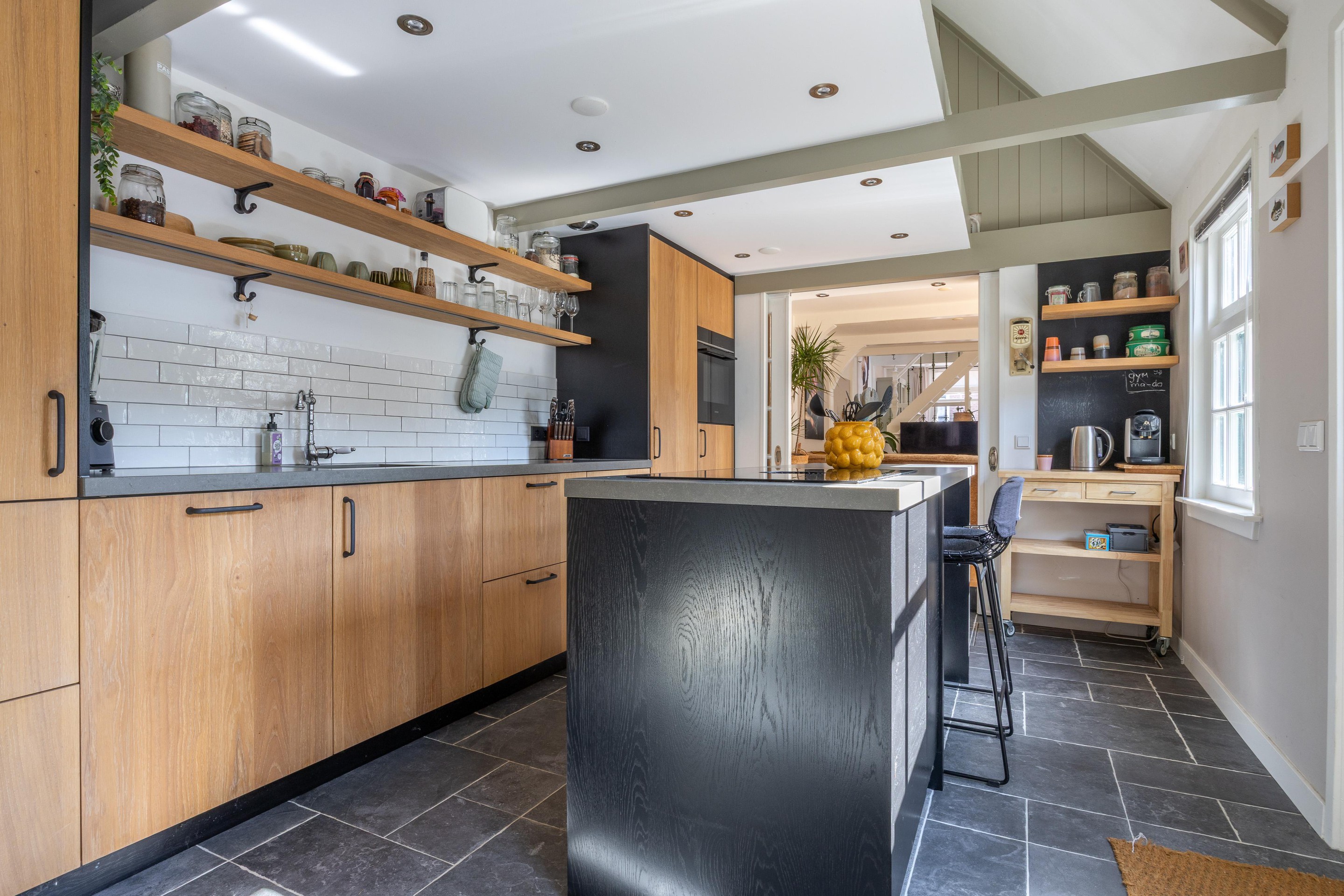 De lichte woonkamer, voorzien van een houten vloer, biedt volop mogelijkheden om verschillende leefhoeken te creëren. Gezellig samenzitten bij de monumentale smuiger (Zaanse schouw) met pelletkachel geeft de ruimte precies de sfeer die je zoekt: warmte, ruimte en gezelligheid.