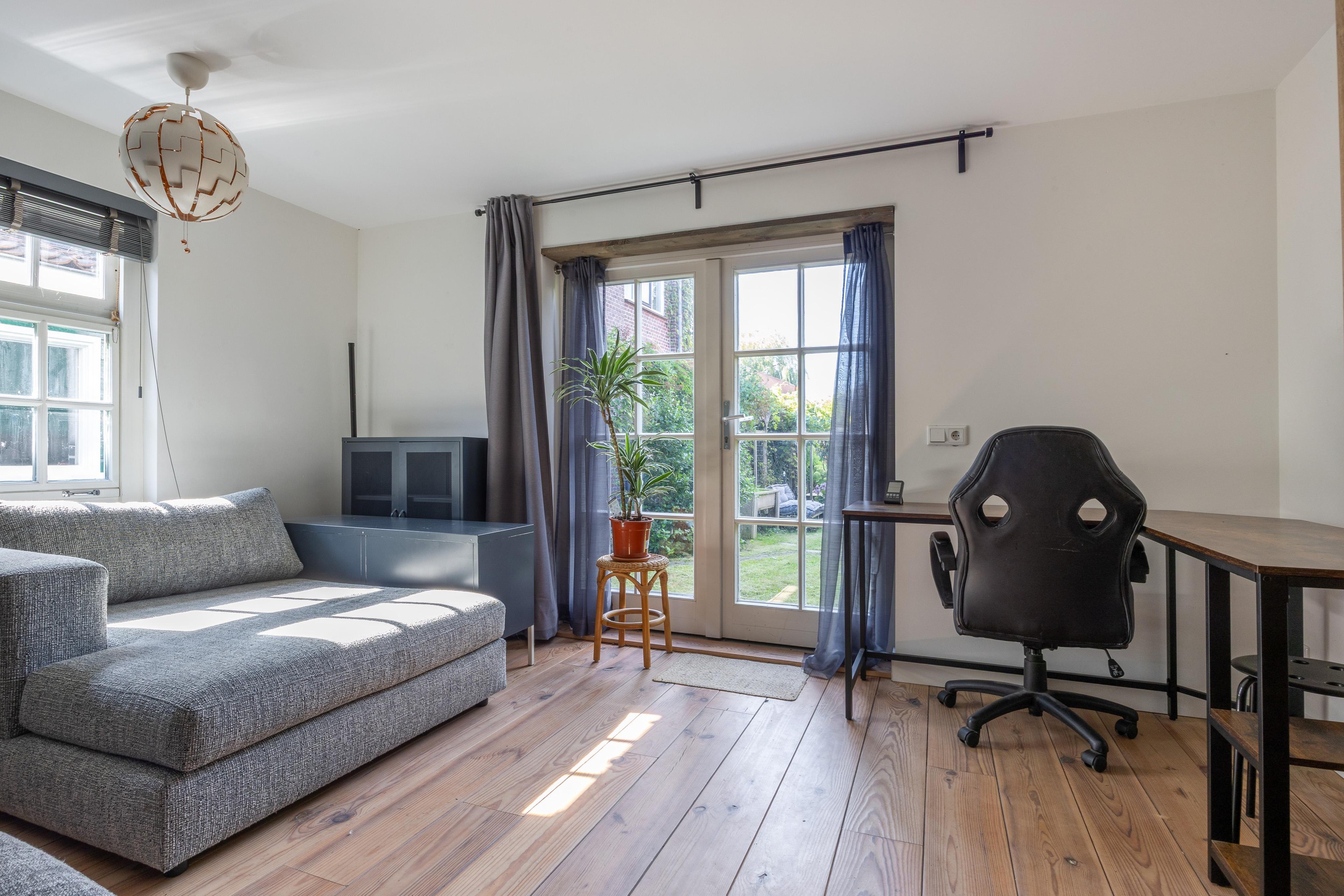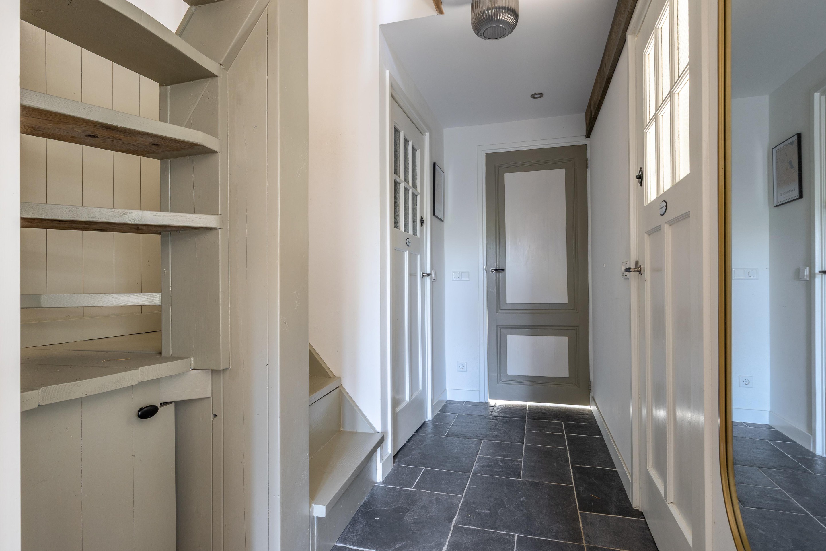 De open trap (met daaronder een kleine kelder) naar de eerste verdieping neemt een prominente maar stijlvolle plek in. Via de openslaande deuren loop je direct de tuin in.