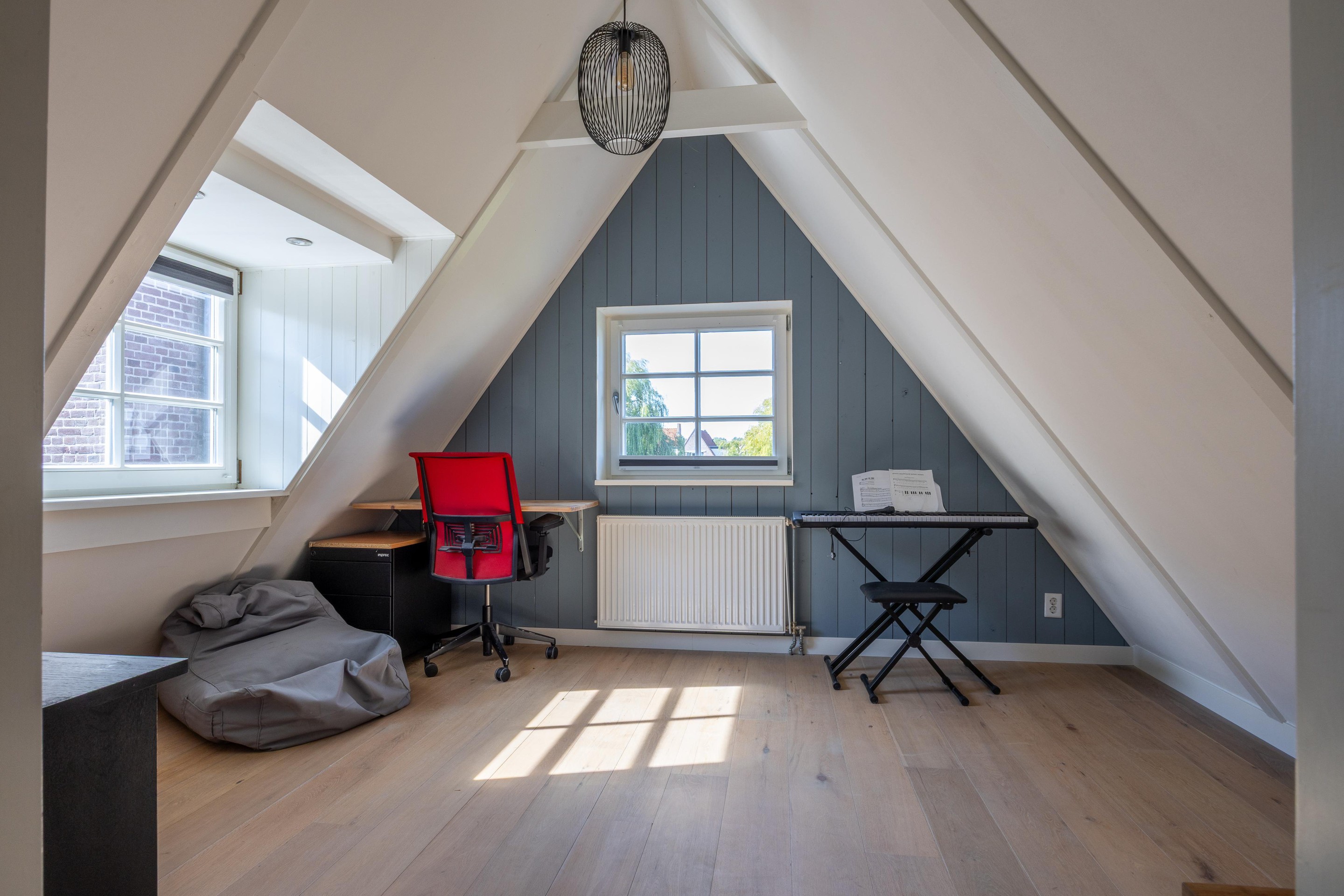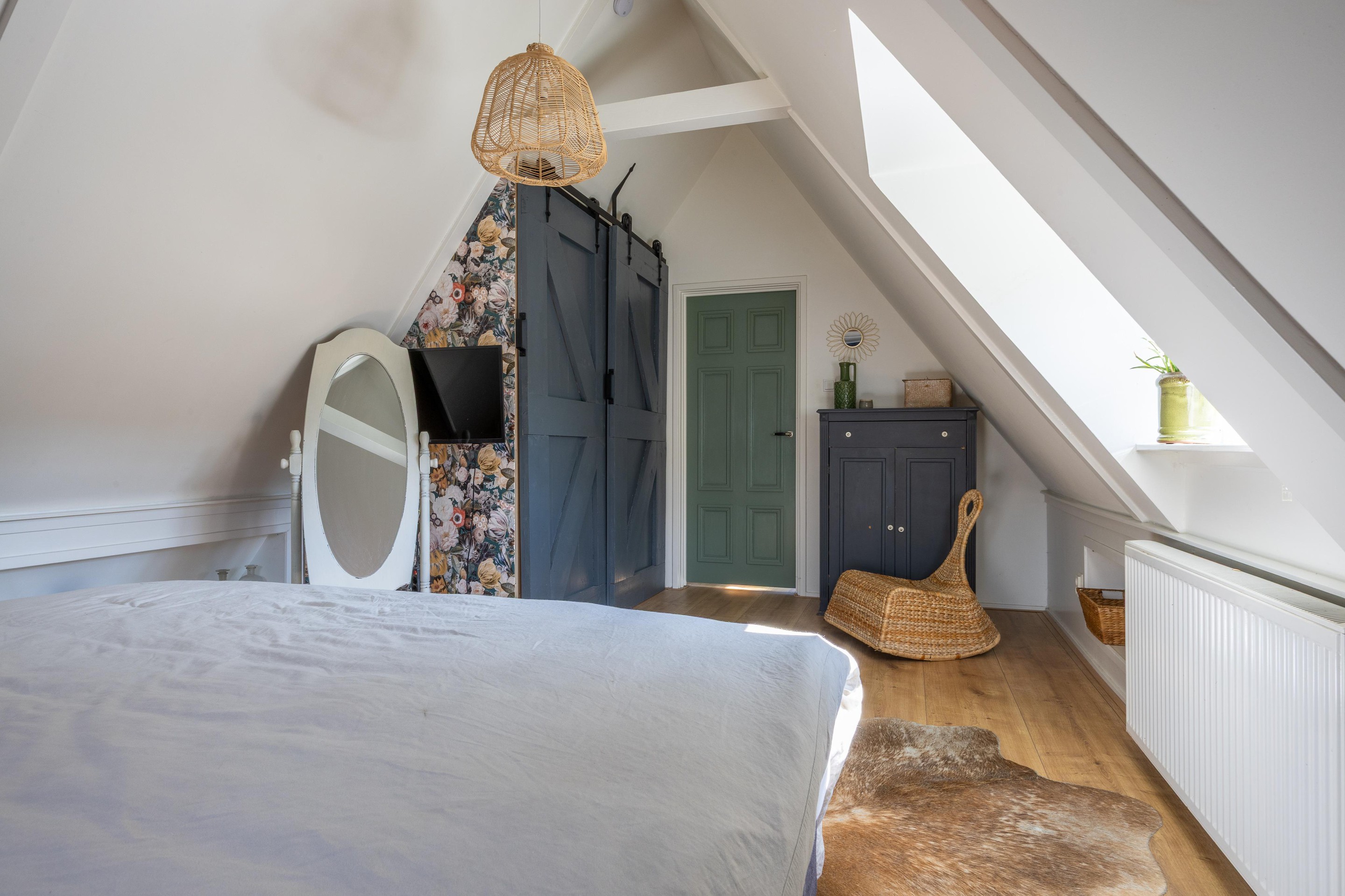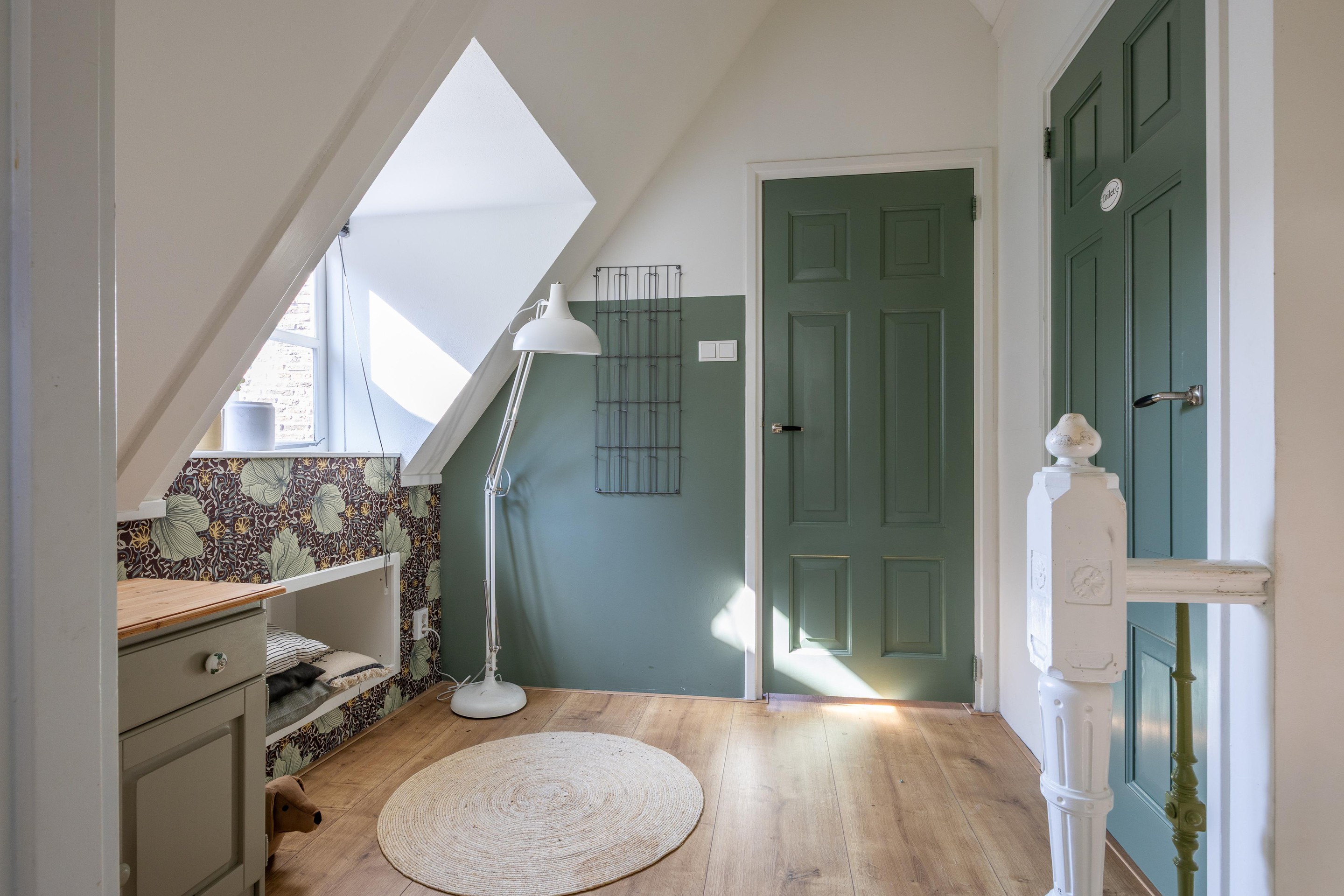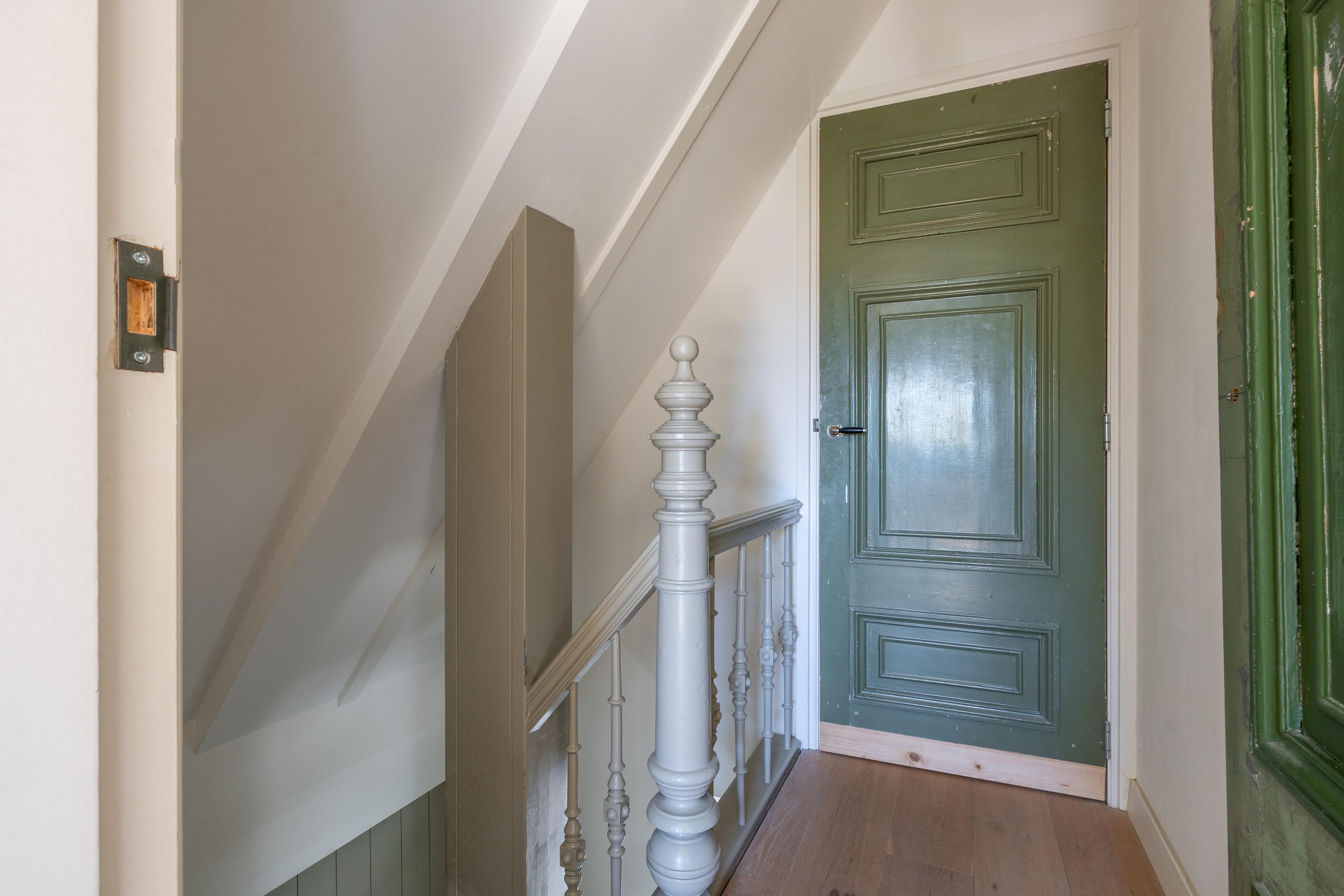 Achter de keuken leidt een gang met trap naar de eerste verdieping van het achterhuis. Hier vind je een ruime overloop en nog eens twee slaapkamers.