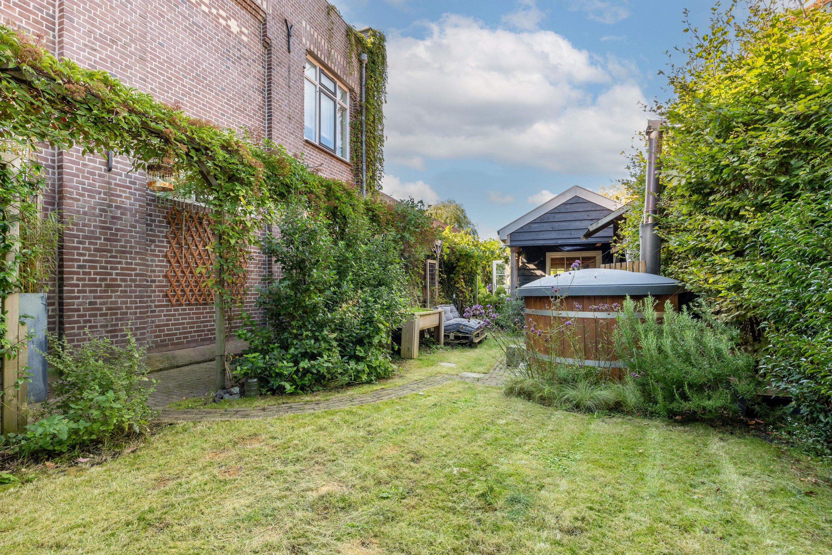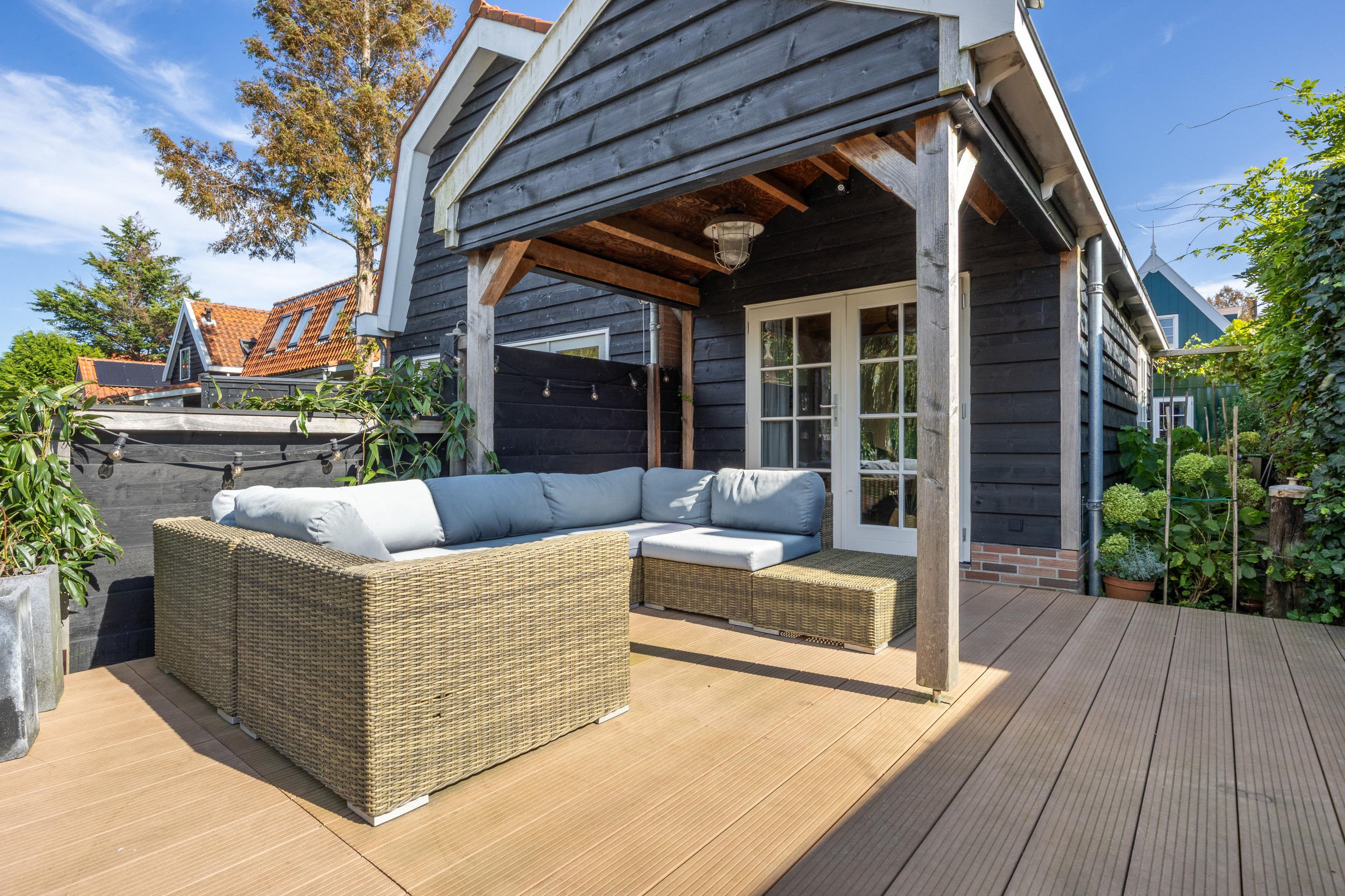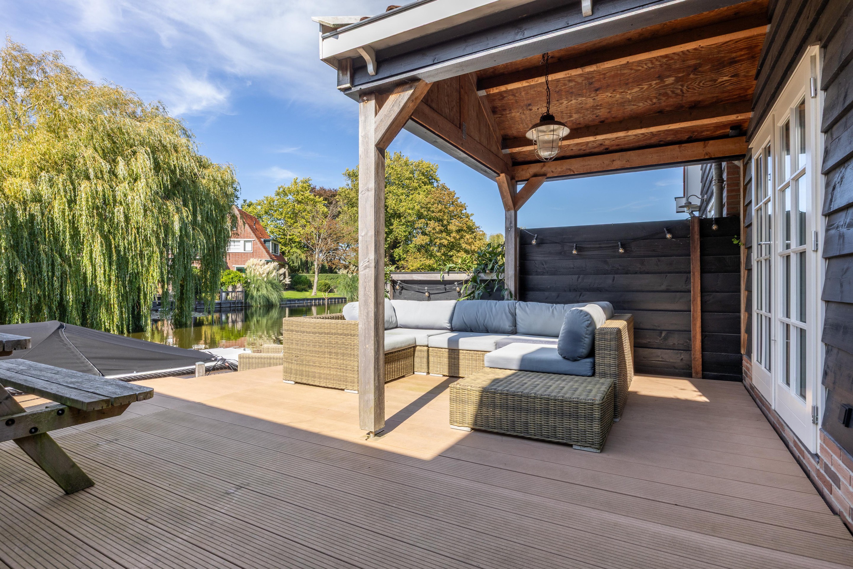 Via de straatpoort kom je eerst langs de sauna en de schuur, gevolgd door een grasveldje met houtgestookte hottub en een luxe tuinhuis. De openslaande deuren van het tuinhuis leiden naar de vlonder aan het open water, waar je geniet van een prachtig uitzicht.