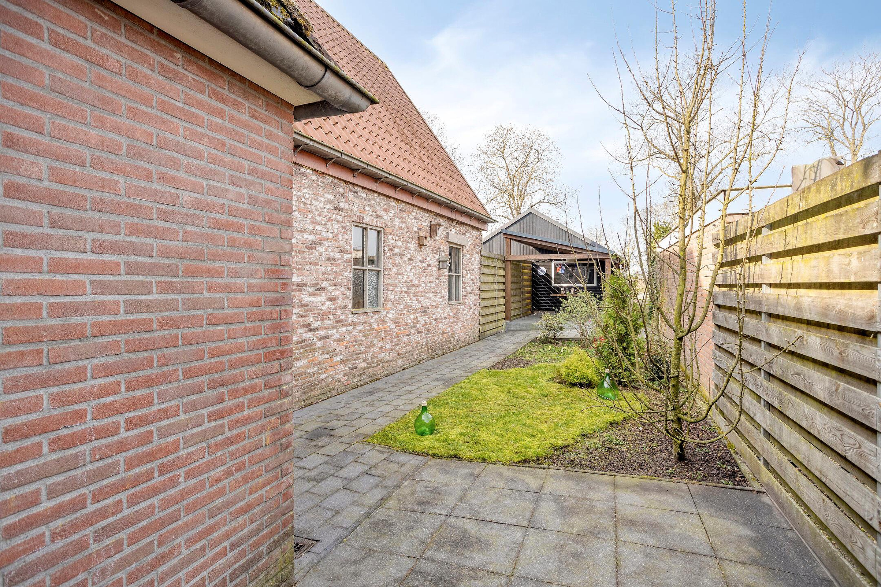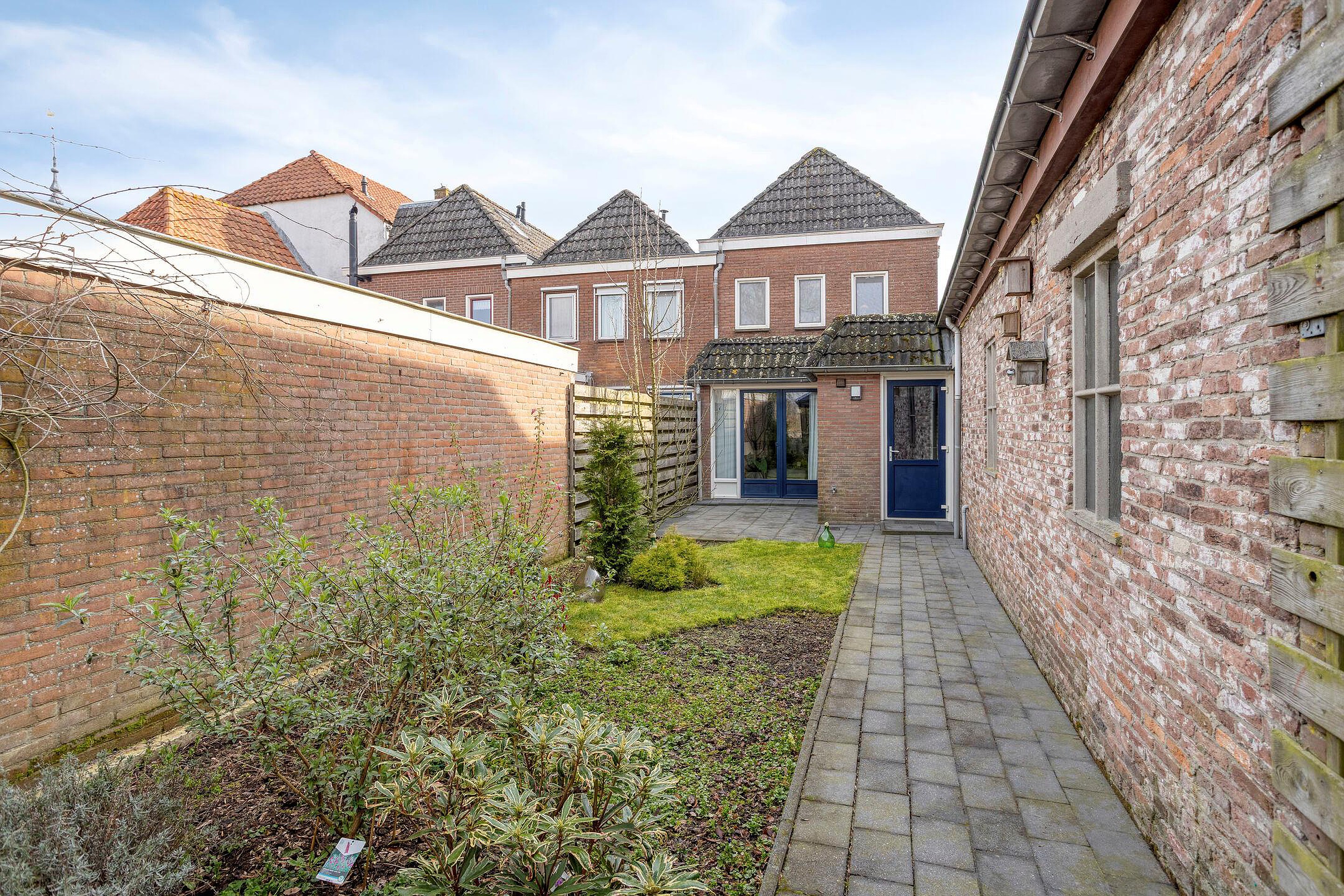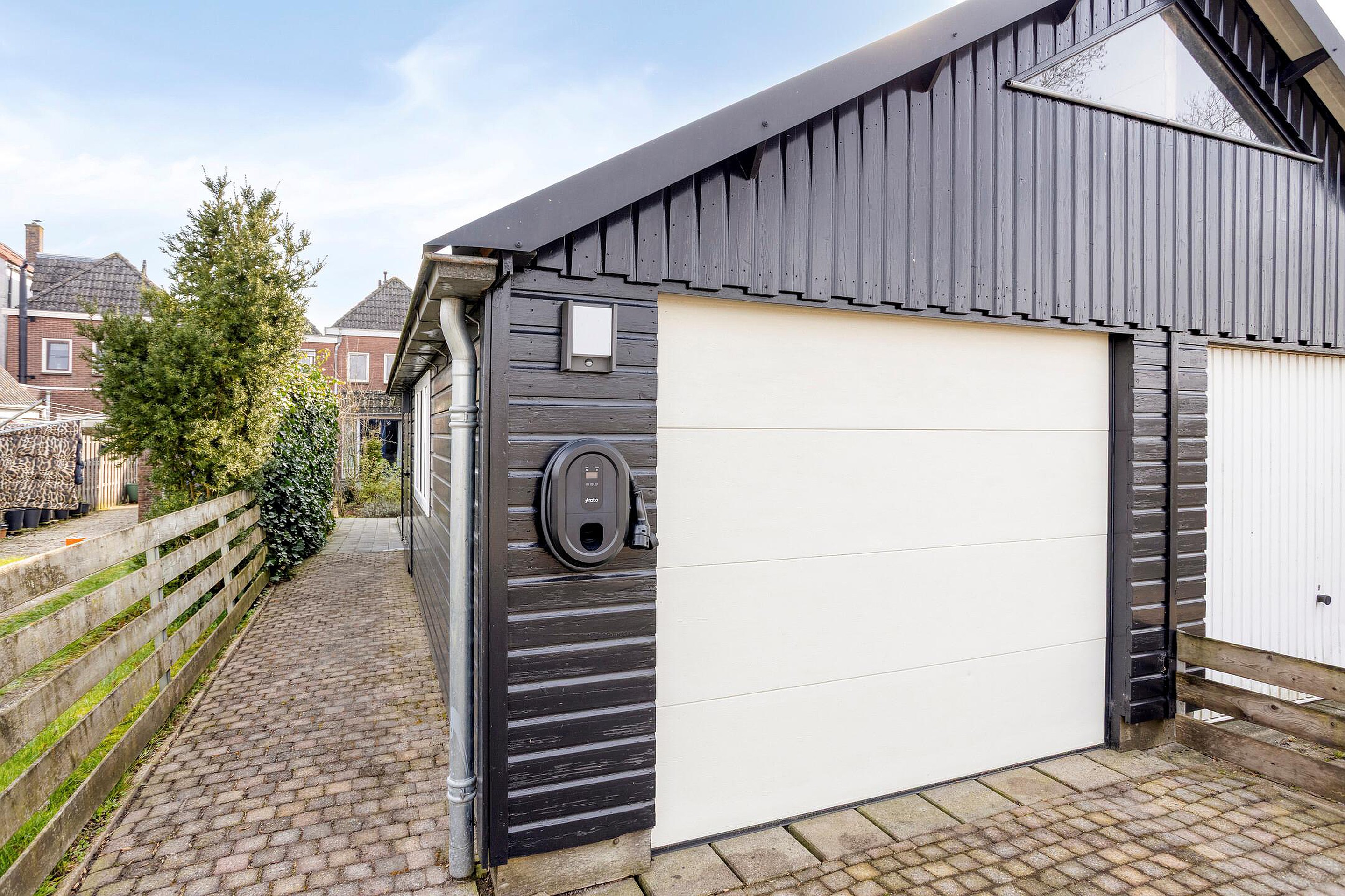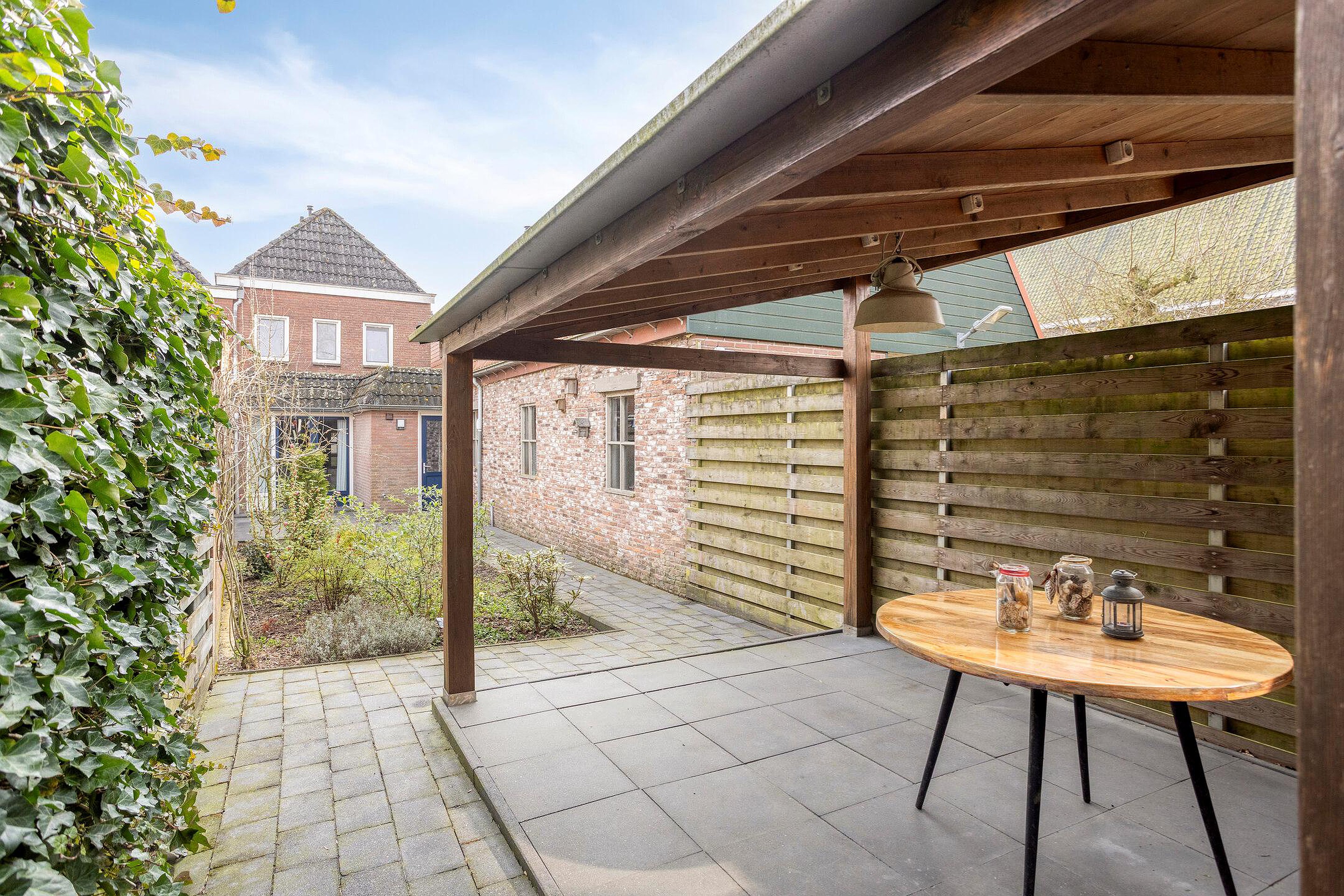 - De woning is voorzien van een achtertuin met o.a. diverse terrassen, een achterom en een garage.