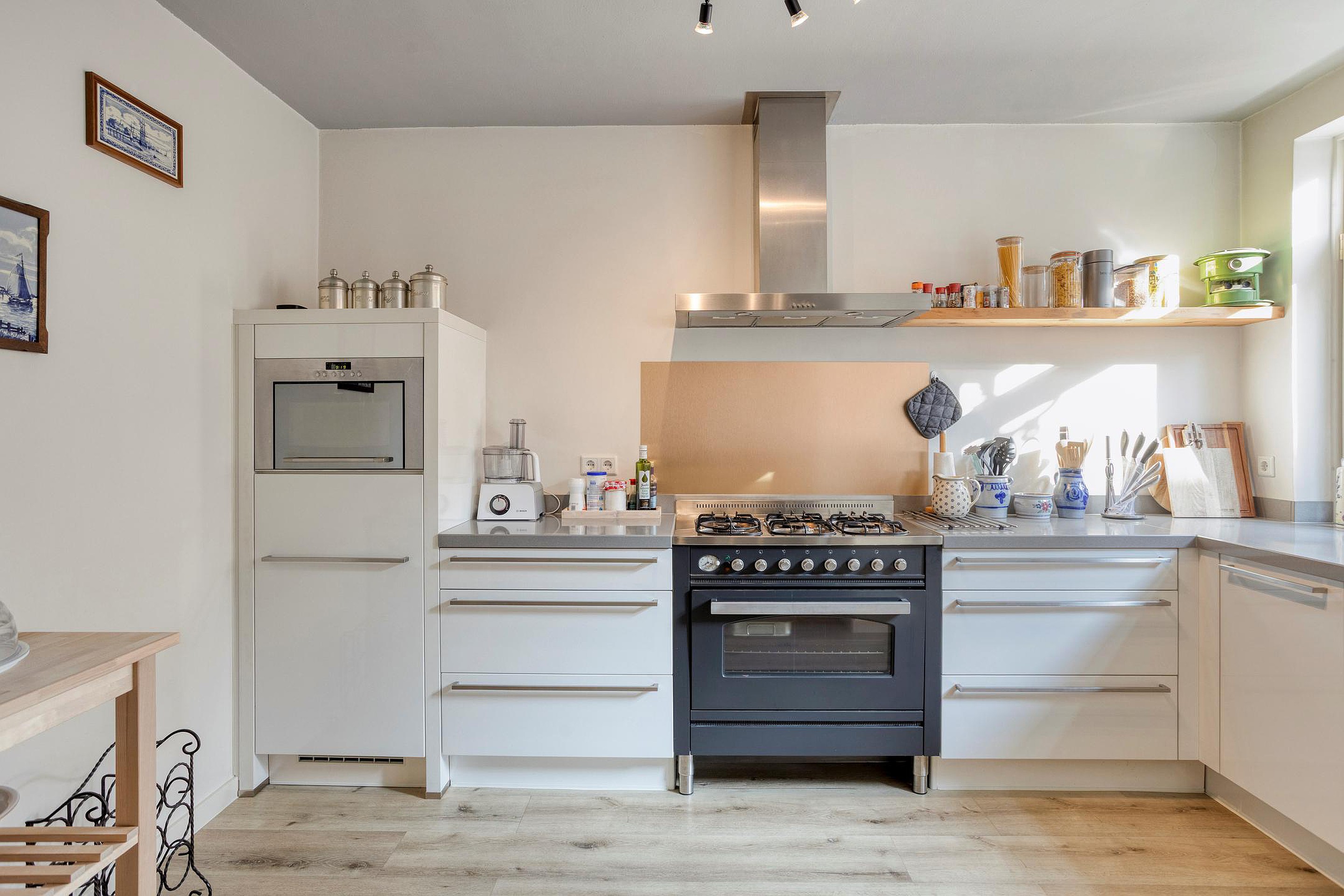 Begane grond Entree/hal met meterkast en kast. De woonkamer, gelegen aan de achterzijde, is voorzien van openslaande tuindeuren en een gashaard. Aan de voorzijde is de keukenopstelling met een keukenblok voorzien van diverse inbouwapparatuur, o.a. een gaskookplaat, oven, afzuigkap, combimagnetron, koelkast en een vaatwasmachine. Via de bijkeuken bereikt u de achtertuin. Het toilet en de trapopgang bevinden zich in een tussenhal.