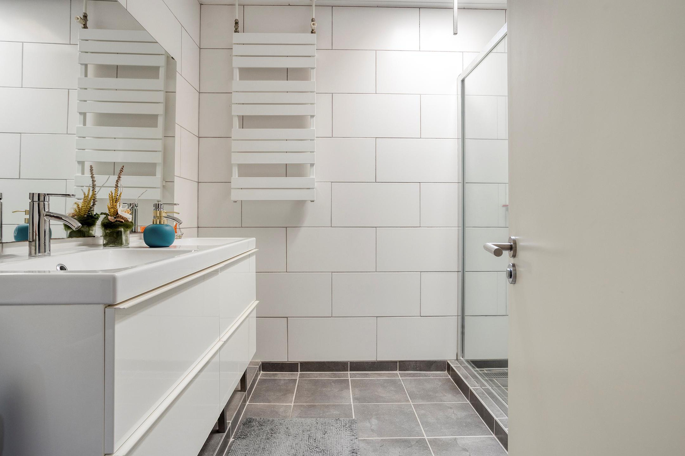 Eerste verdieping Overloop met trapopgang, 3 slaapkamers en een badkamer voorzien van een douchehoek, toilet en een dubbele wastafel in meubel.