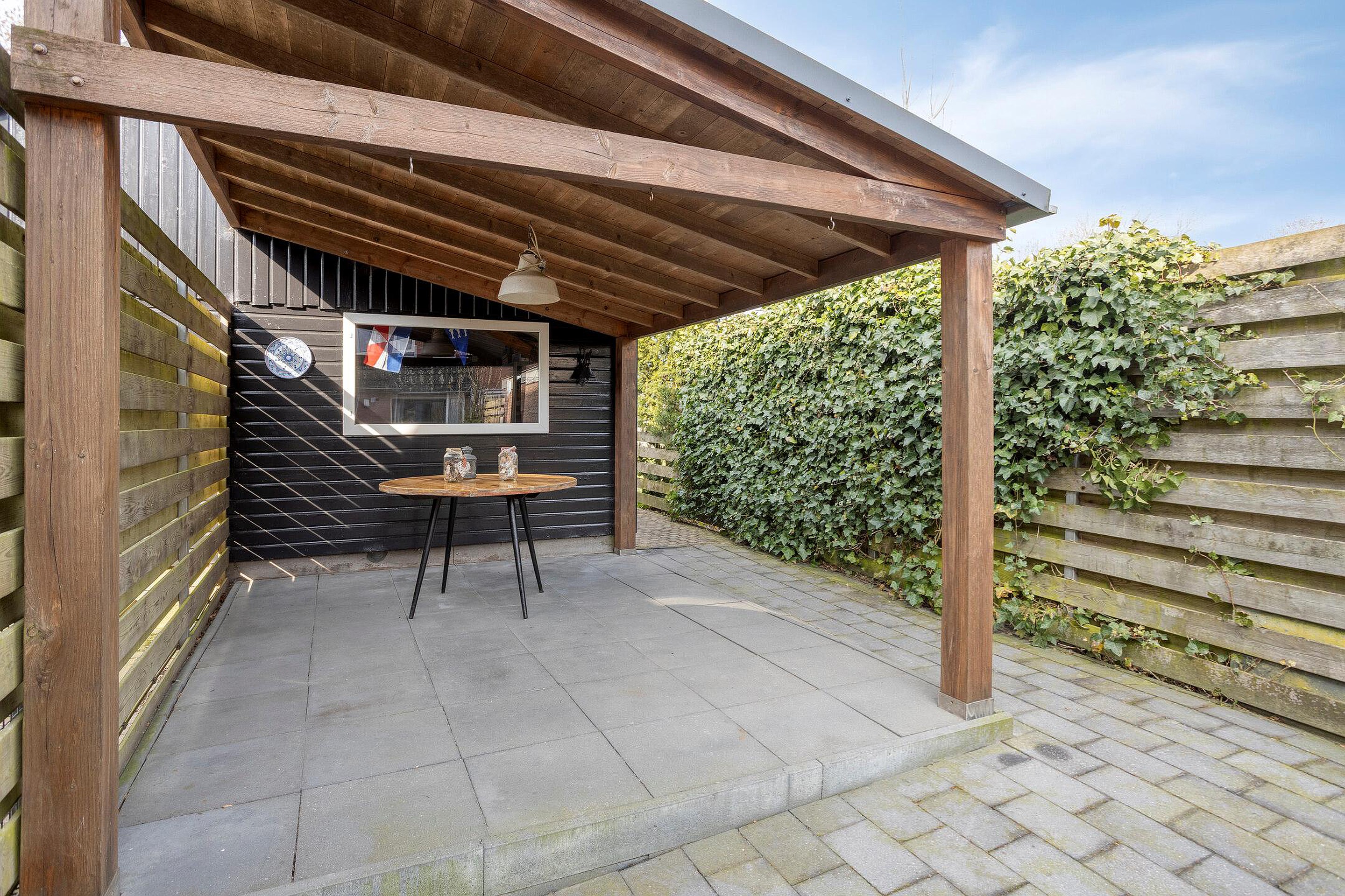 Tuin De diepe achtertuin, gelegen op het westen, beschikt o.a. over diverse terrassen, een overdekt terras, een houten half-vrijstaande garage en een achteruitgang.