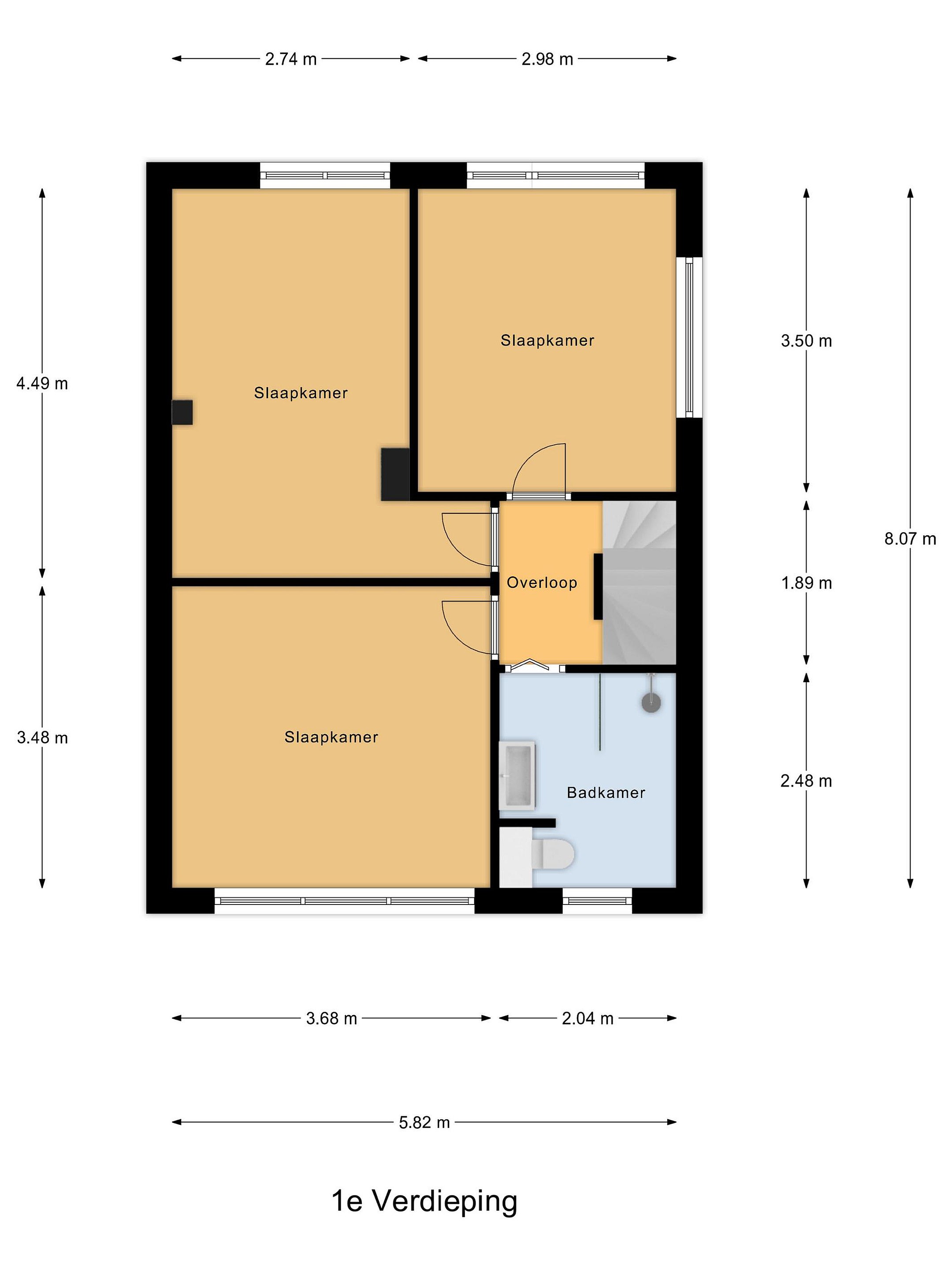 Op de eerste verdieping ervaart u direct het gevoel van ruimte en comfort.. De overloop geeft toegang tot drie ruime slaapkamers, elk met voldoende plek voor een groot bed, kastruimte en eventueel een werk- of zithoek. Het vele daglicht dat door de grote ramen naar binnen valt, zorgt voor een aangename en ontspannen sfeer.