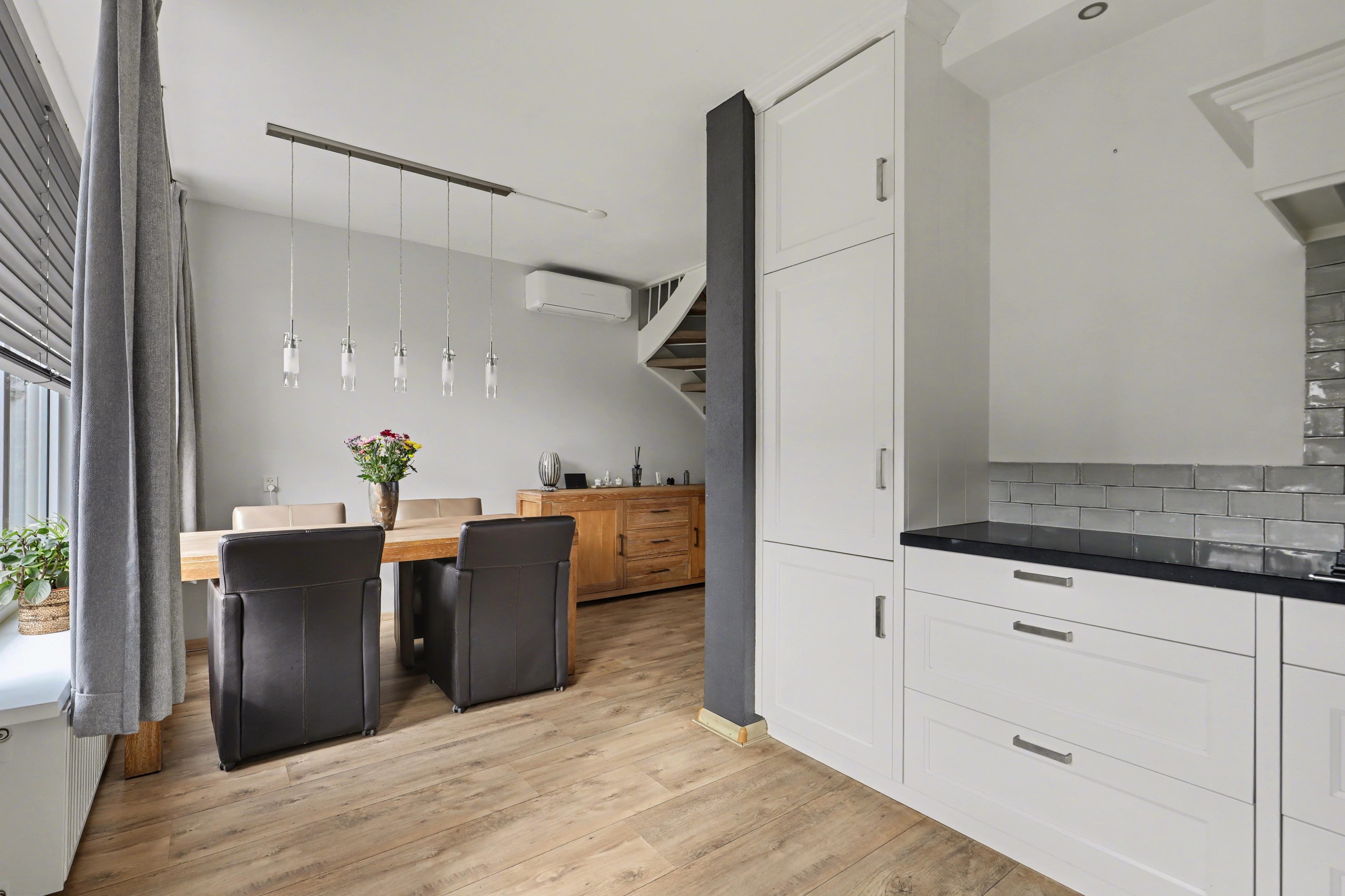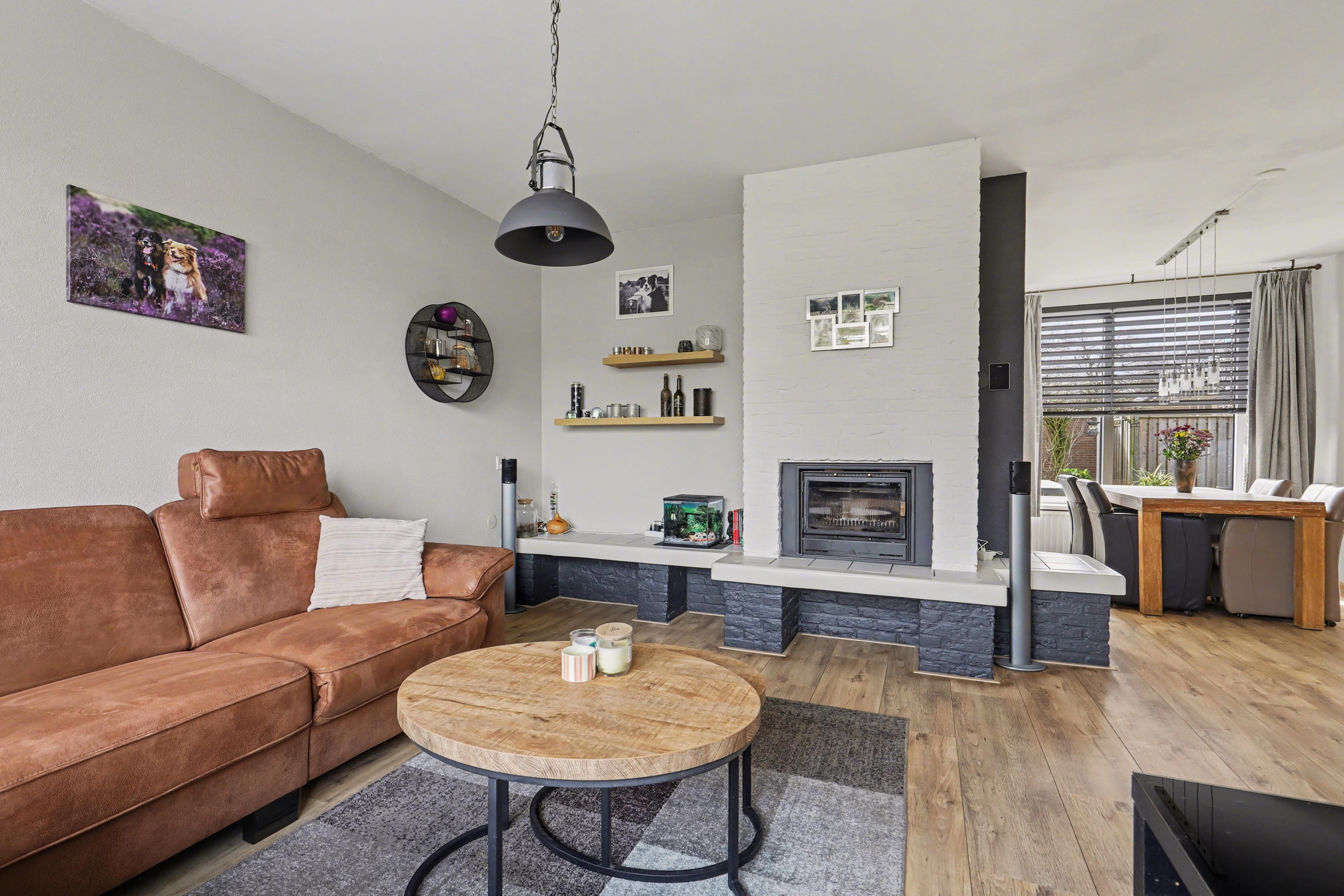De woonkamer is heerlijk licht dankzij de grote raampartijen en biedt volop ruimte voor zowel een comfortabele zithoek als een gezellige eethoek. De open indeling zorgt voor een prettige verbinding met de luxe keuken. De houtkachel vormt een warm middelpunt en creëert een gezellige sfeer, ideaal voor lange avonden thuis. Via de keuken heeft u direct toegang tot de tuin.