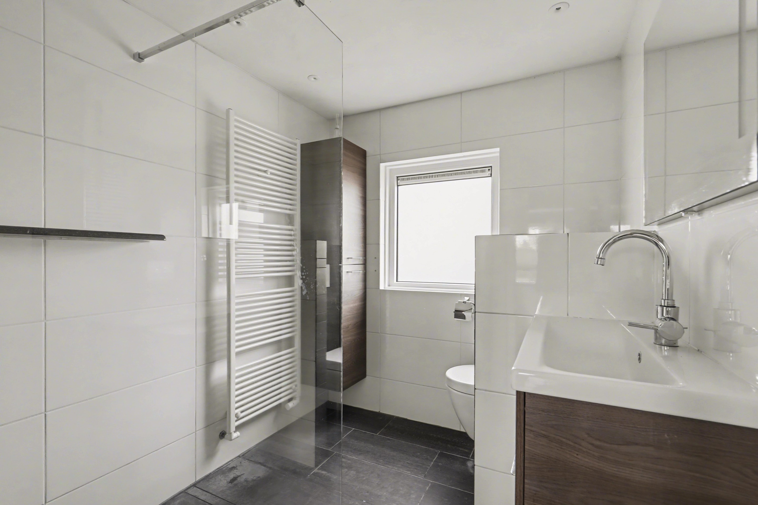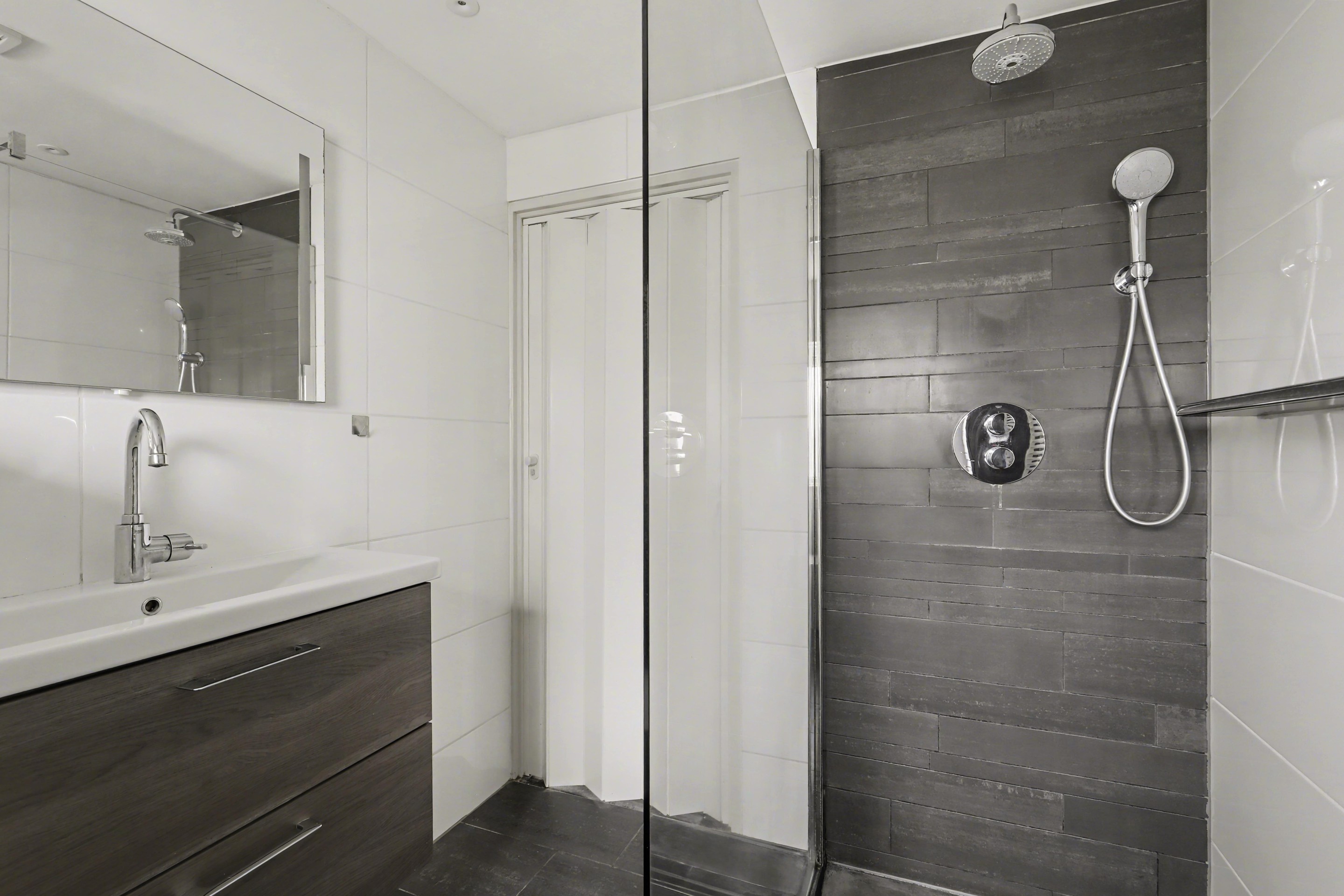 De volledig betegelde badkamer is modern uitgevoerd en beschikt over een inloopdouche met regen- en handdouche, thermostaatkraan, tweede toilet en een stijlvol badkamermeubel met wastafel. Een fijne plek om tot rust te komen.