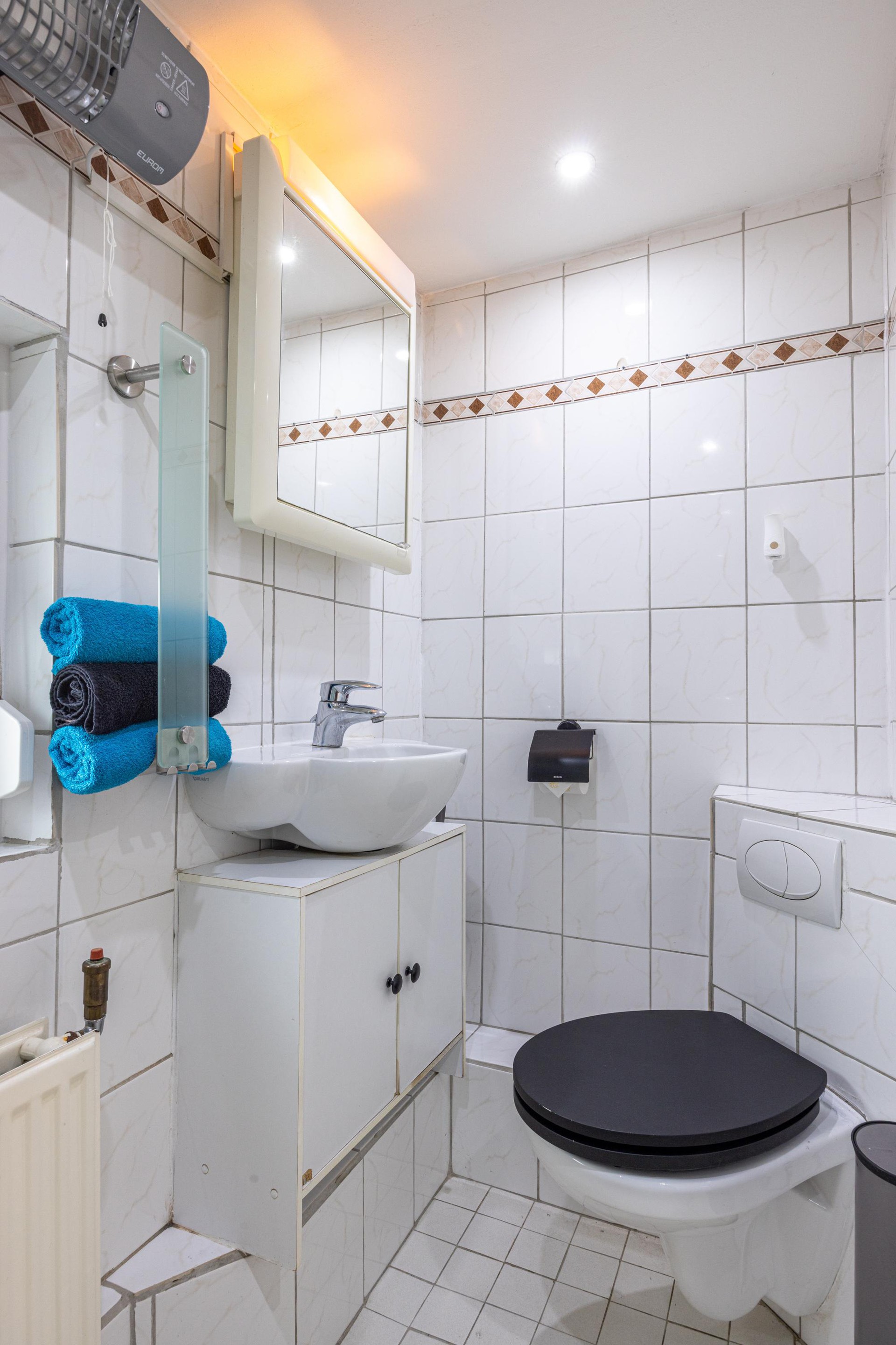 De badkamer (2011) is modern en compleet: geheel betegeld, met een zwevend badkamermeubel met wasbak en spiegel, een toilet en een inloopdouche met glazen wand. De badkamer is compact maar compleet ingericht met een douchecabine, wastafel, zwevend toilet en raam met Dauerlüftung en rolluik. Via de kastruimte in de kleine slaapkamer is middels een losse trap de bergzolder te bereiken.
