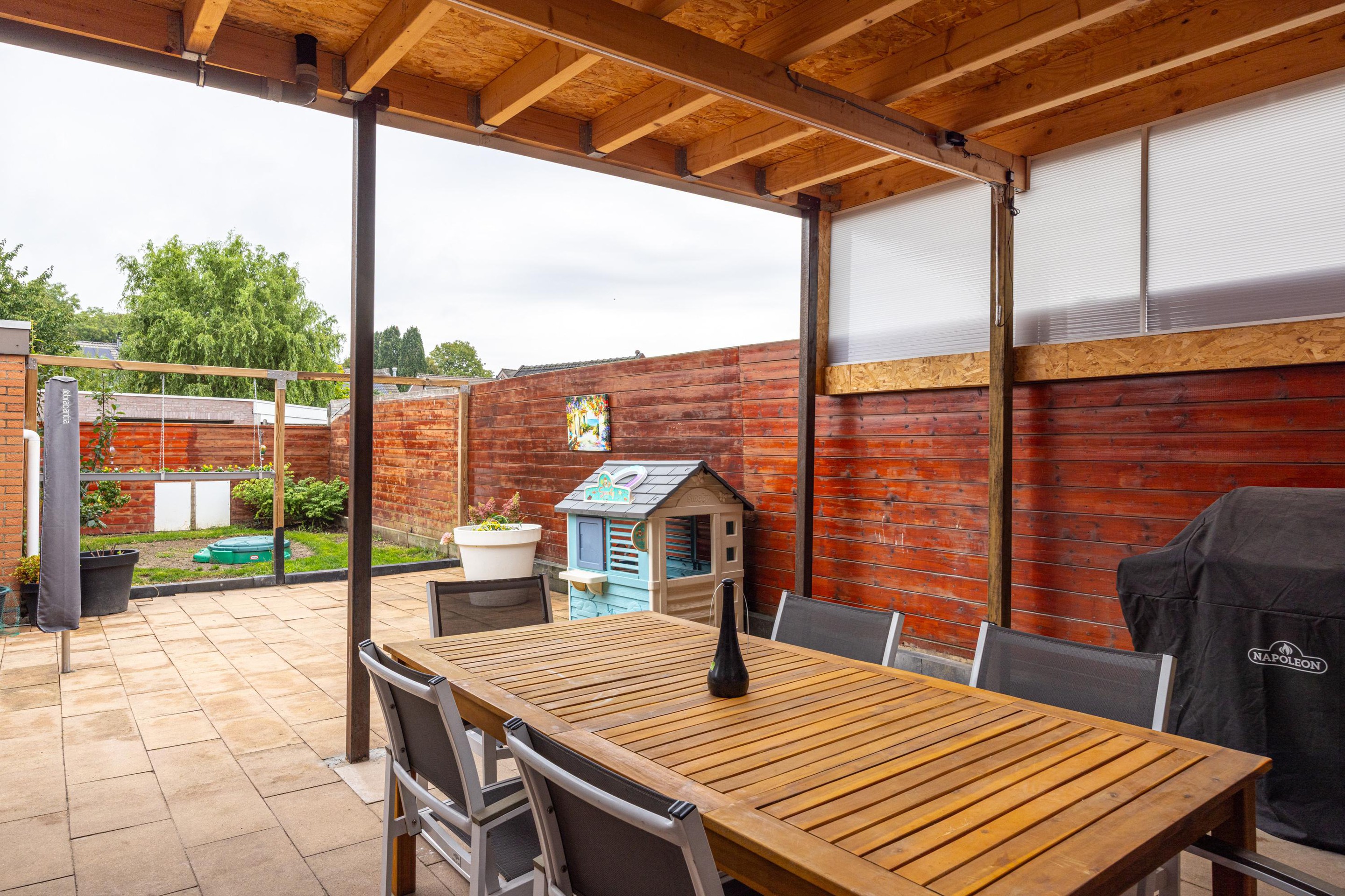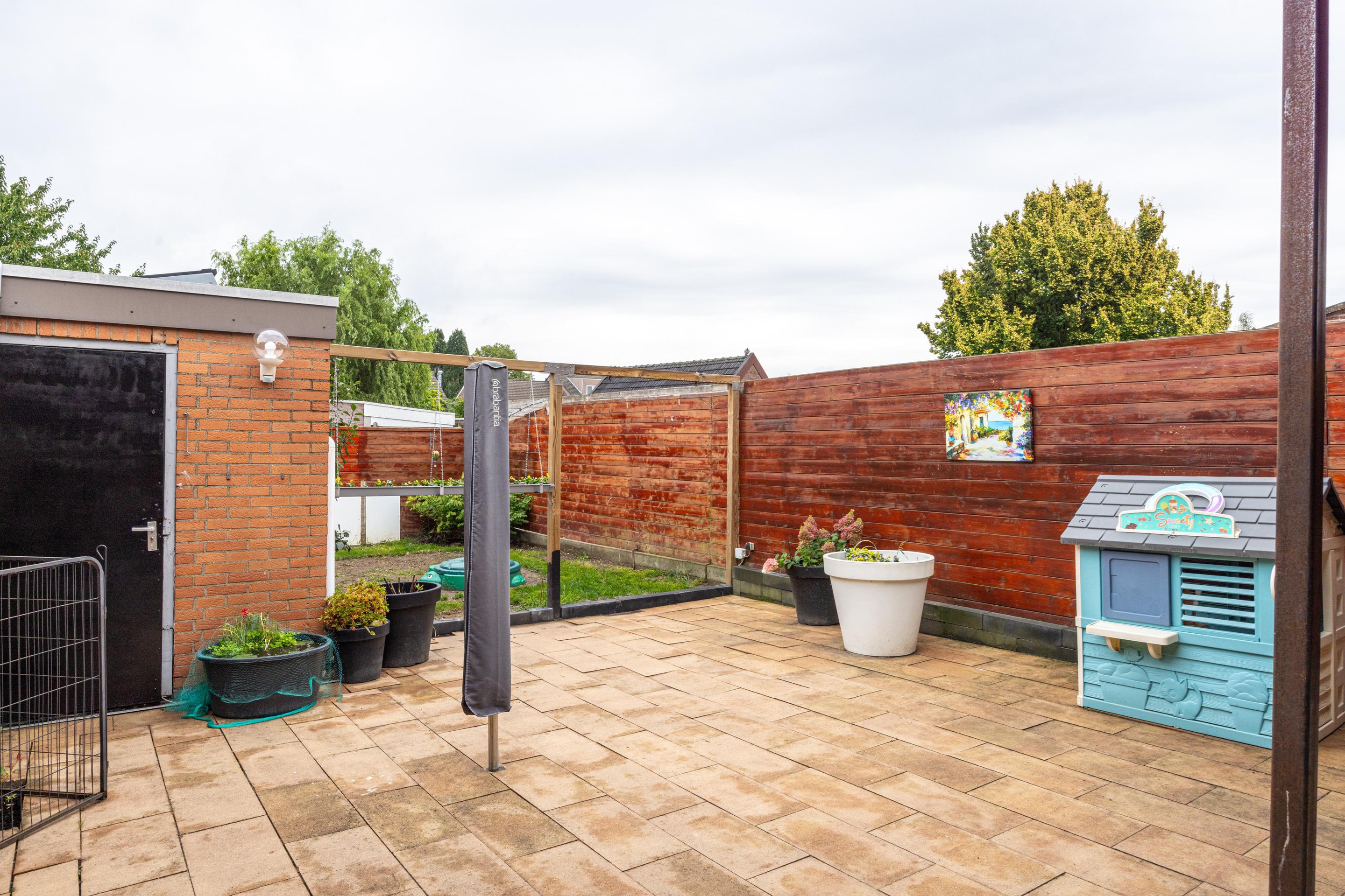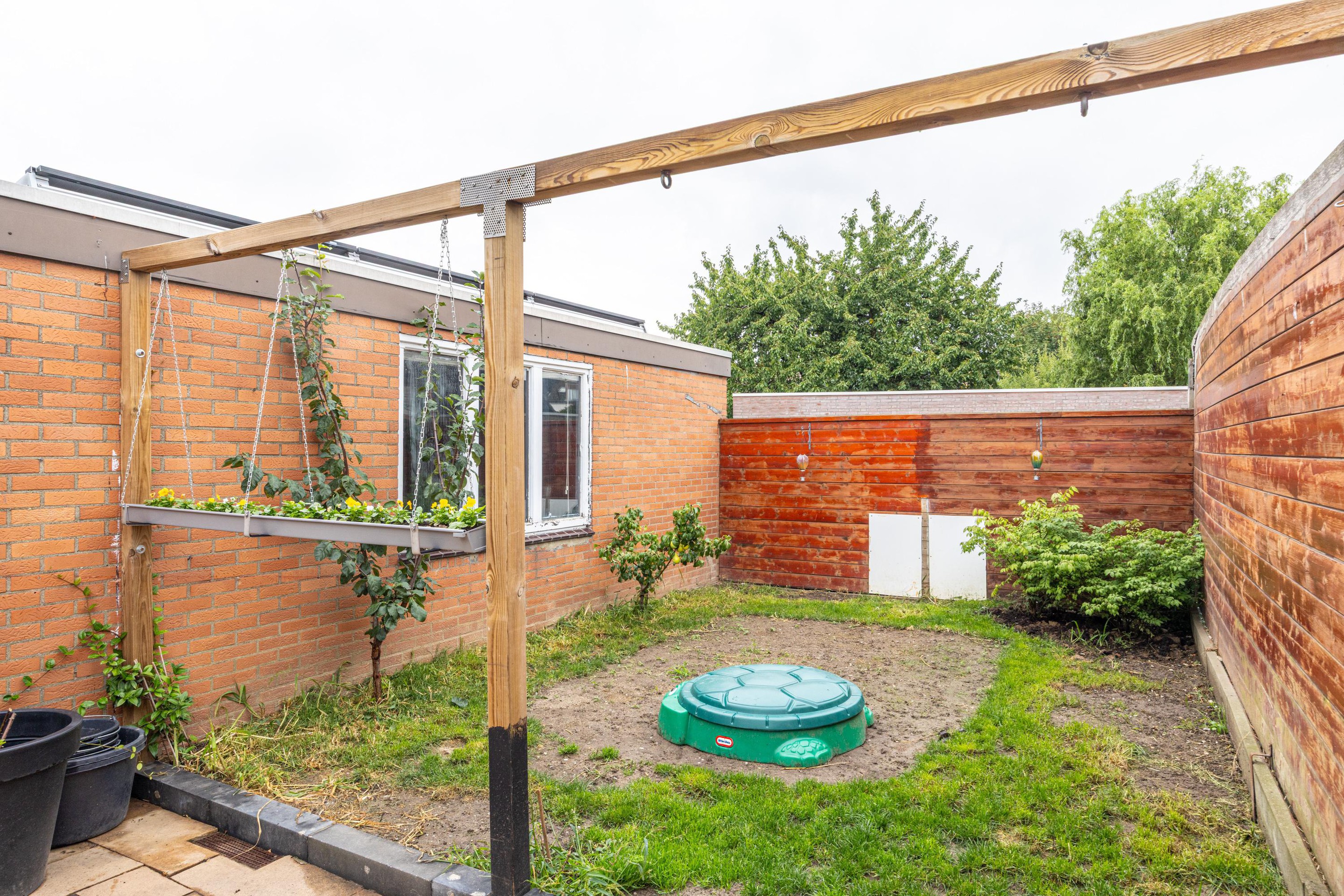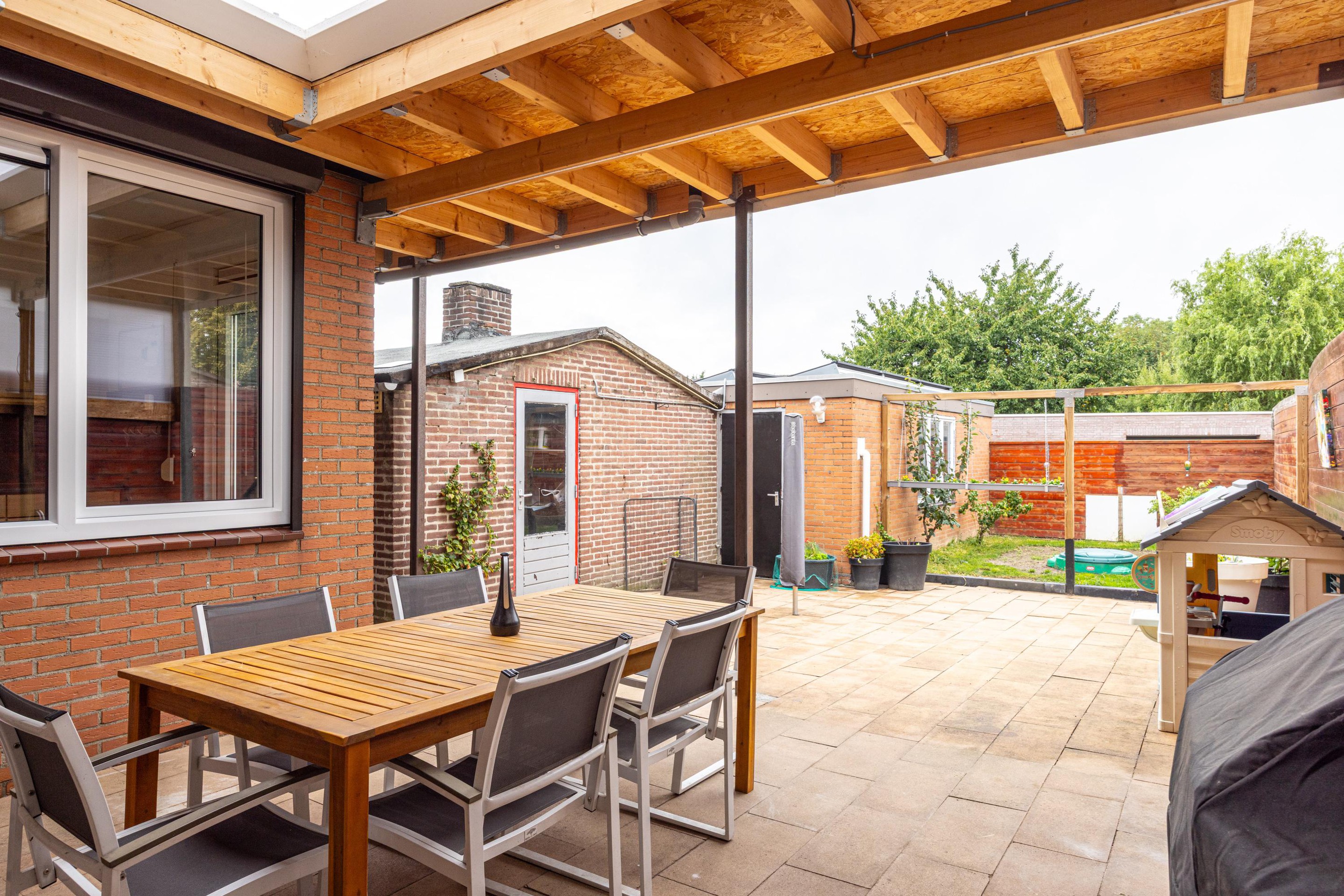 Tuin De achtertuin is onderhoudsvriendelijk aangelegd en biedt verrassend veel ruimte en privacy. Direct achter de woning bevindt zich een royaal terras met een overkapping, voorzien van een lichtkoepel. Hierdoor kun je hier niet alleen tijdens zonnige dagen, maar ook bij minder weer heerlijk buiten zitten. Verder is er voldoende plek voor groen of speelruimte en staat er een praktische schuur voor extra bergruimte. Via de tuin bereik je de ruime garage met sectionaalpoort, die ook toegankelijk is vanaf de achterzijde van het perceel.