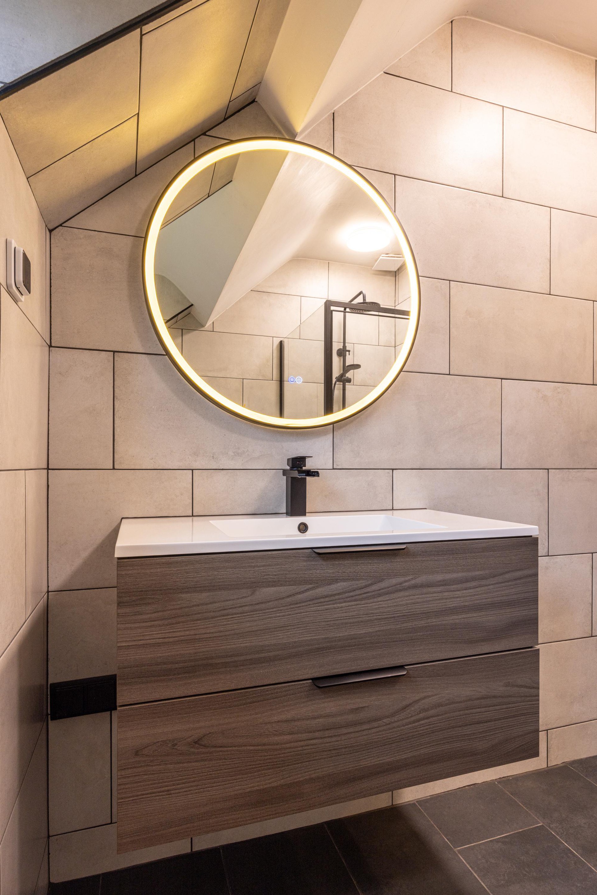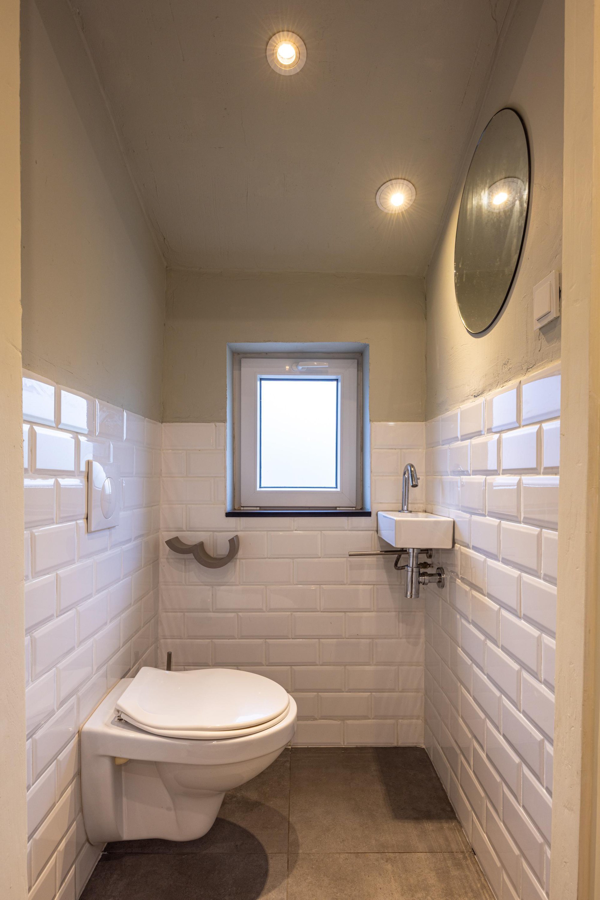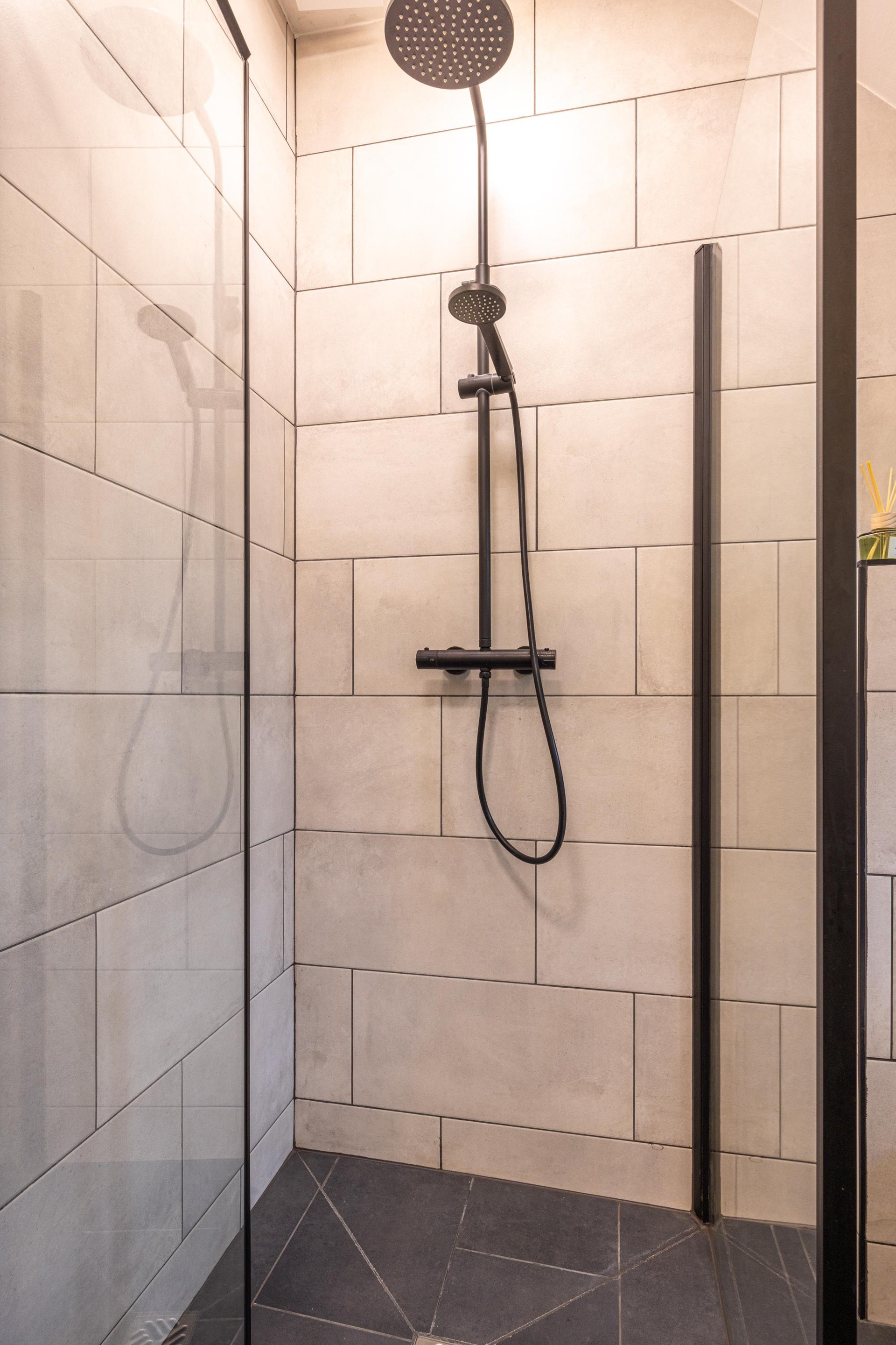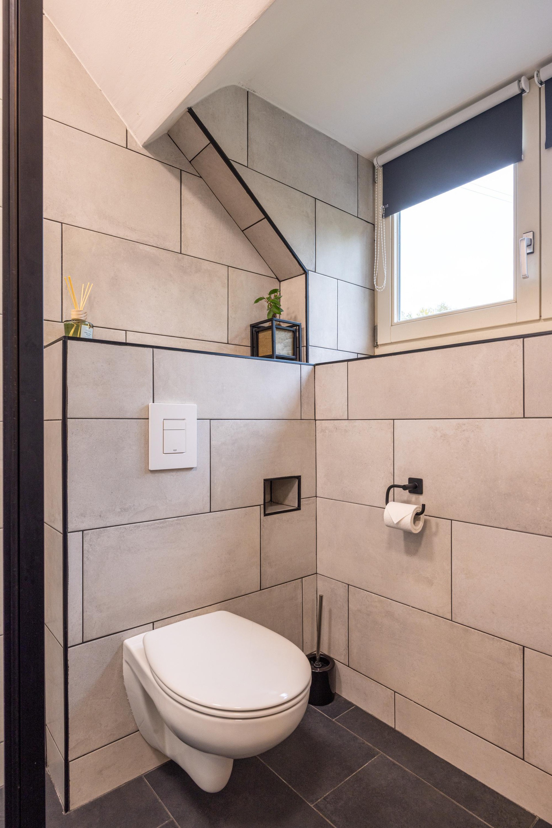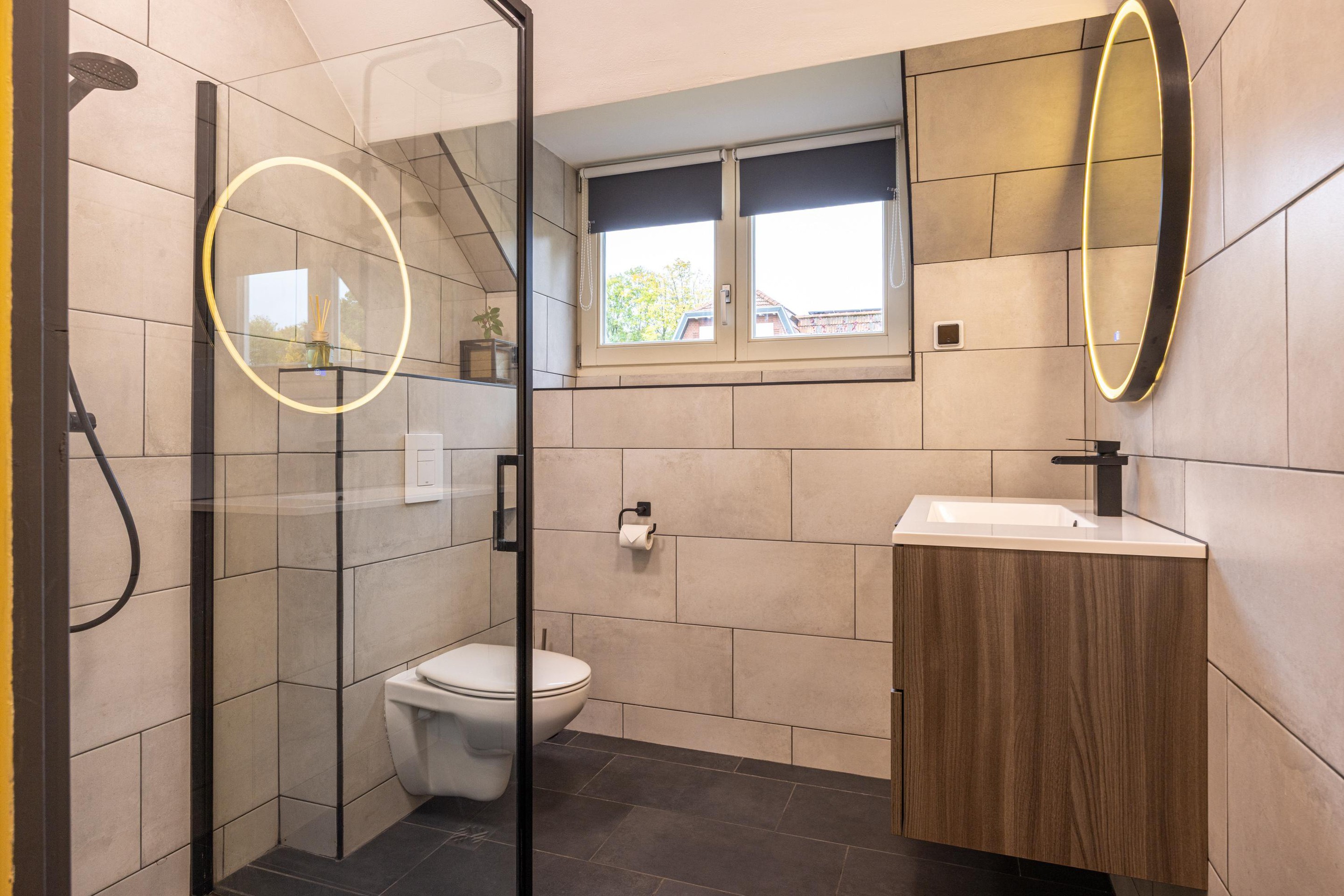 Badkamer met inloopdouche, toilet en badkamermeubel