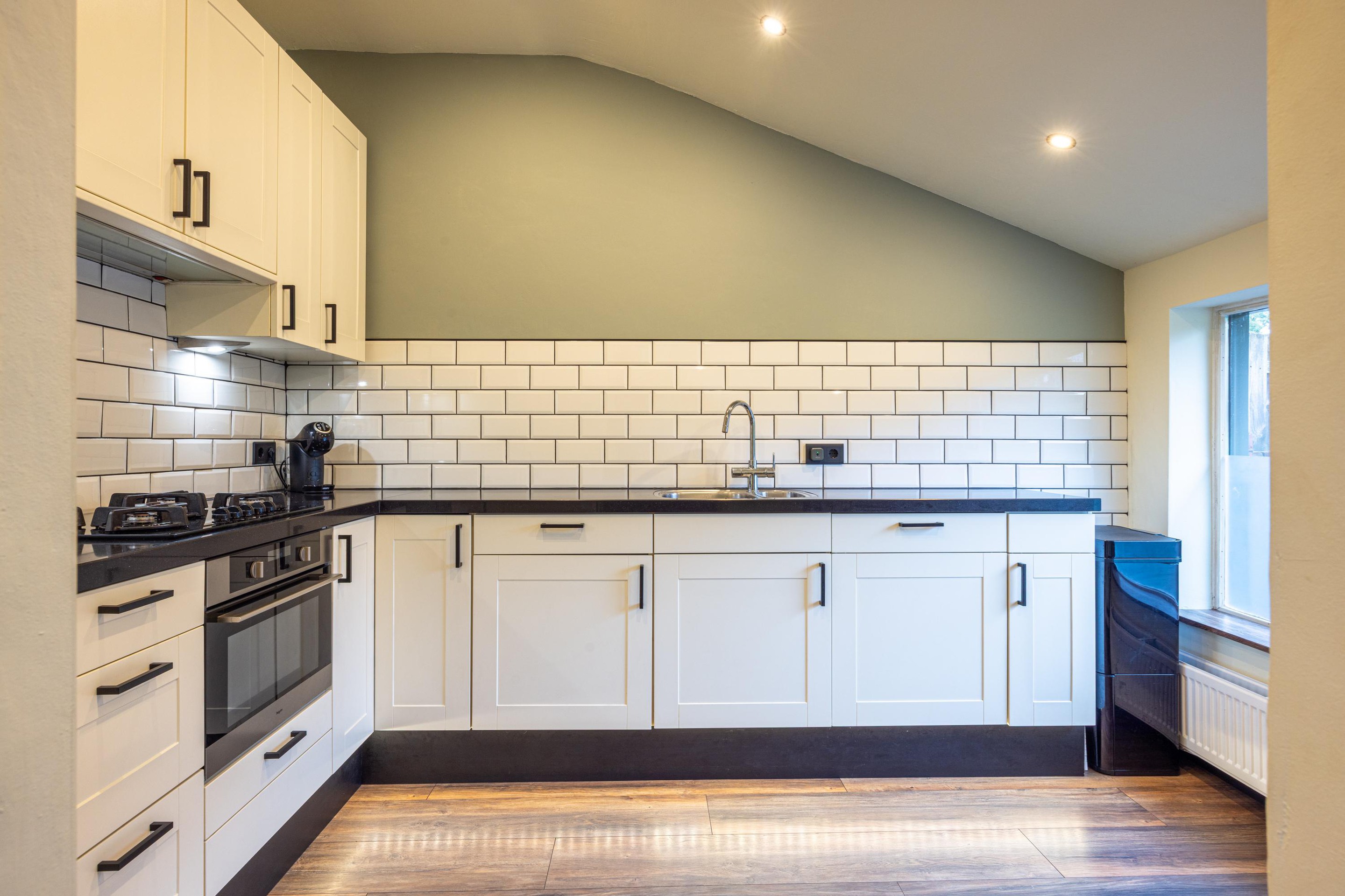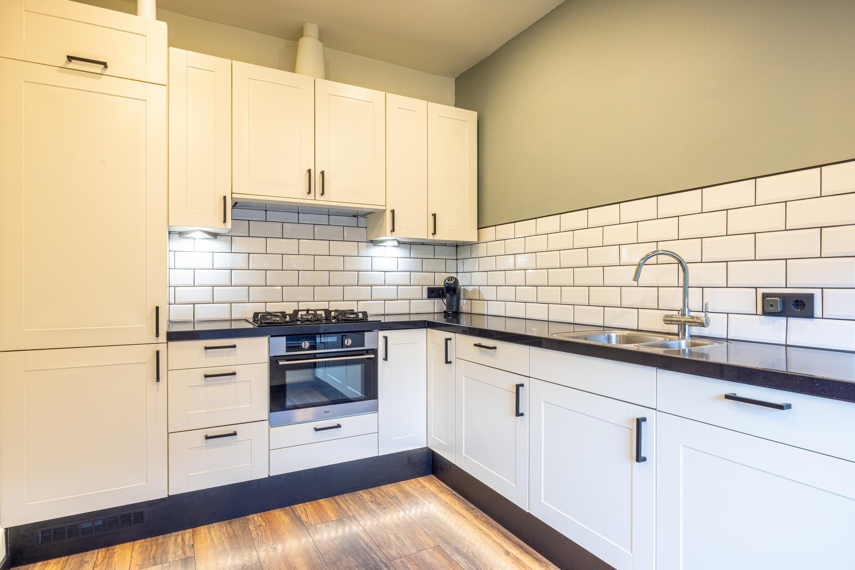 De keuken is gesloten en bereikbaar via de hal. Deze is in 2016 vernieuwd en heeft een laminaatvloer. Er is volop werk- en kastruimte en de keuken is uitgerust met alle nodige inbouwapparatuur: een 5-pits gasfornuis, afzuigkap, combi-heteluchtoven, koelkast, vriezer en vaatwasser. Een fijne plek voor wie graag kookt en overzicht wil behouden tussen de woon- en eetruimte.