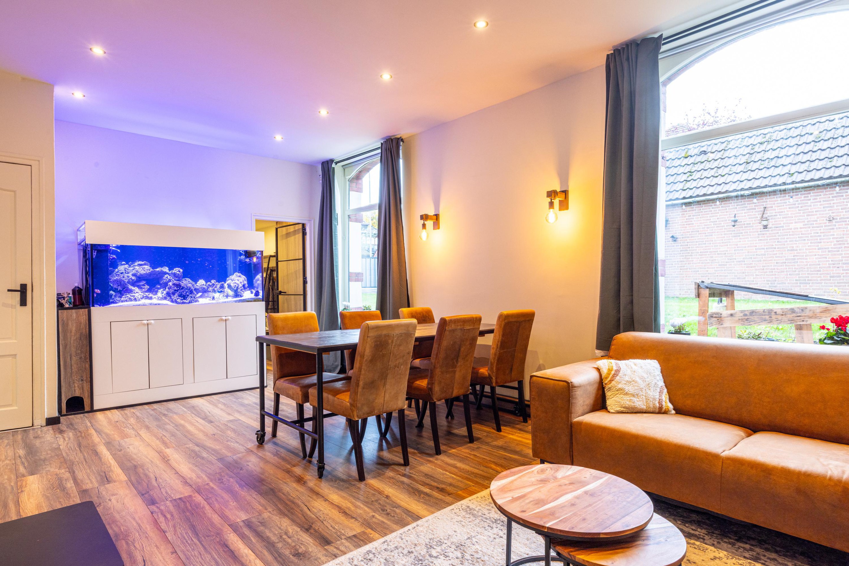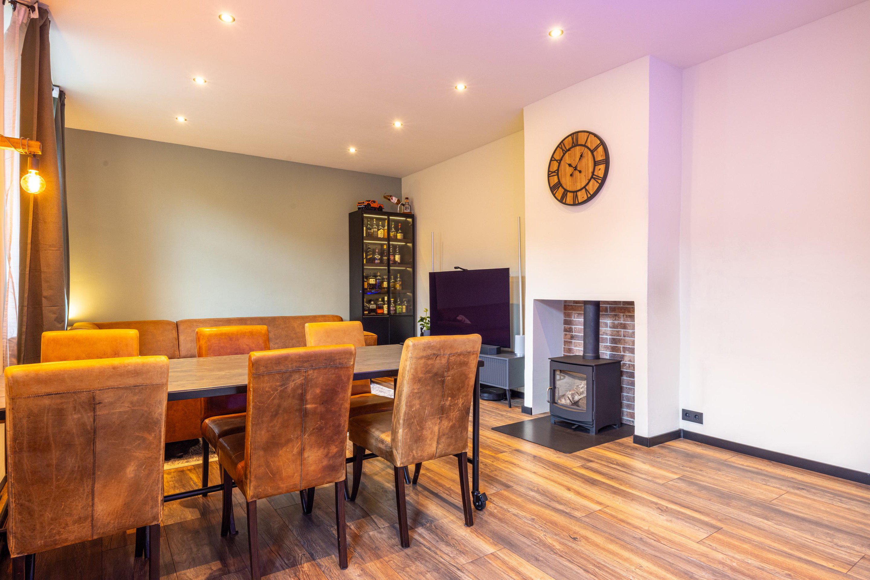 Vanuit de hal loop je door naar de woonkamer, die eveneens is voorzien van een laminaatvloer. De grote ramen met houten kozijnen en HR++ glas zorgen voor veel licht, terwijl de houtkachel in het midden van de ruimte zorgt voor een warme, gezellige sfeer. Er is voldoende plek voor zowel een ruime zithoek als een eettafel.