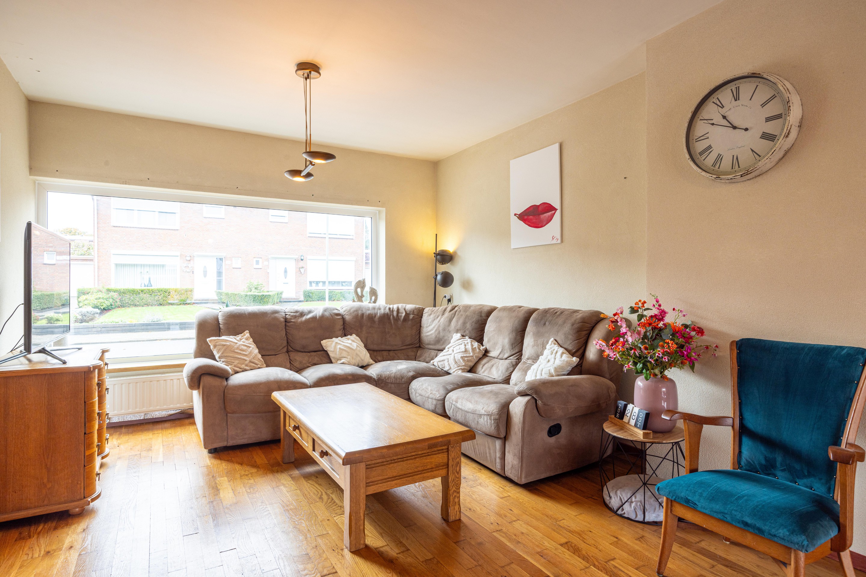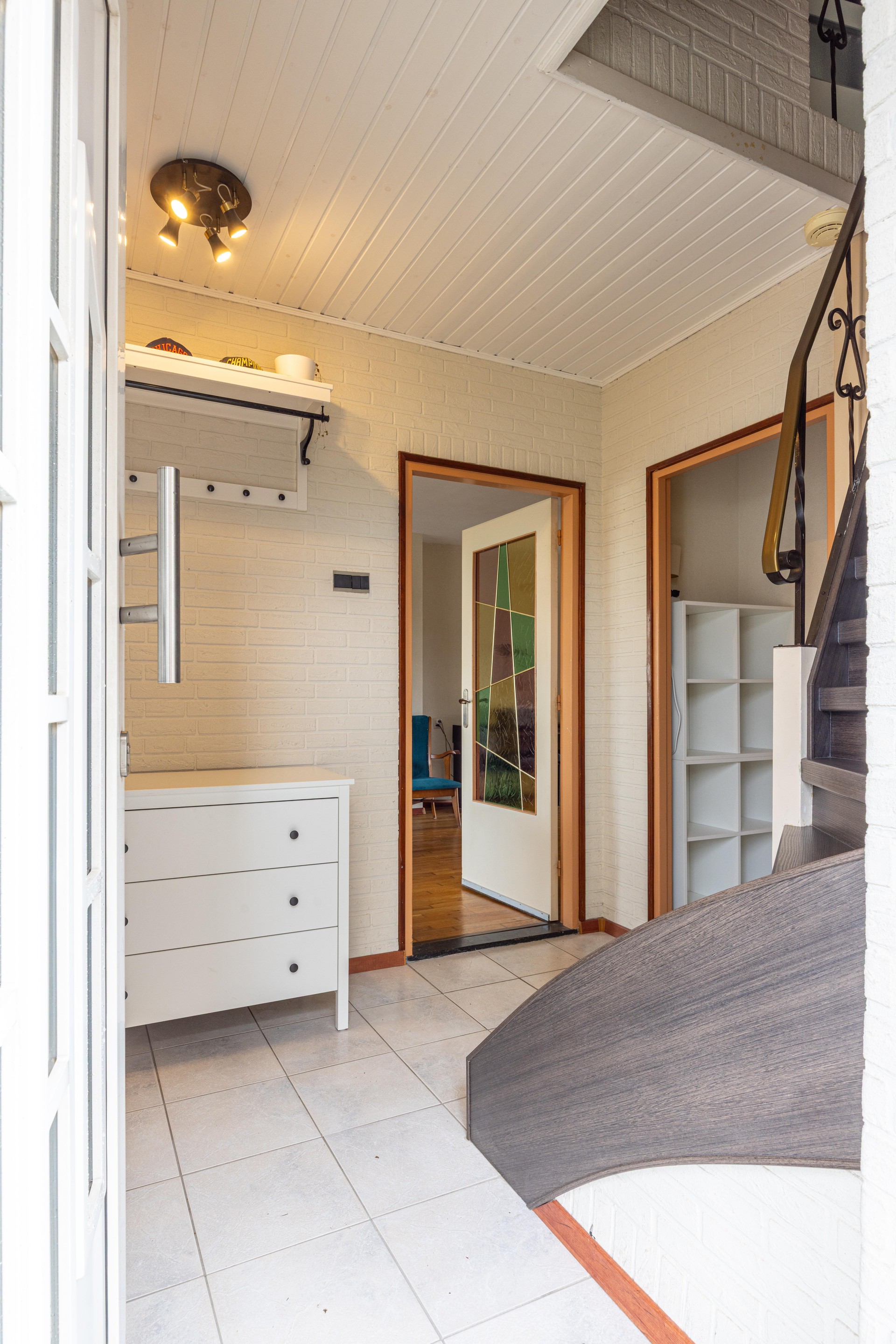 Begane grond Bij aankomst valt direct de nette voortuin en brede oprit op, met plaats voor meerdere auto’s en toegang tot de garage. In de hal vind je een lichte tegelvloer, een garderobe, de meterkast en het toilet. Vanuit hier stap je de woonkamer binnen.