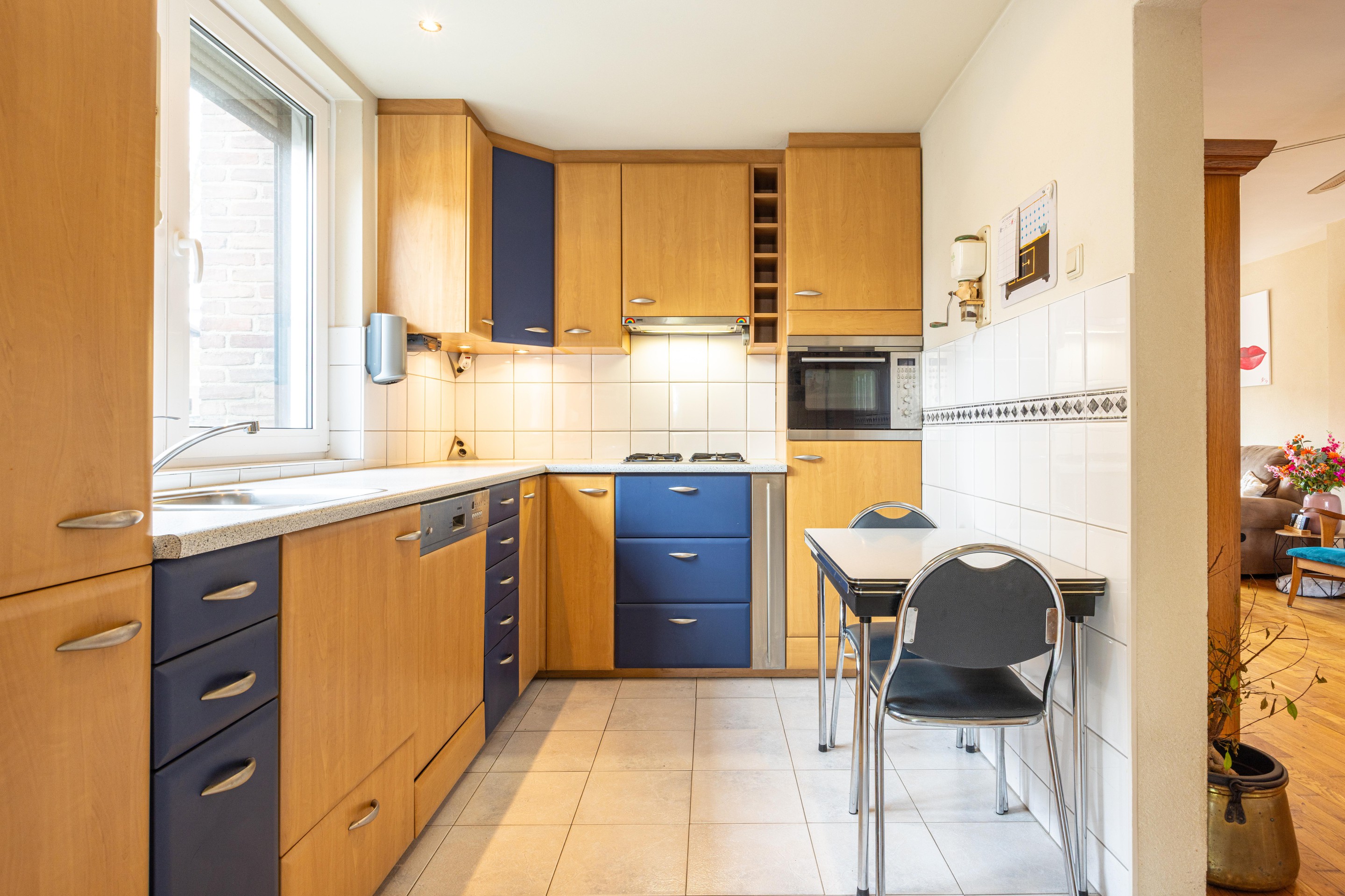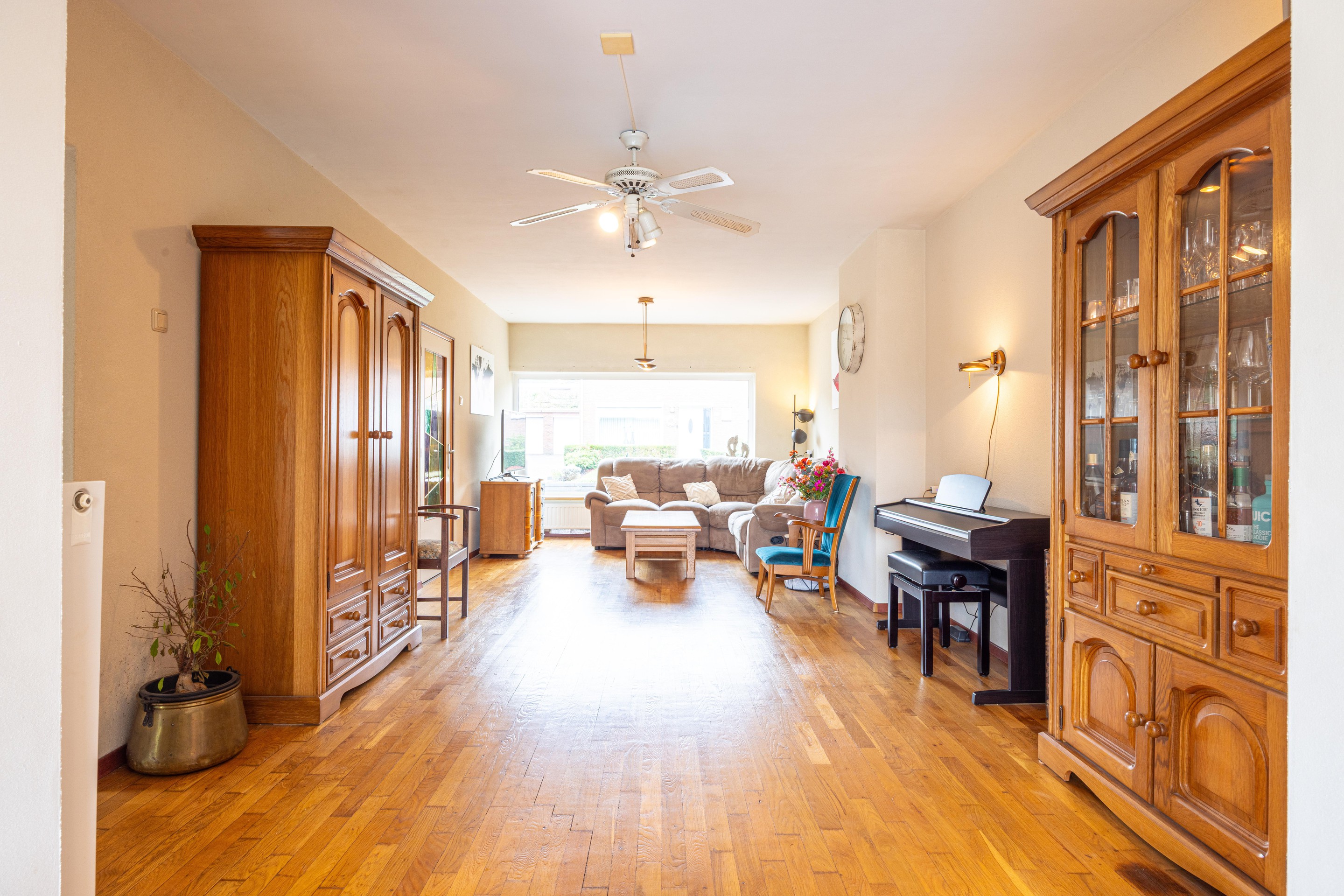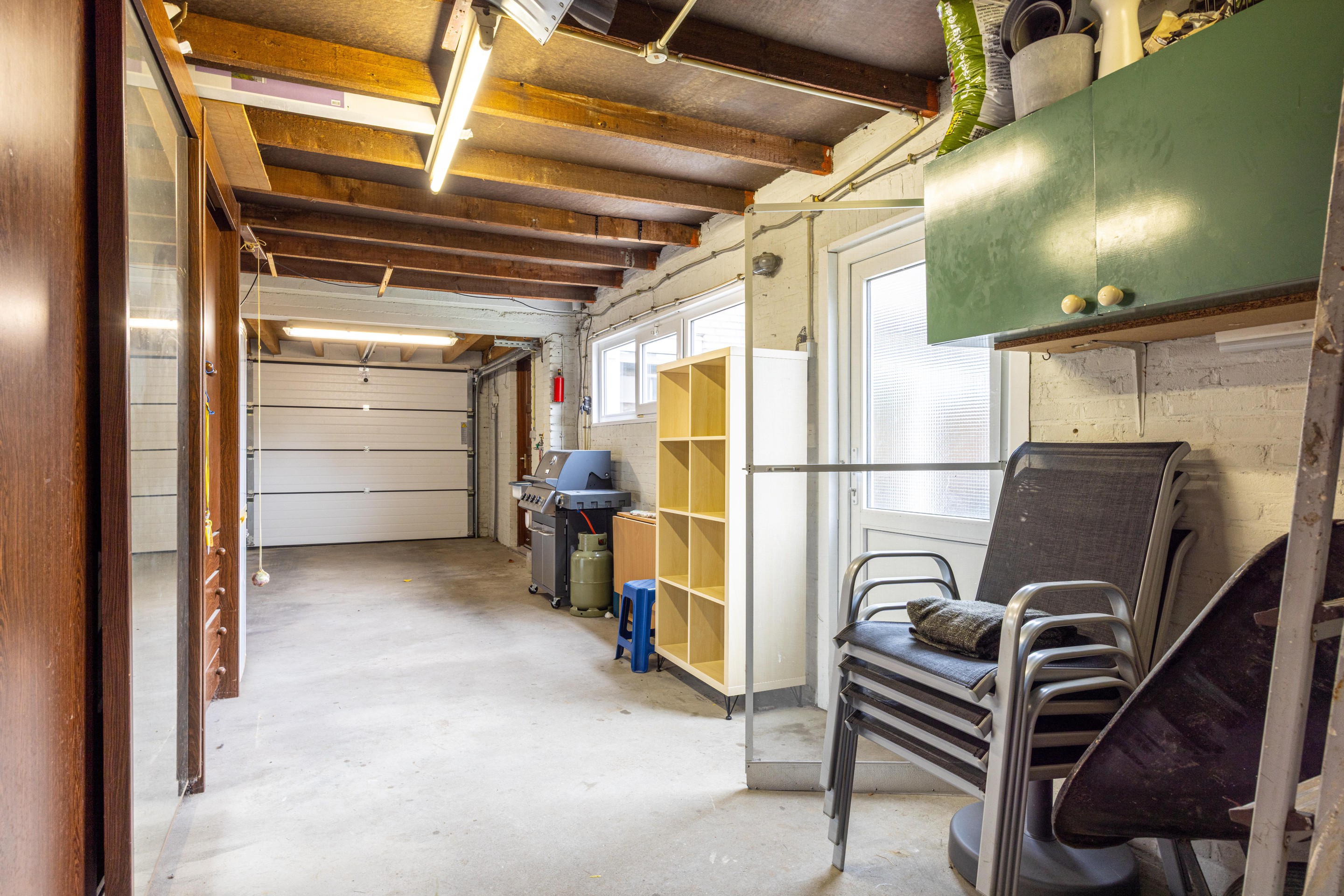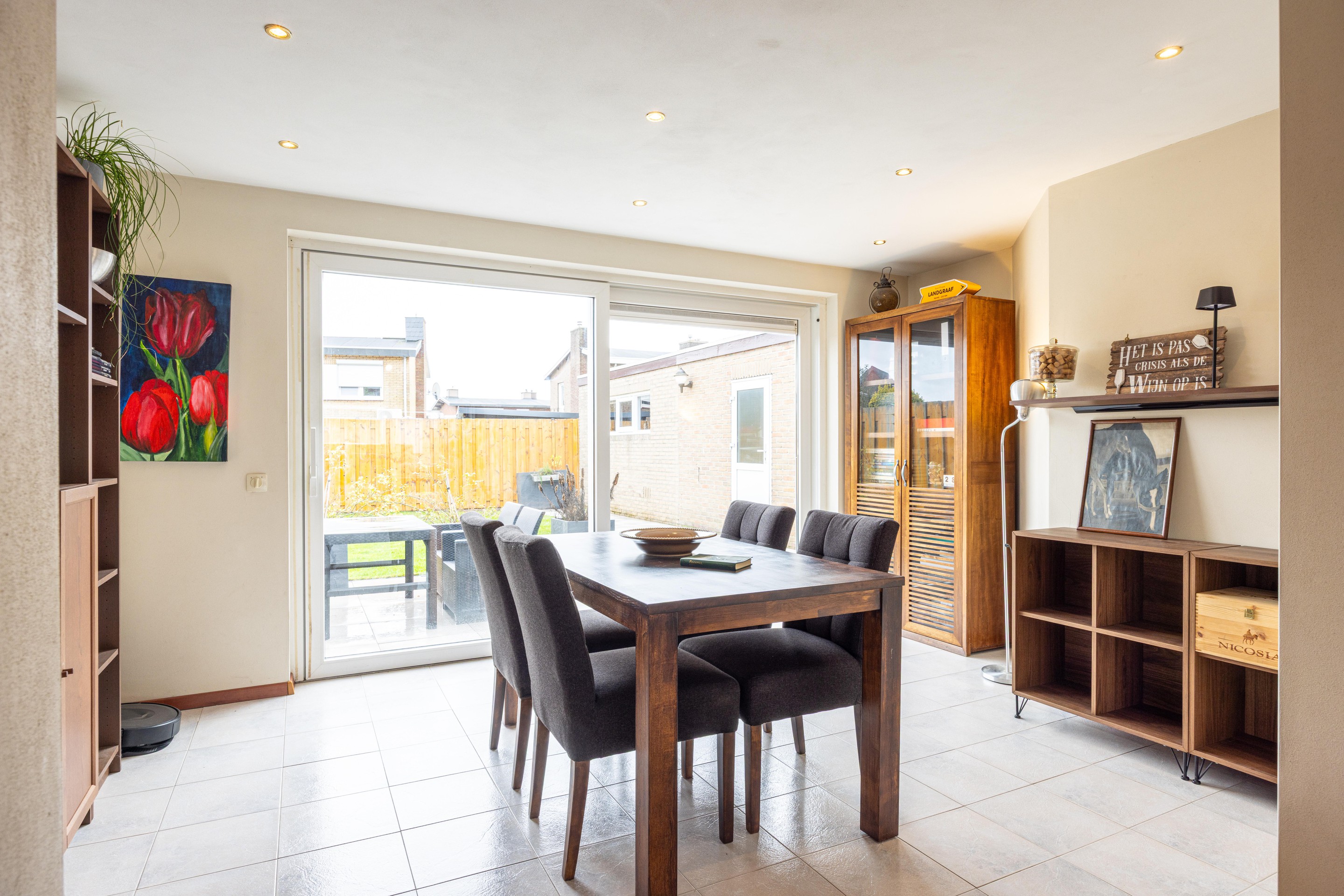 De woning beschikt over een lichte doorzonwoonkamer met parketvloer, een aparte eetkamer, een praktische gesloten keuken met inbouwapparatuur en aansluitend een bijkeuken die direct toegang geeft tot de garage. De garage is extra ruim, ideaal voor wie een hobbyruimte zoekt, graag sleutelt of gewoon veel bergruimte wil. Op de verdieping zijn drie slaapkamers, een moderne badkamer en een aparte wasruimte aanwezig. De overloop is voorzien van airconditioning, wat zorgt voor een prettig binnenklimaat.