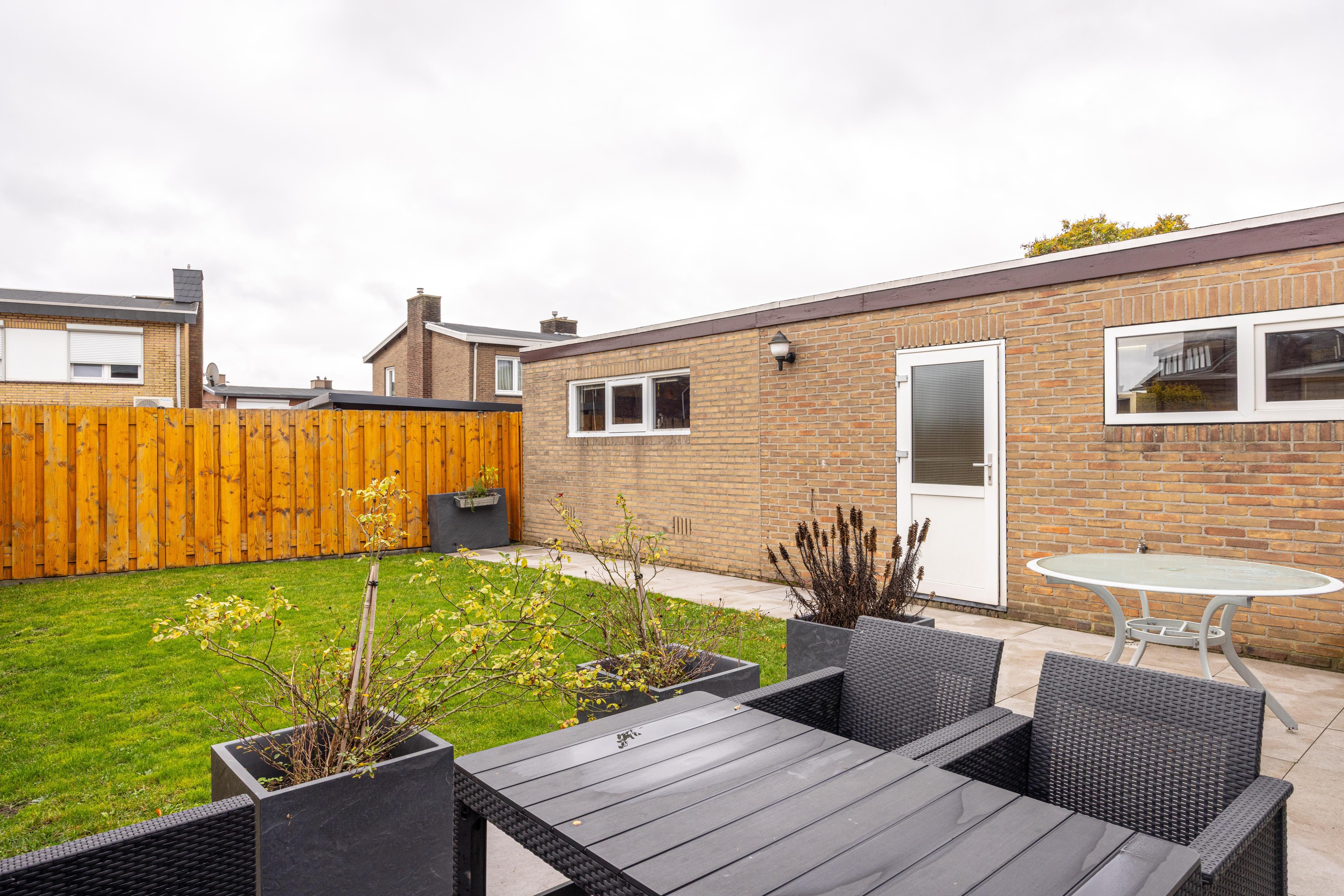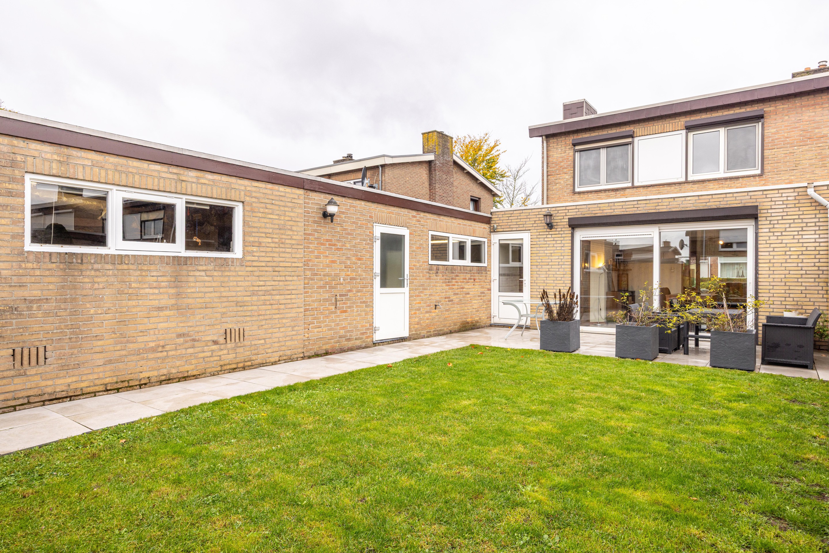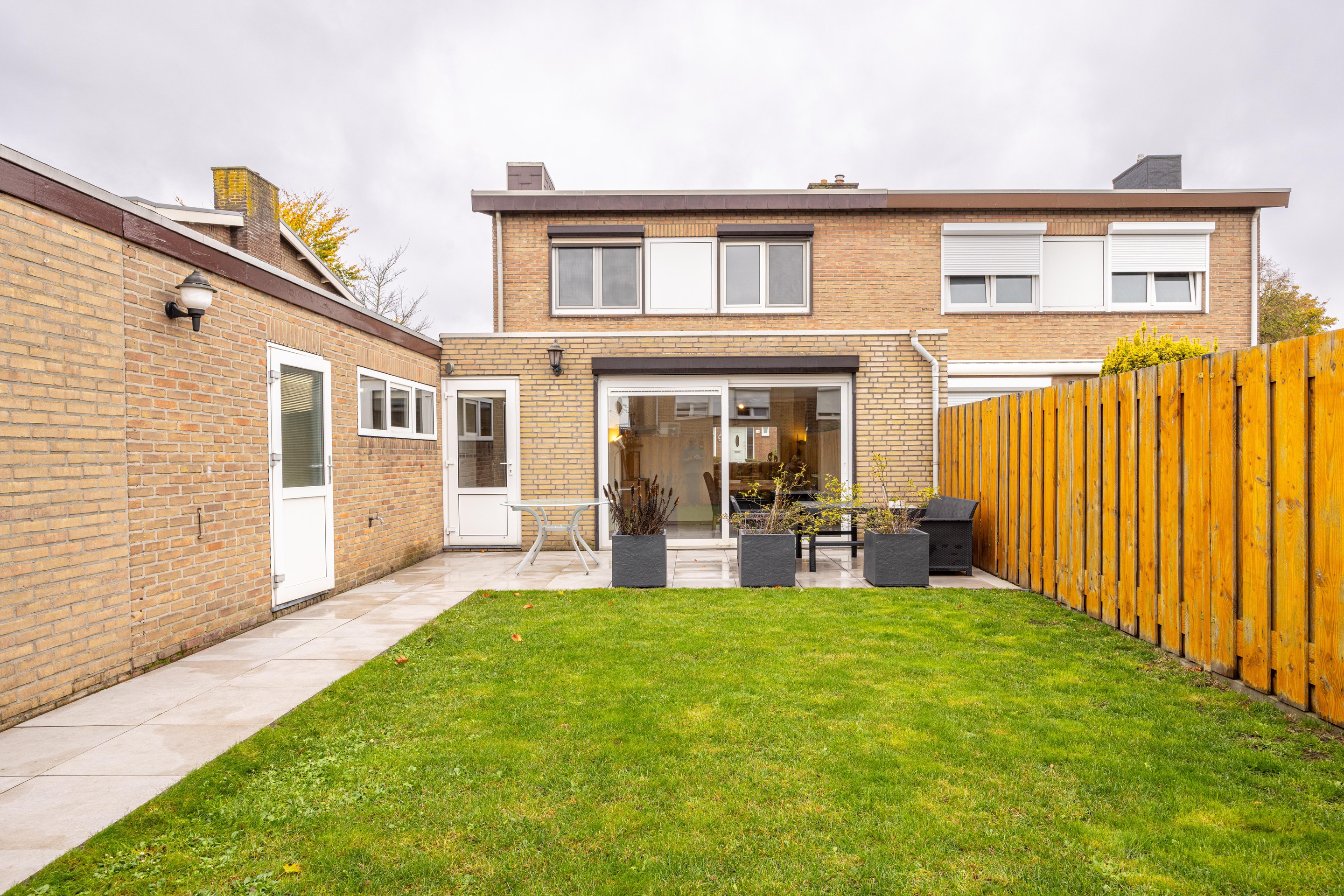 De voortuin is netjes aangelegd en de brede oprit biedt plaats aan meerdere auto’s. De achtertuin is verzorgd, grotendeels betegeld en voorzien van een stuk gazon, waardoor je er met weinig onderhoud optimaal van kunt genieten. Bovendien is er veel privacy.