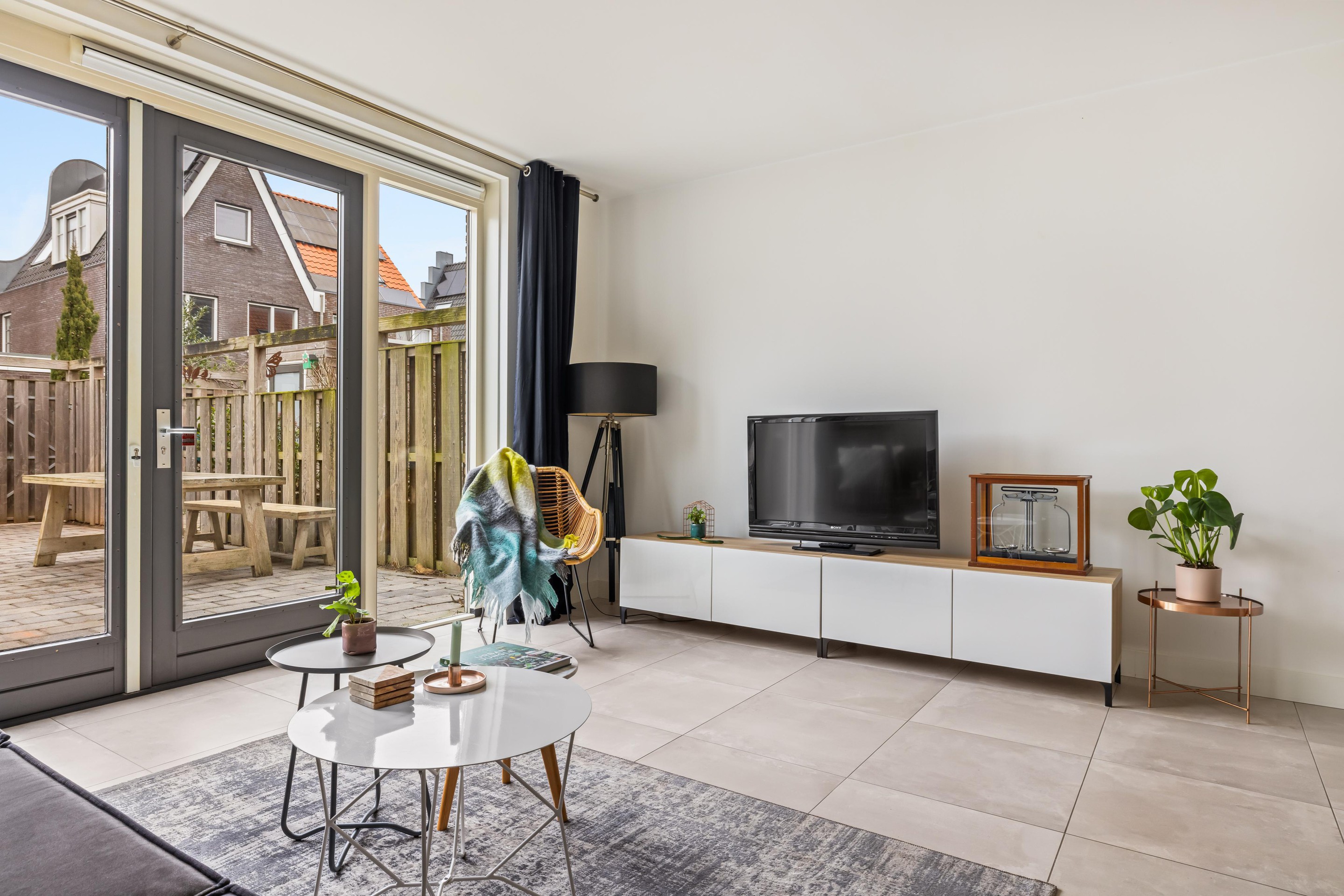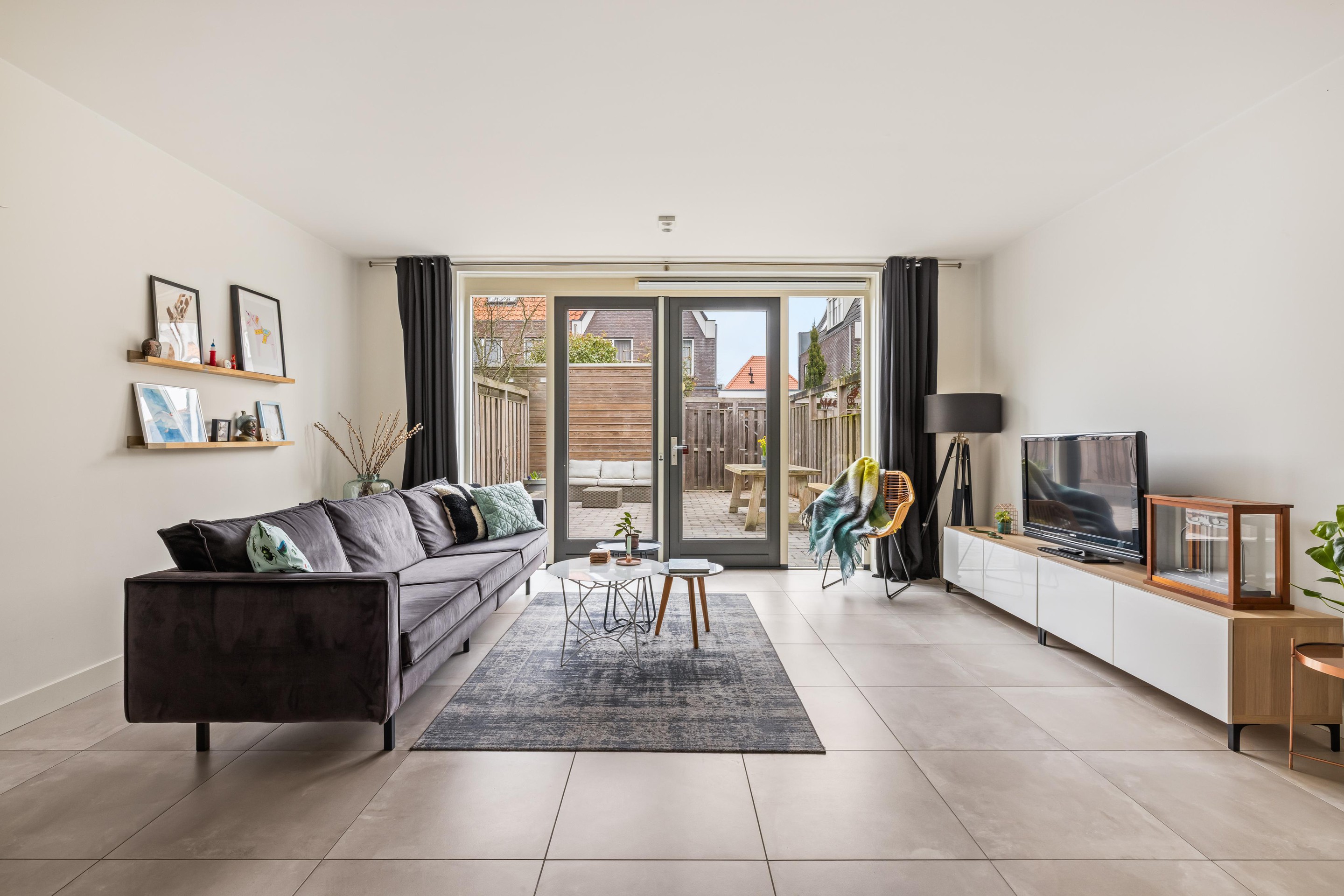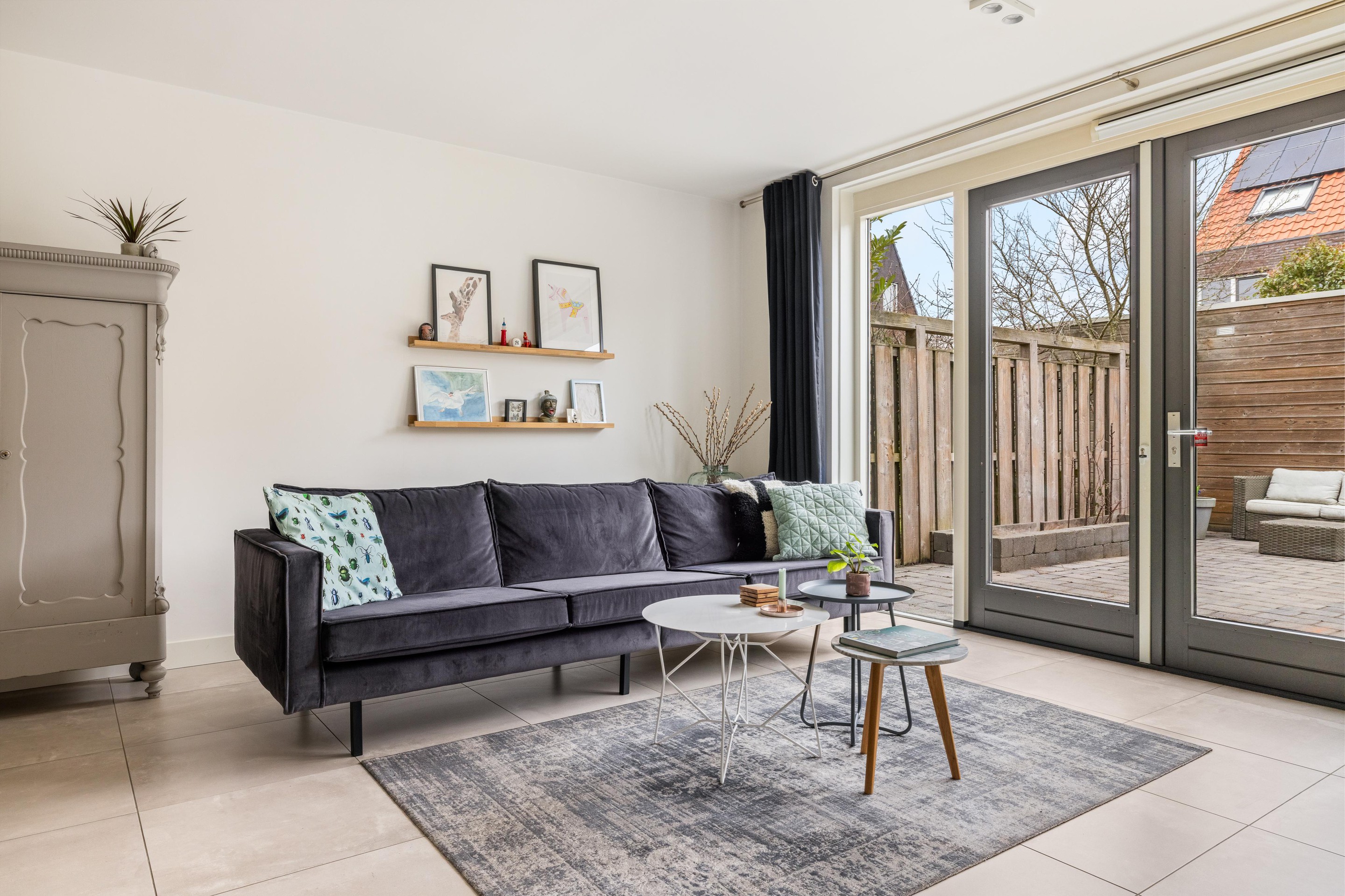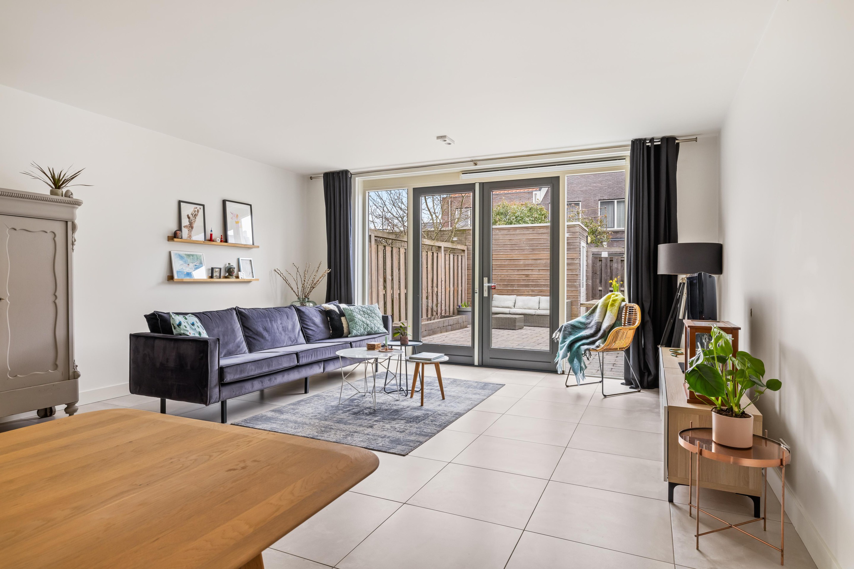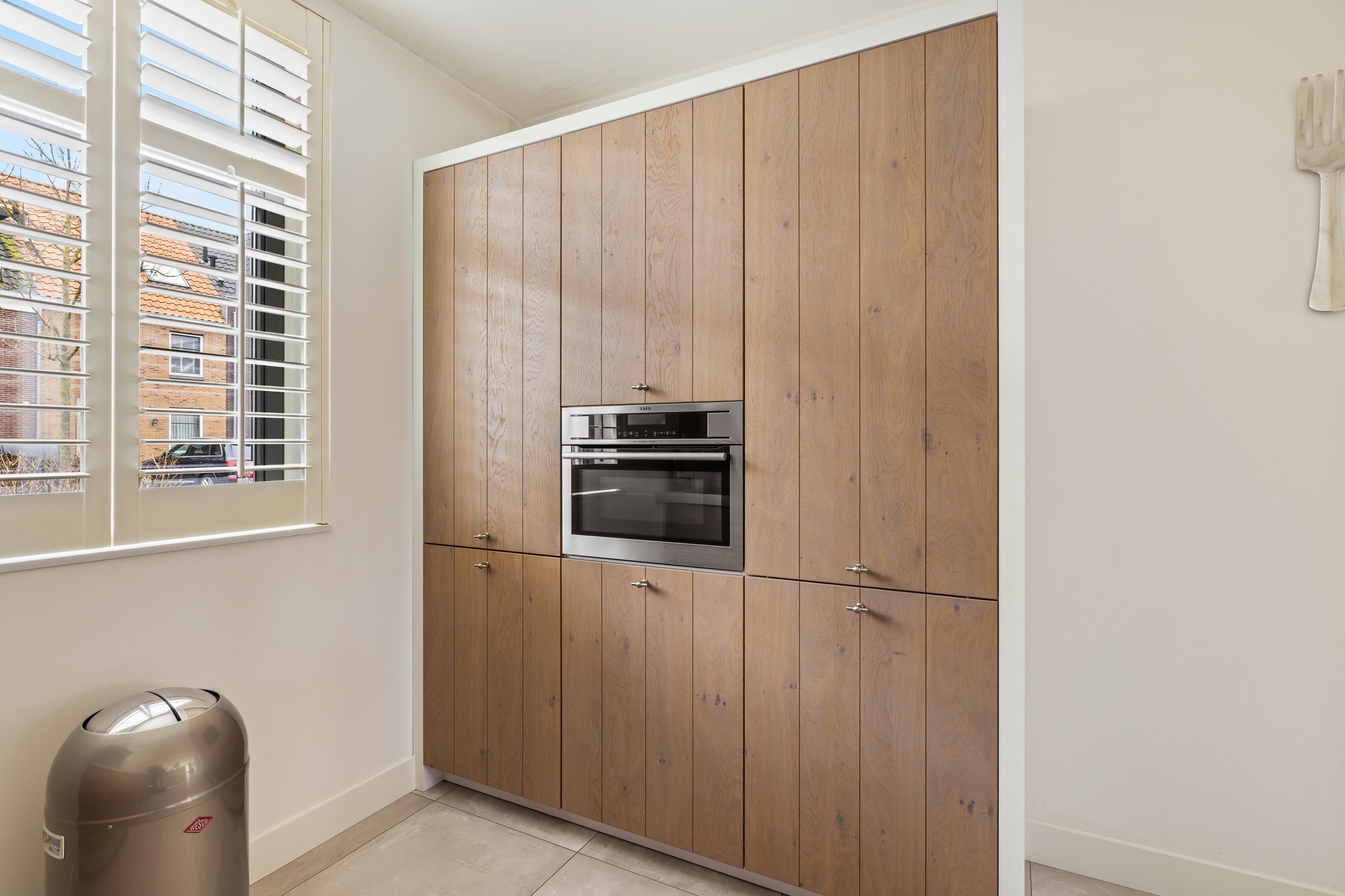 De gehele begane grond is afgewerkt met een fraaie, grote grijze tegelvloer en voorzien van comfortabele vloerverwarming. Onder de trap bevindt zich een praktische bergkast.