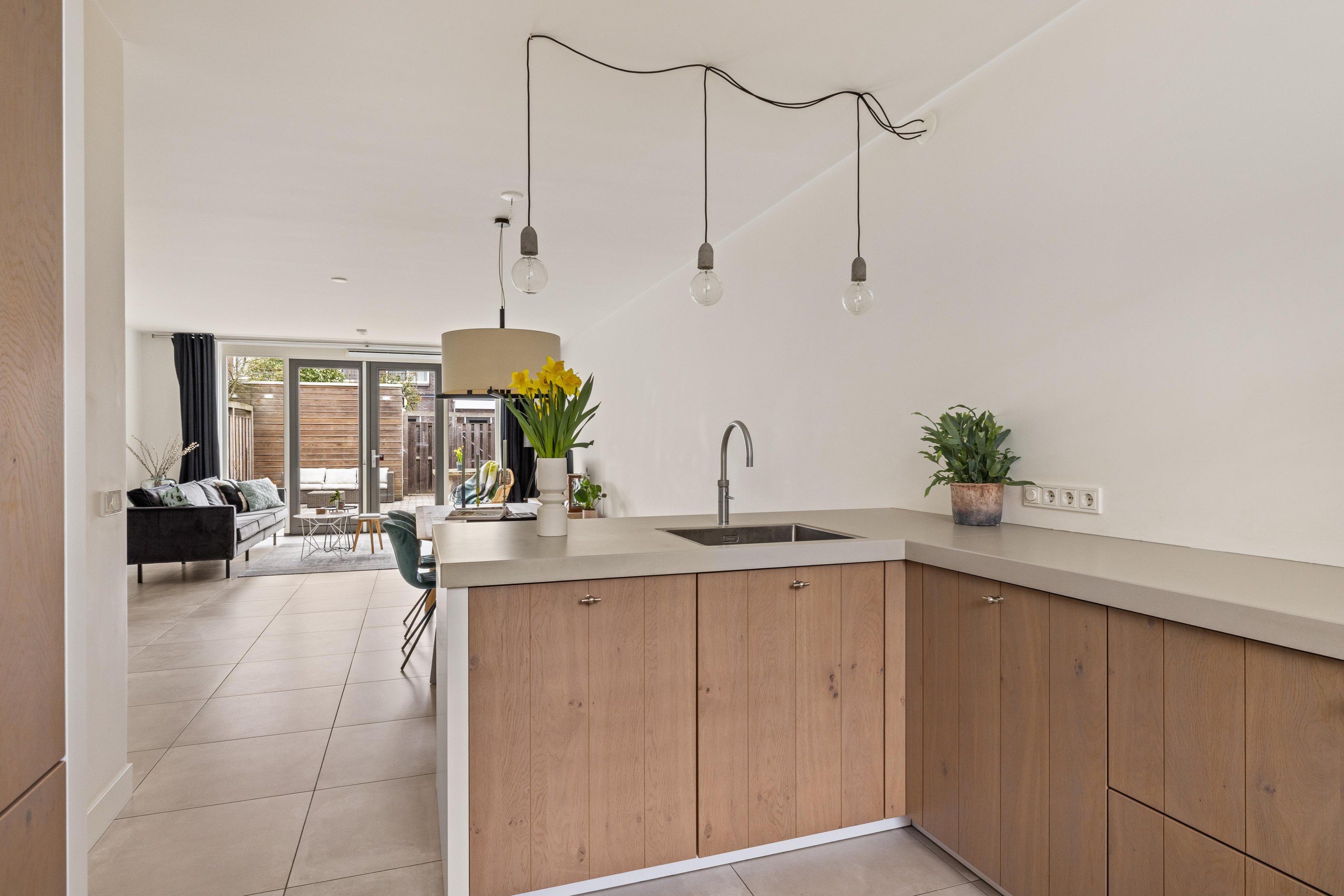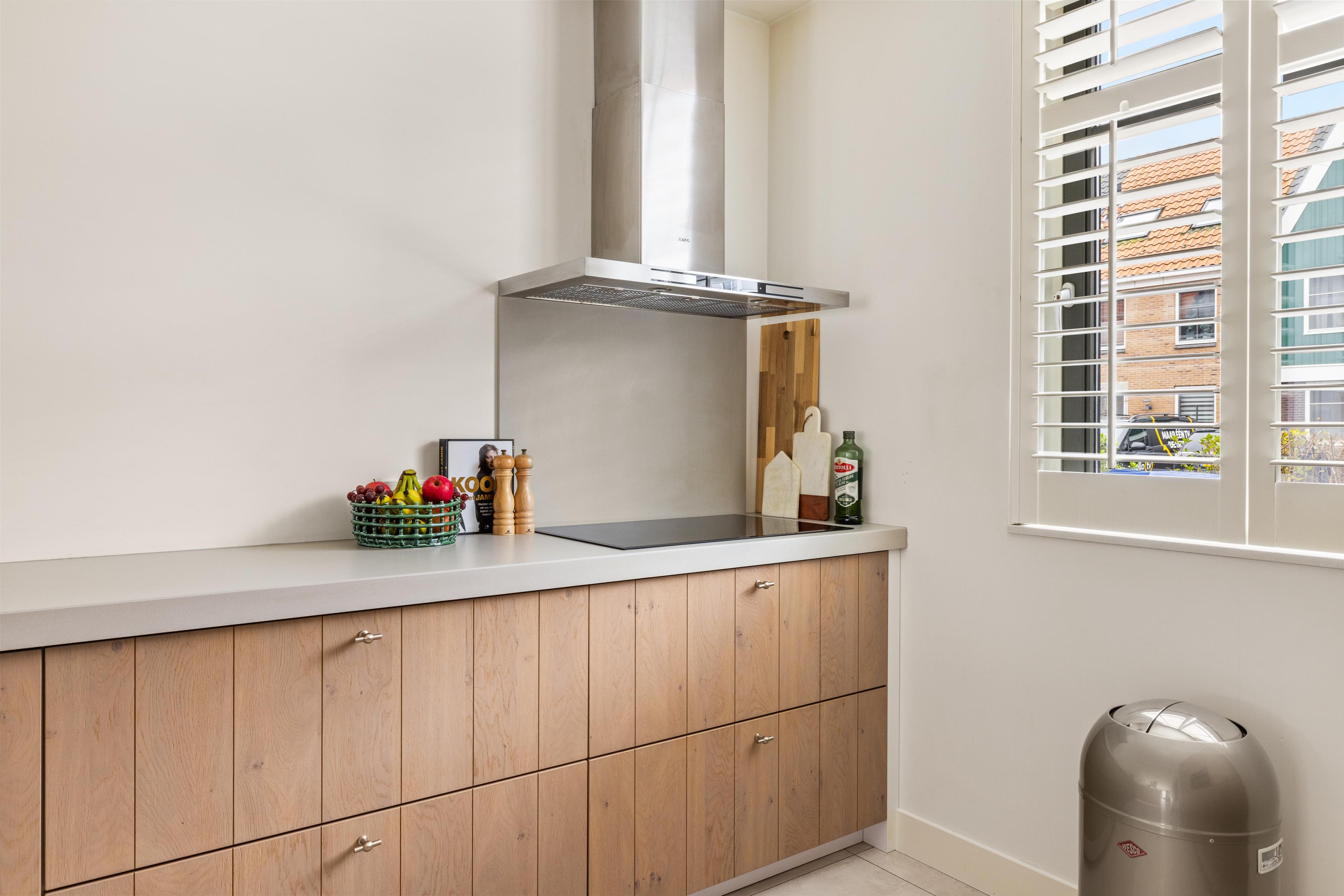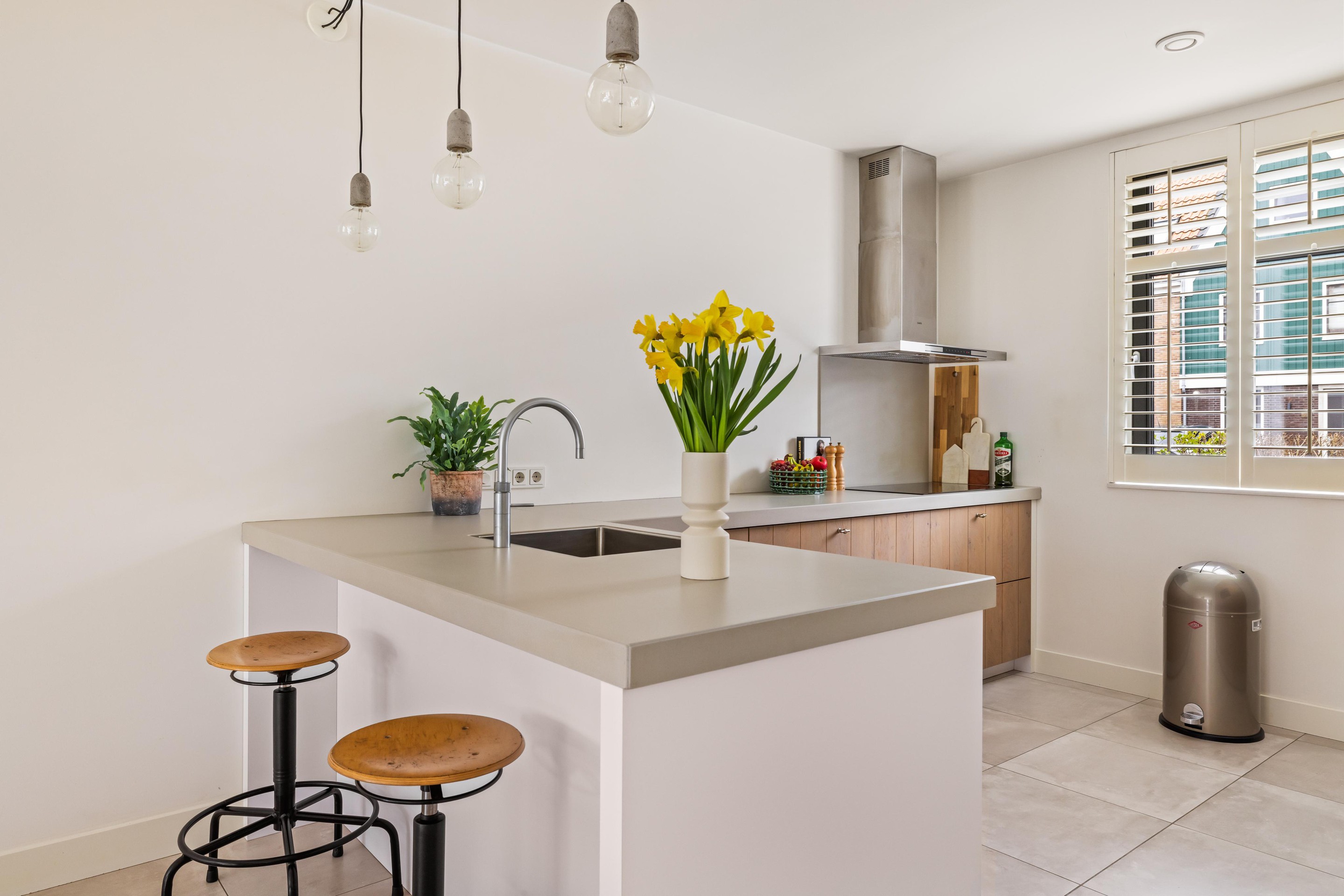 De moderne keuken is van alle gemakken voorzien, waaronder een combi-oven/magnetron, koelkast, vaatwasser, inductiekookplaat en een Quooker. Het gezellige barretje maakt het geheel compleet: ideaal om ’s ochtends rustig te ontbijten of gezellig bij te praten terwijl u kookt.