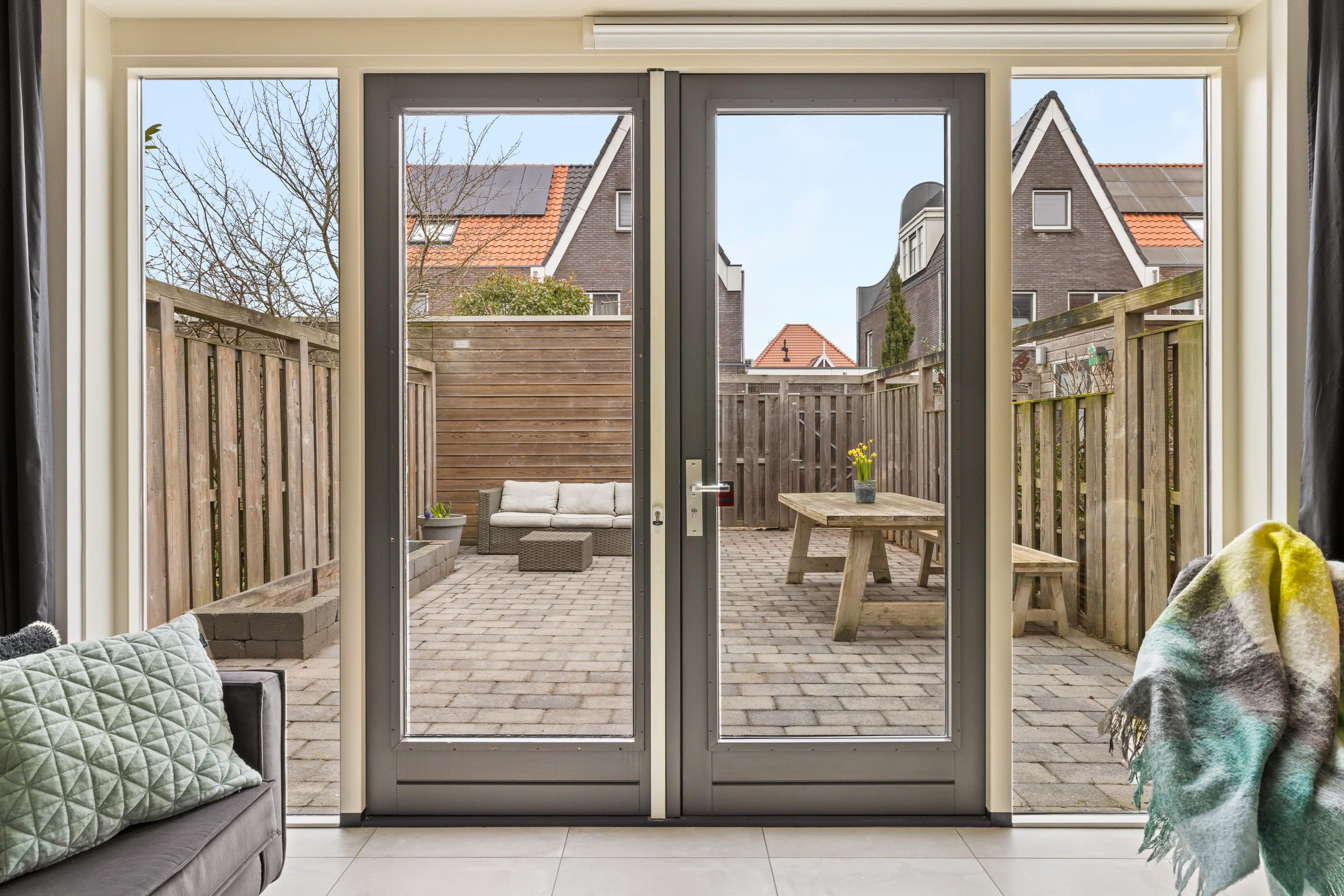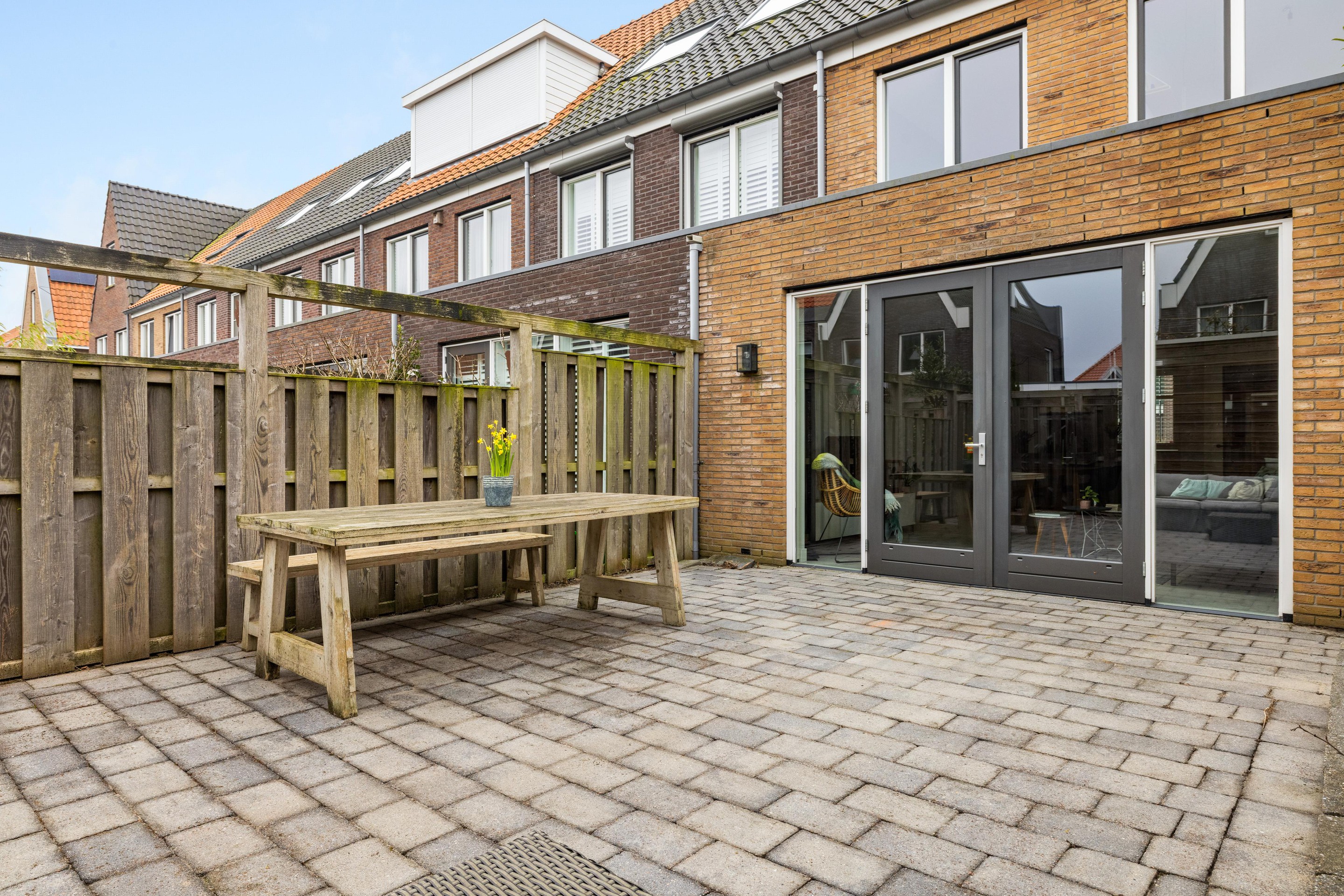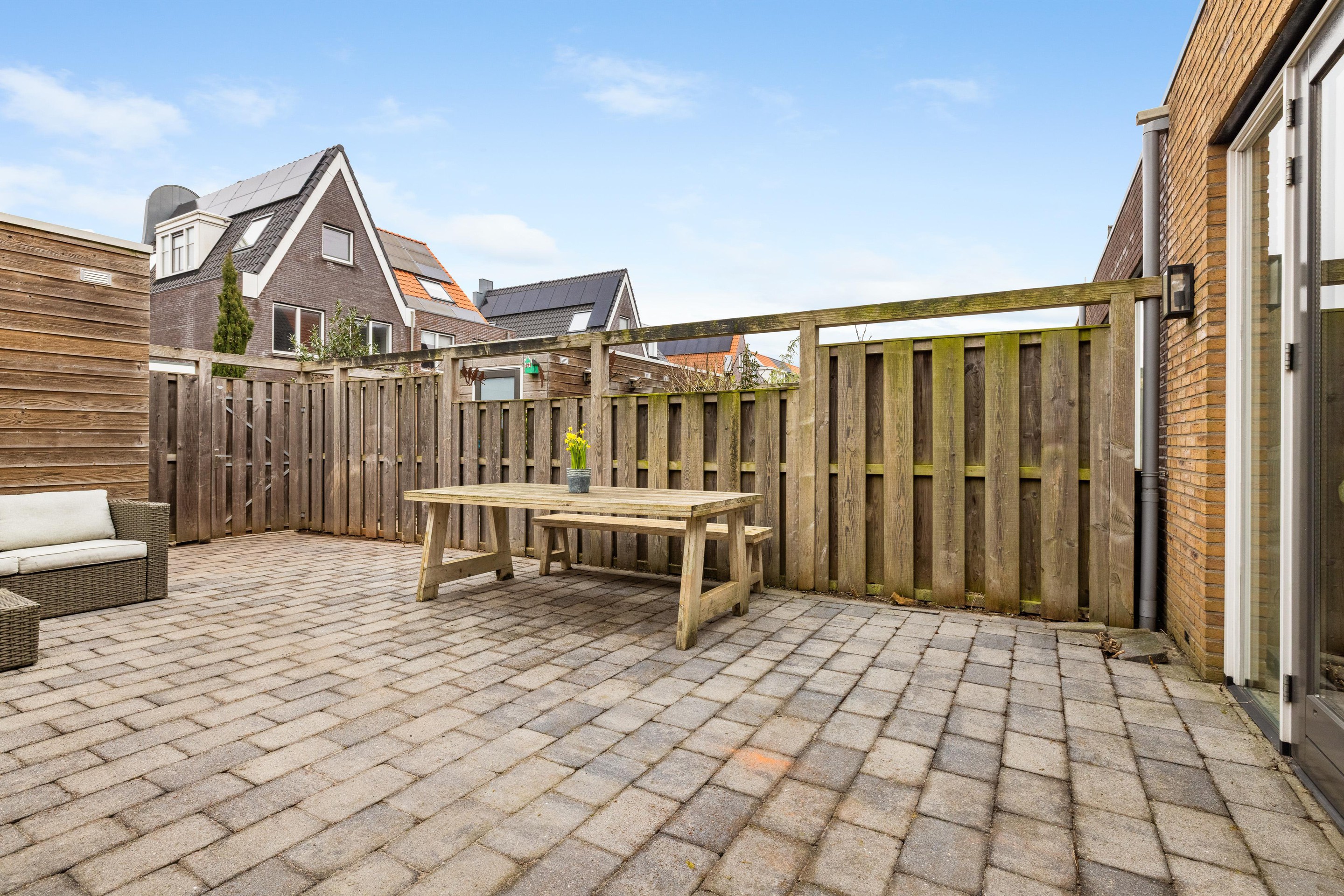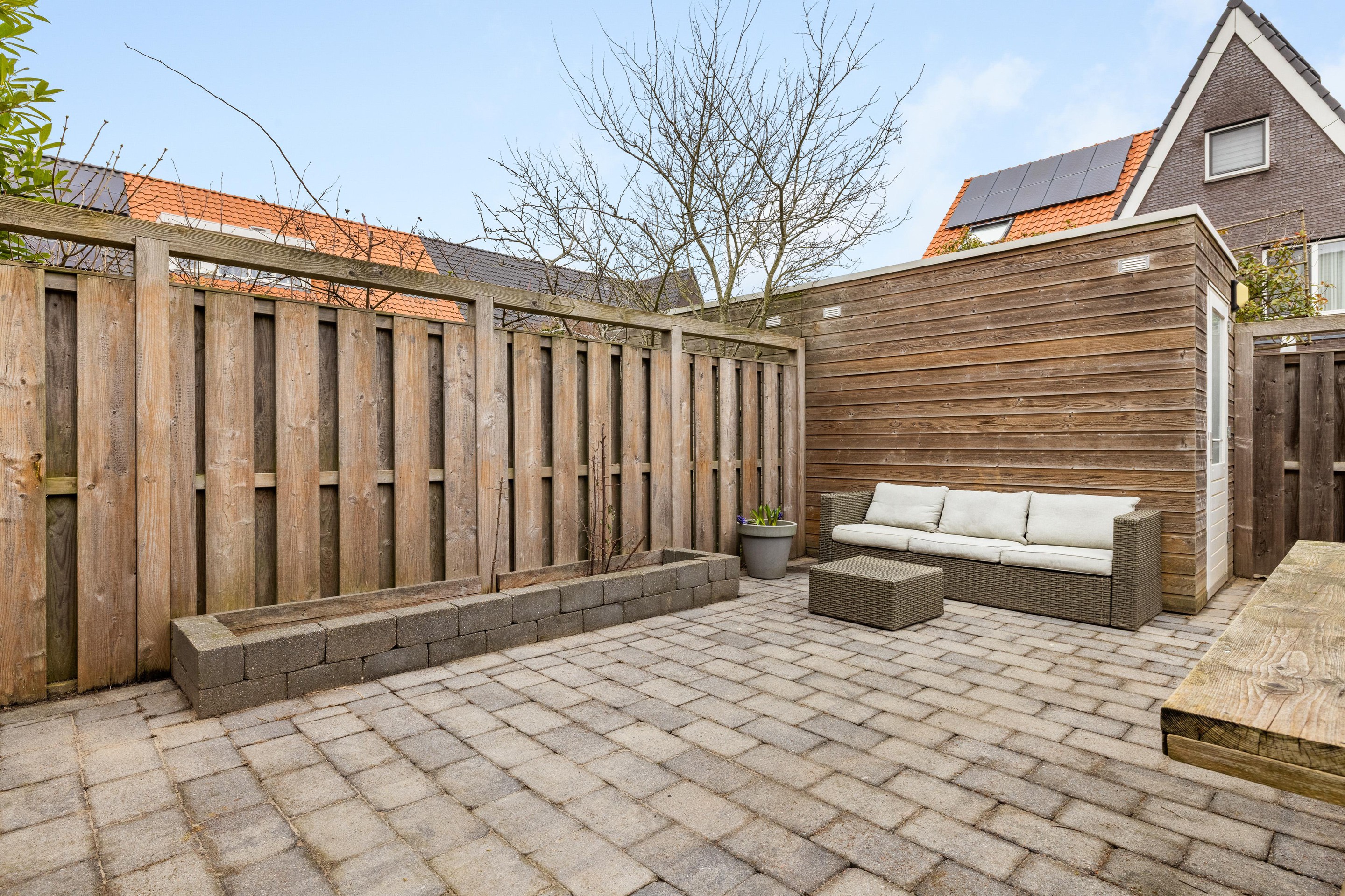 Aan de achterzijde geven openslaande deuren toegang tot de sfeervolle achtertuin van ca. 50 m2. Hier kunt u heerlijk genieten van rust en privacy. De tuin beschikt over een praktische berging van ca. 6 m2 en een achterom.