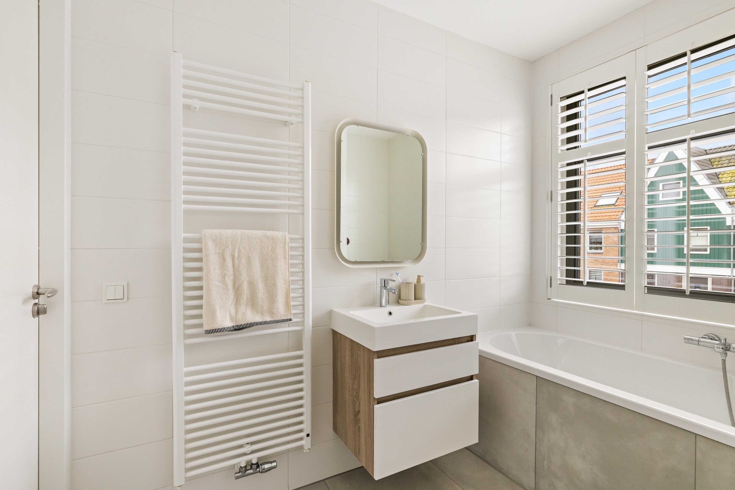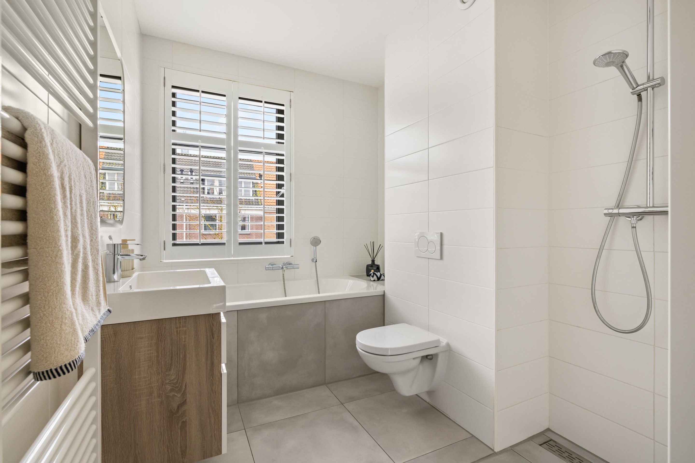 De moderne badkamer is compleet uitgevoerd met een ligbad, douche, toilet en wastafel. Ook deze verdieping is volledig voorzien van vloerverwarming.