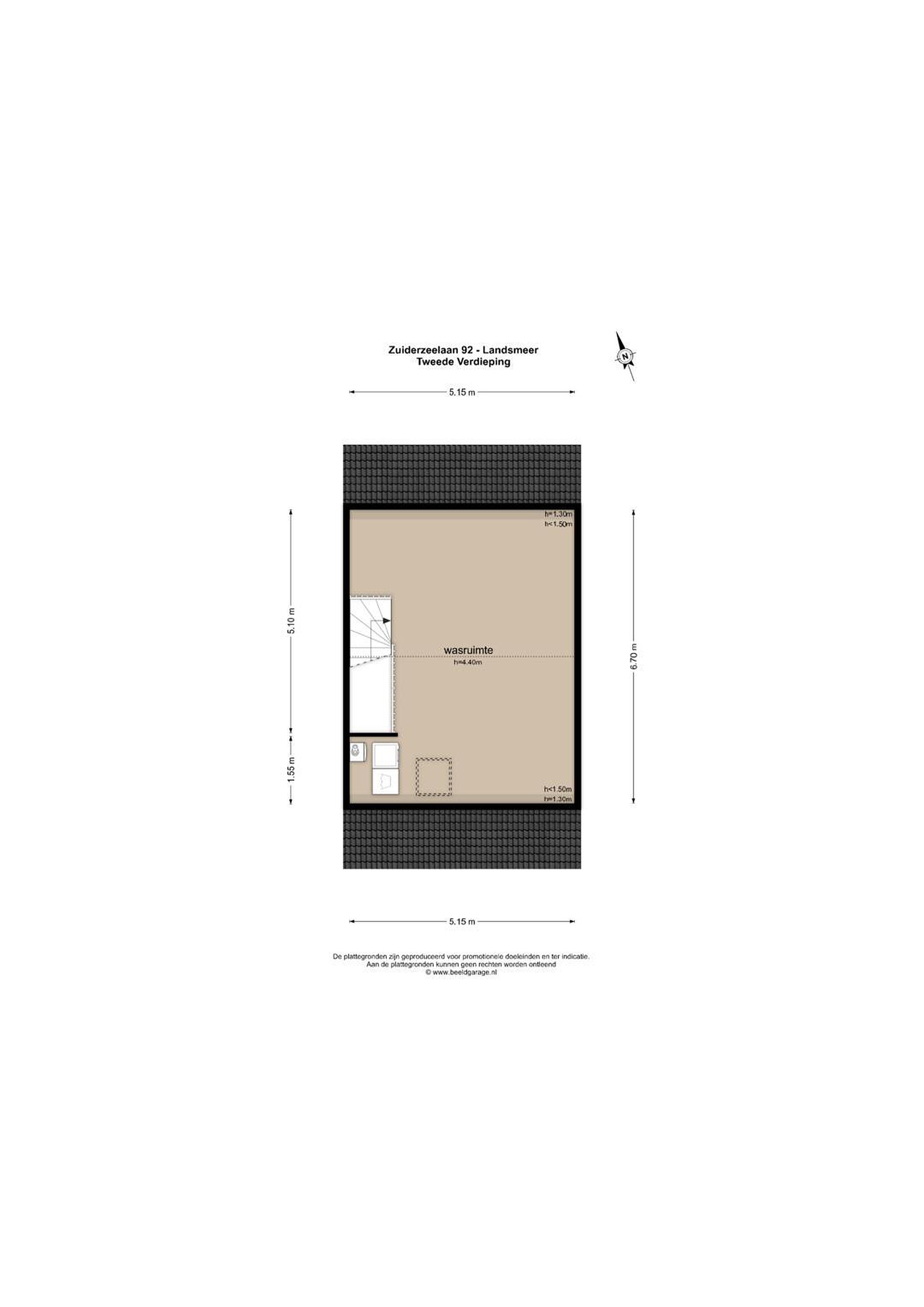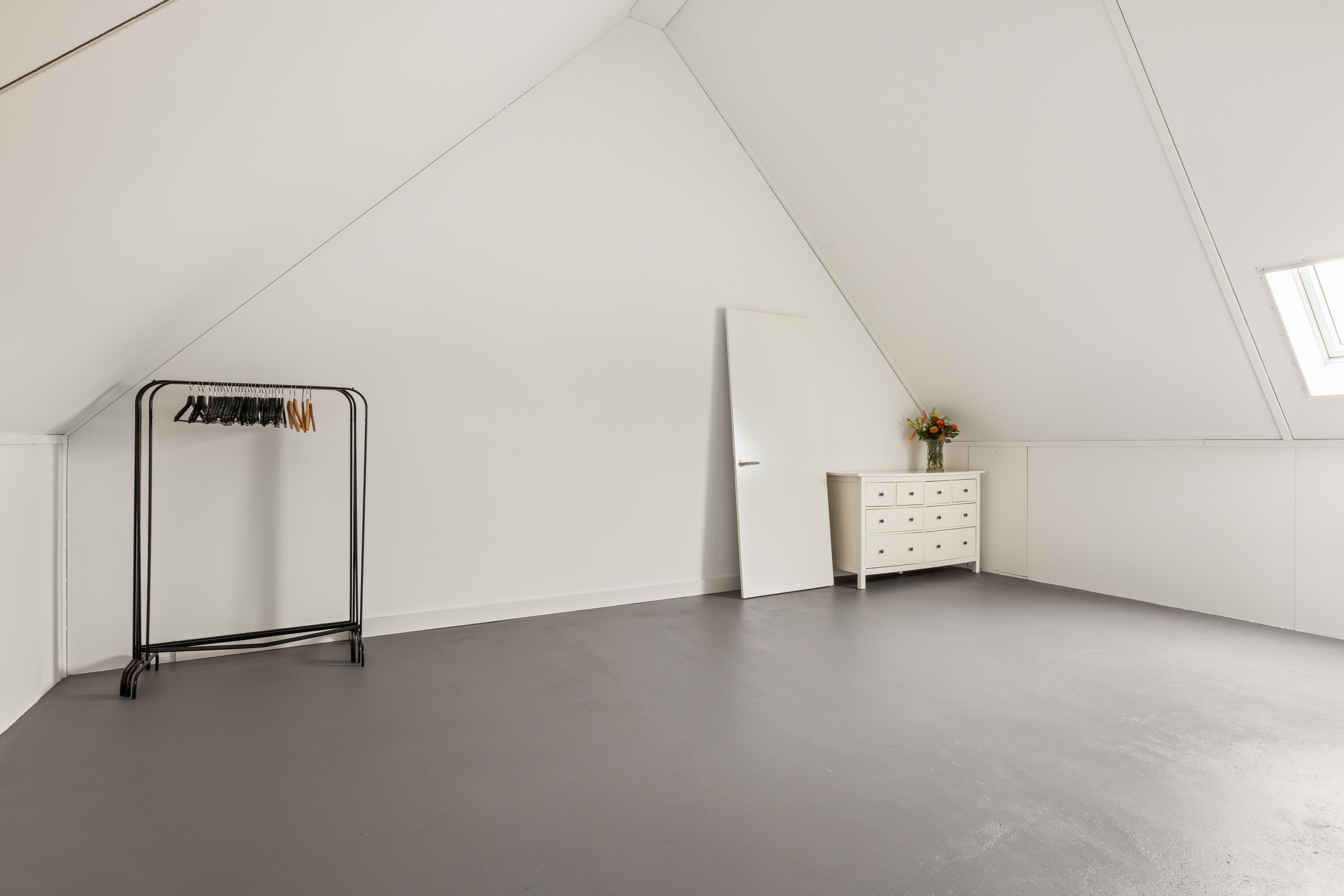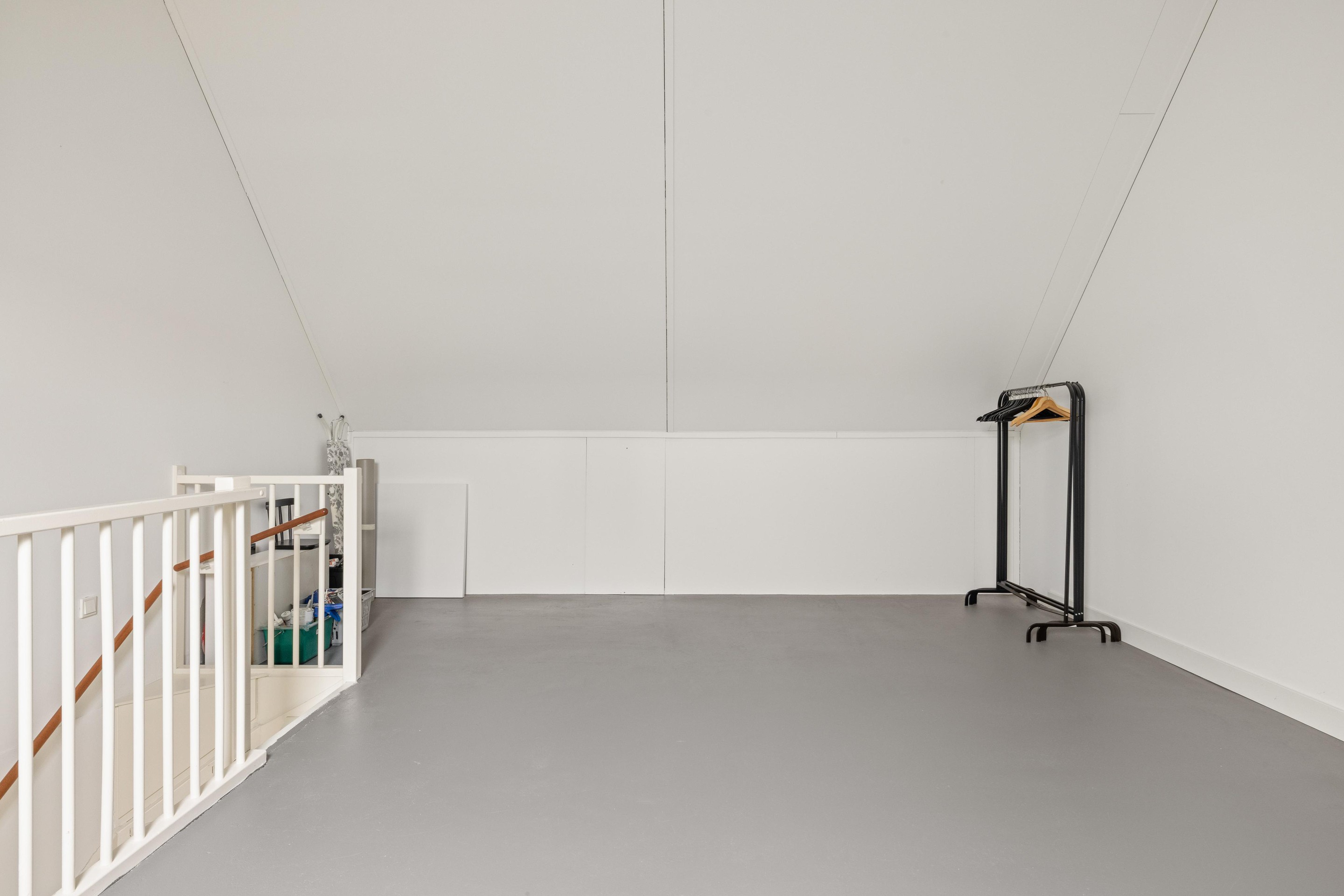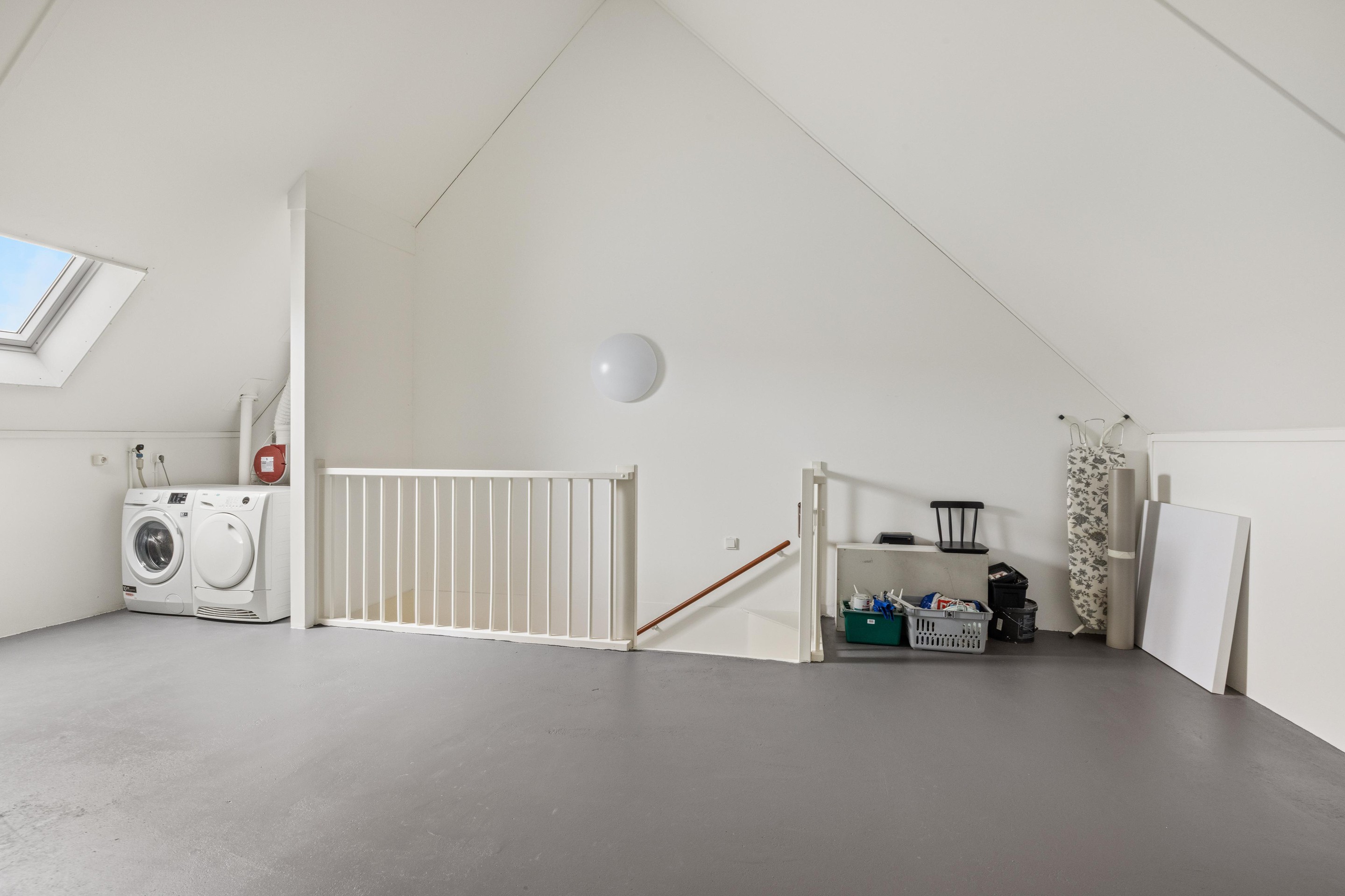 De tweede etage is momenteel een royale open ruimte van ca. 35 m2 met een indrukwekkende nokhoogte van maar liefst 4.44 meter. Hier bevinden zich tevens de opstelplaatsen voor de wasmachine en droger.