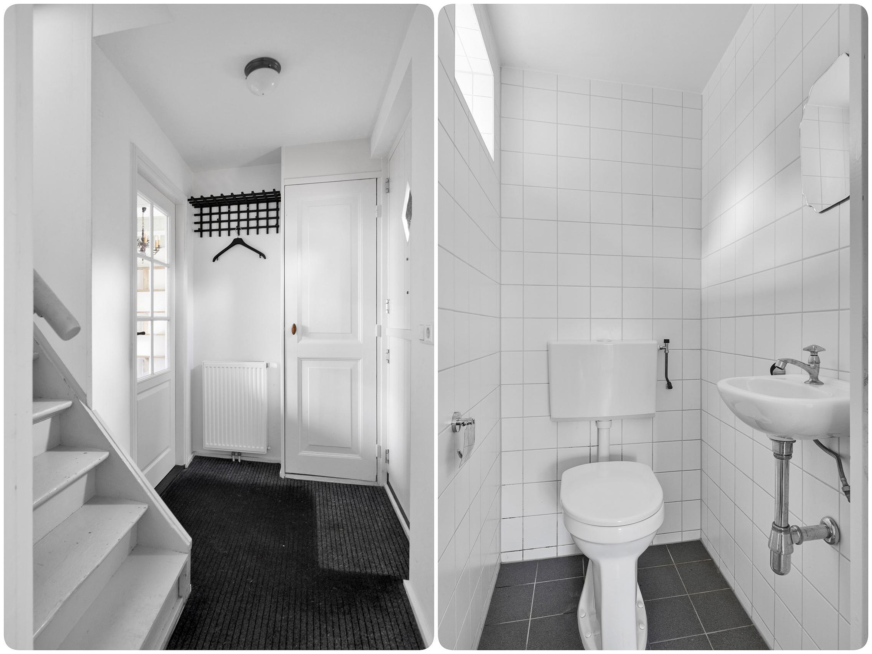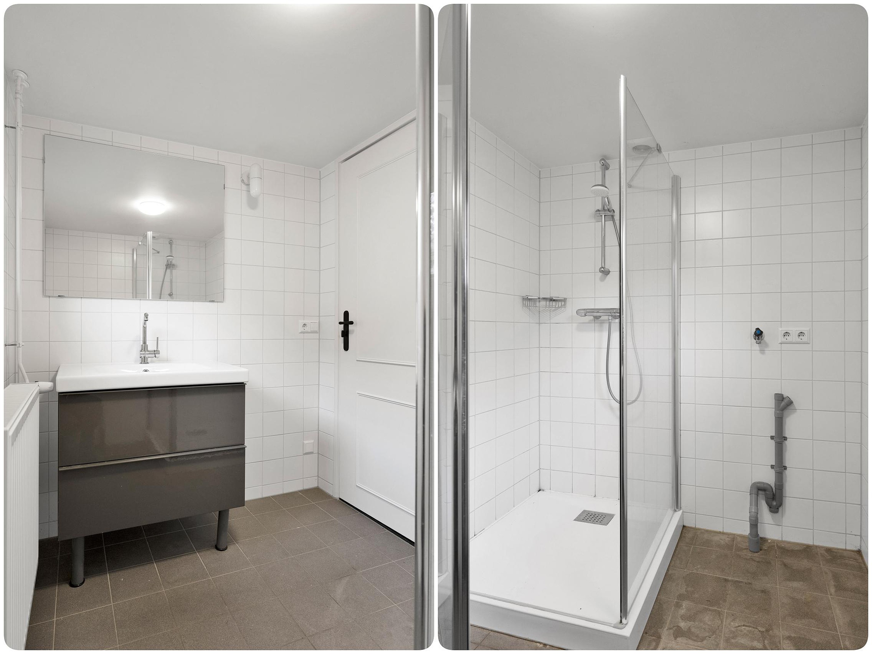 Via de hal is ook het toilet, de badkamer met douche, wastafelmeubel en aansluiting voor de wasmachine, en de slaapkamer toegankelijk.
