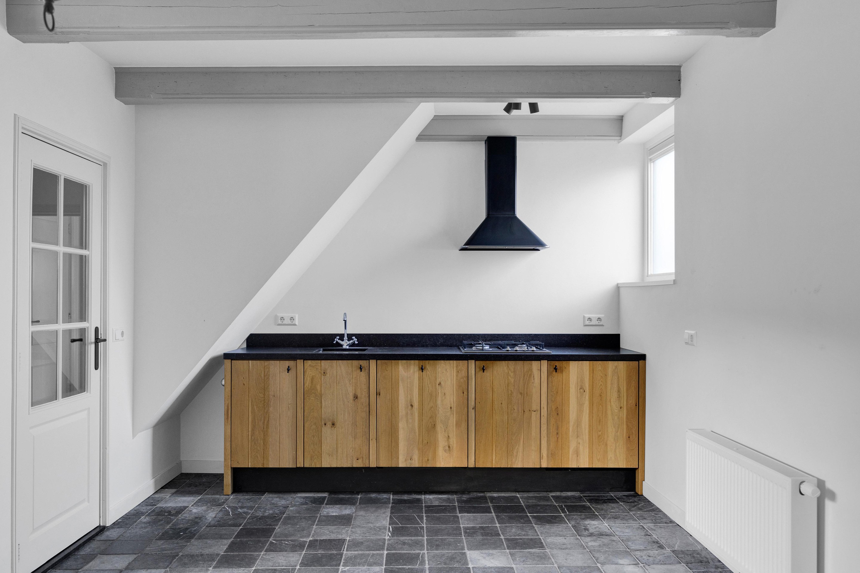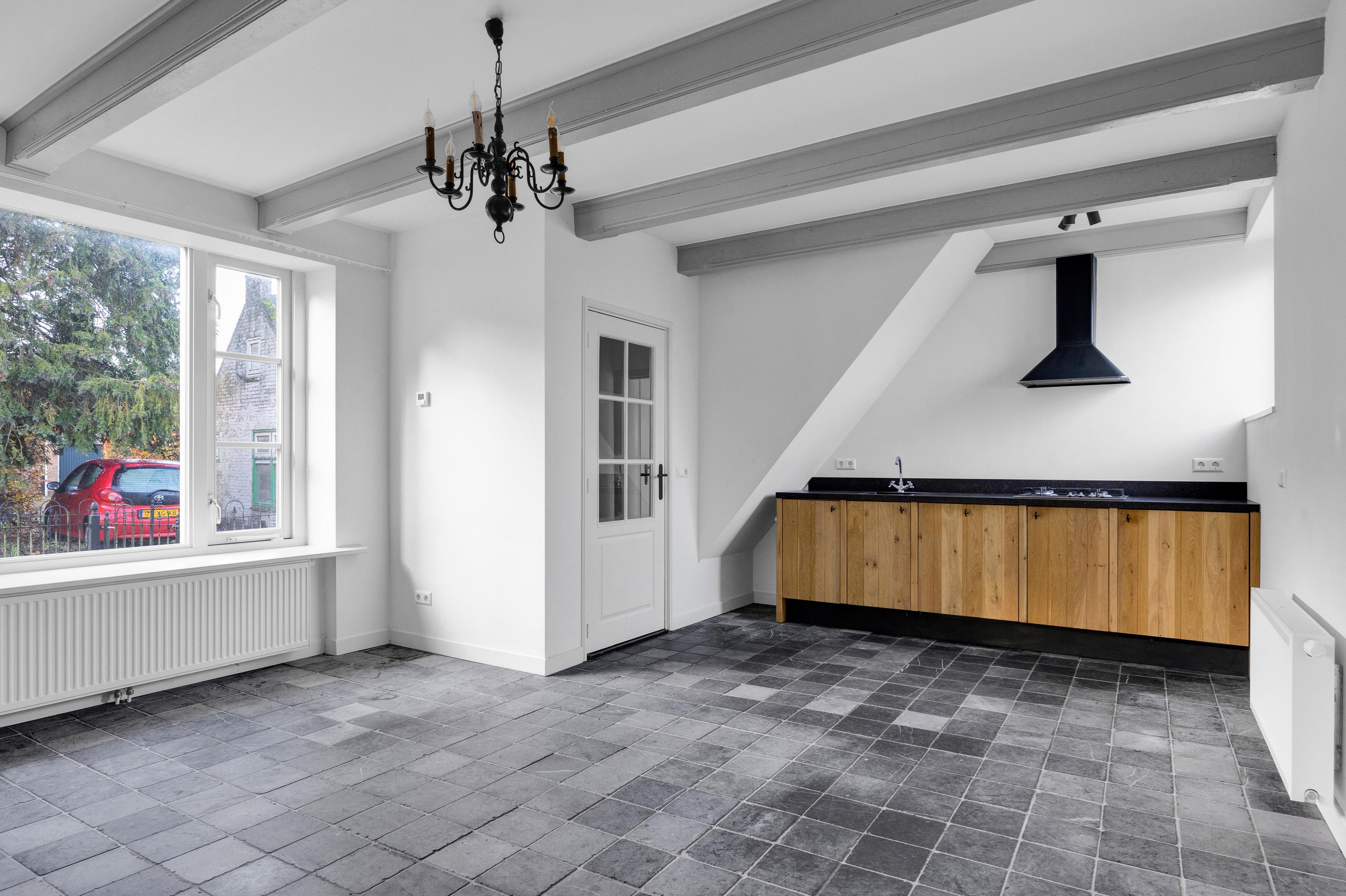 We betreden de woning via de voordeur en komen in de hal met meterkast, trapopgang en toegang tot de sfeervolle en knusse woonkamer met balkenplafond, schouw met boekenkast en open keuken met rechte keukenopstelling geheel in stijl, welke voorzien is van diverse inbouwapparatuur zoals; koelkast, gaskookplaat, afzuigkap en vaatwasser.