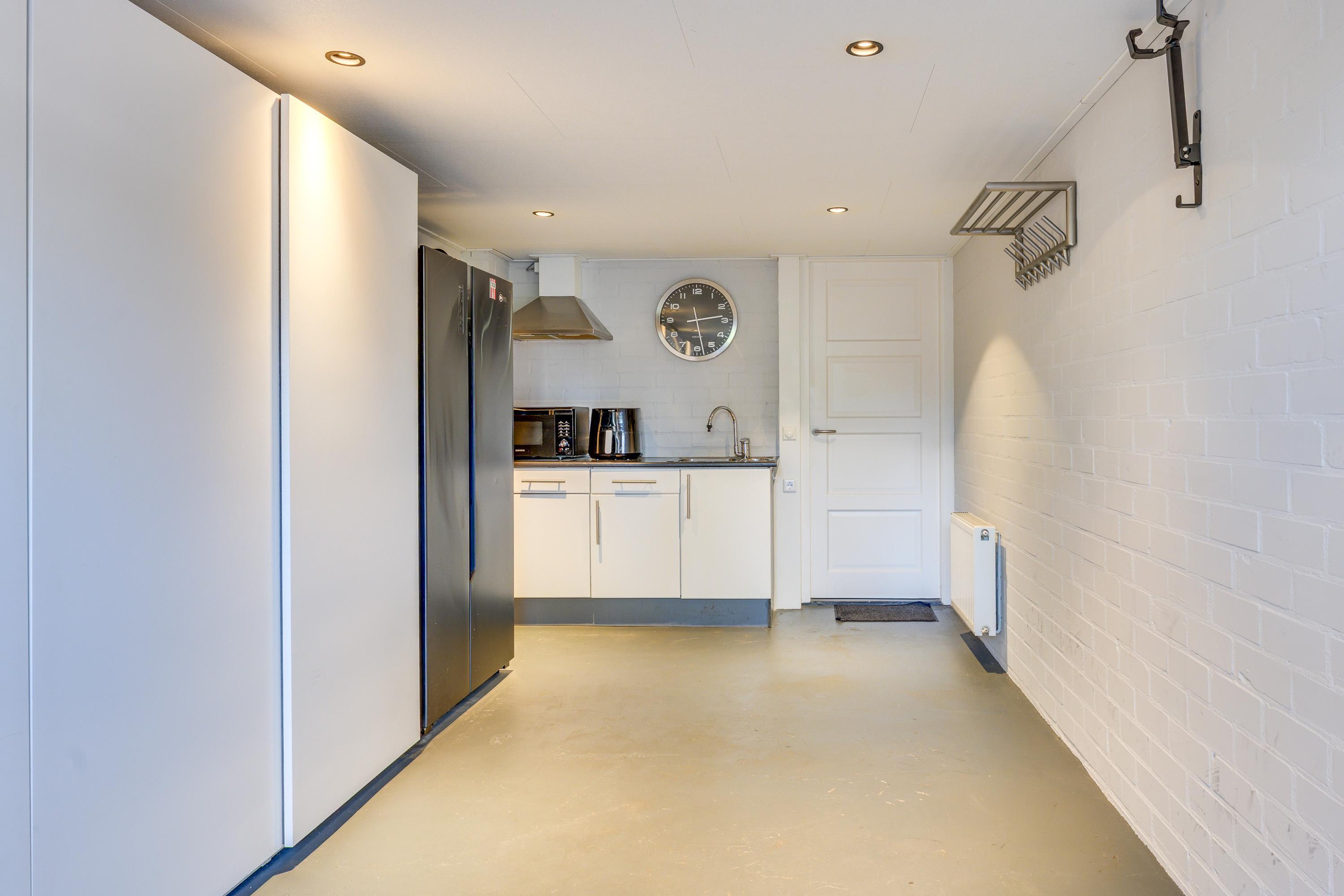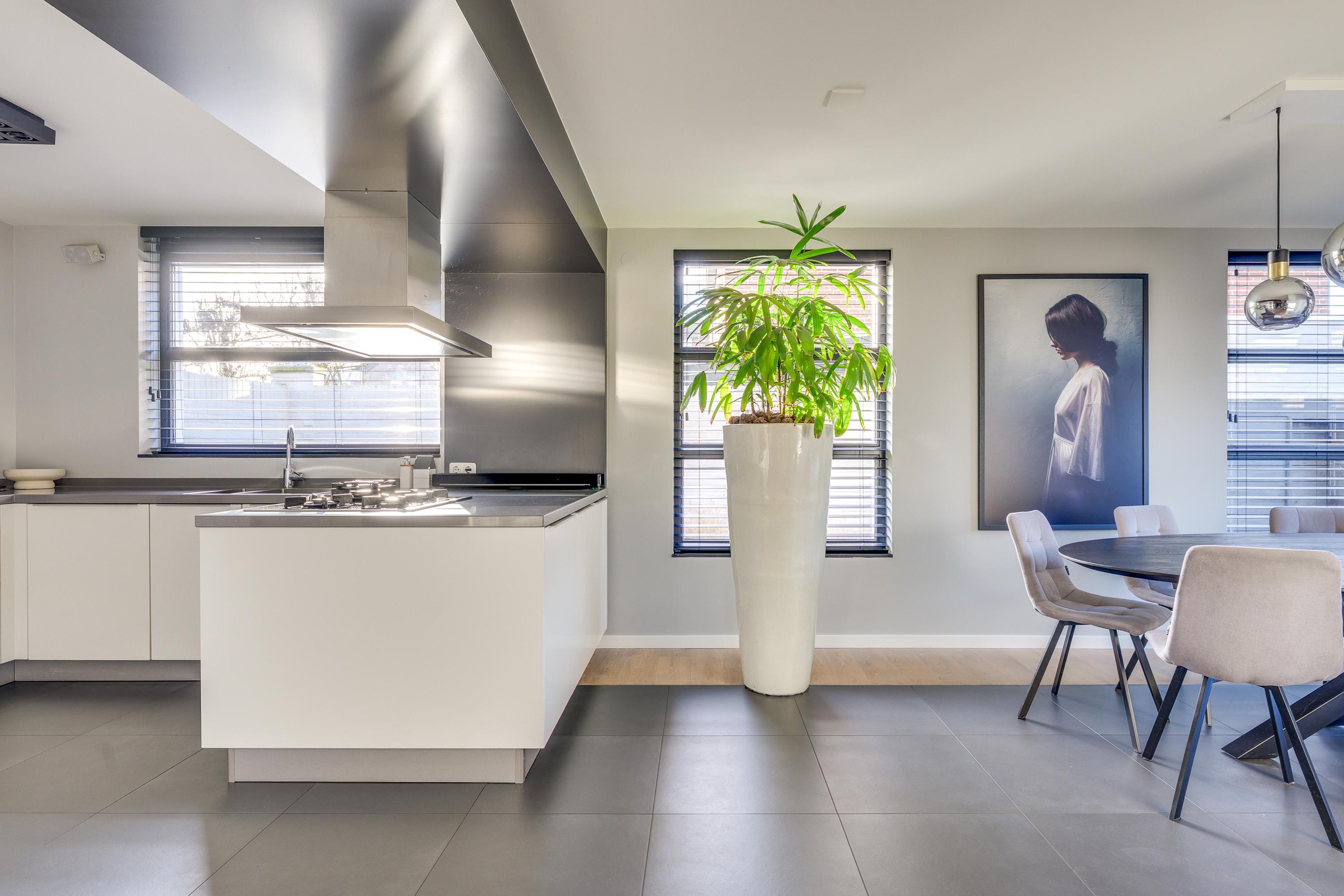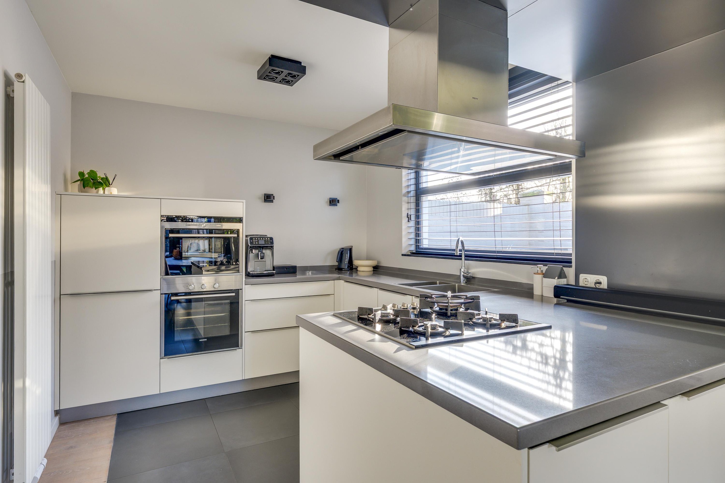 De tuingerichte woonkamer is sfeervol en warm dankzij de massief houten vloer en strakke schouw met haard. Grote raampartijen zorgen voor een prettige lichtinval en een fijne verbinding met buiten. Aan de achterzijde bevindt zich de riante open leefkeuken: een echte eyecatcher. Deze luxe keuken is compleet uitgerust met diverse inbouwapparatuur, een composiet werkblad in lichte tint en een extra breed blad aan de eetkamerzijde, perfect als eetbar voor een ontbijt of gezellige borrel.