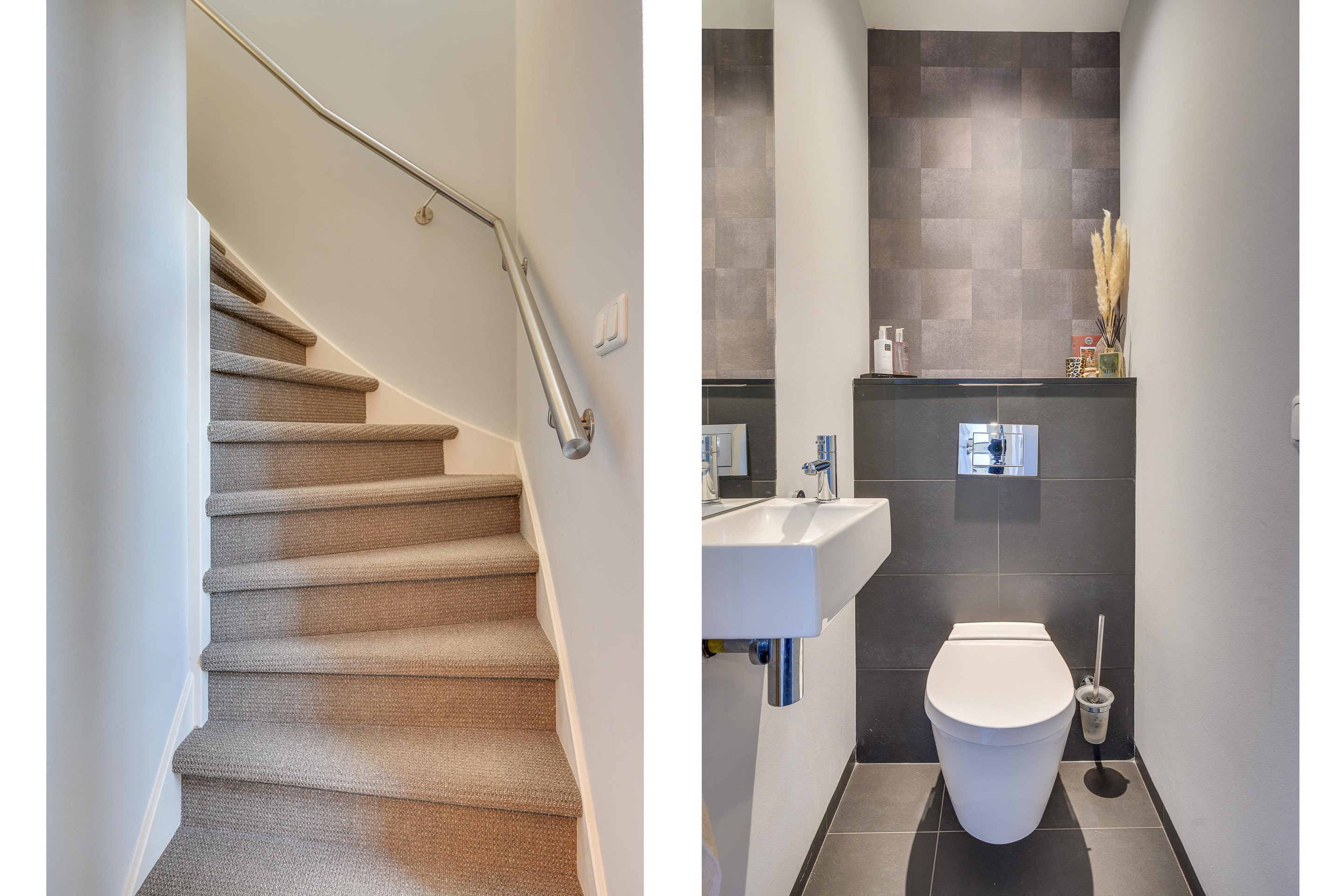 Begane grond Via de hal, afgewerkt met een fraaie tegelvloer die is doorgelegd in de eetkamer, keuken en bijkeuken (voorzien van vloerverwarming), betreed je de woning. De luxe toiletruimte is modern uitgevoerd met een hangend closet en fonteintje. De meterkast beschikt over een uitgebreide groepenkast passend bij deze moderne woning en de lichte trapopgang geeft toegang tot de verdiepingen.