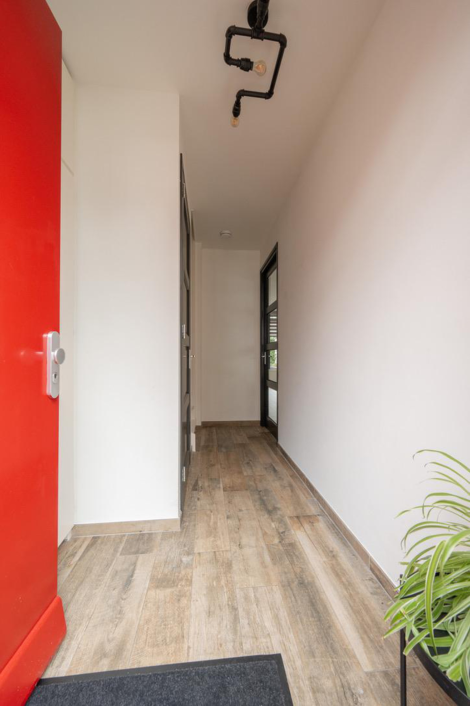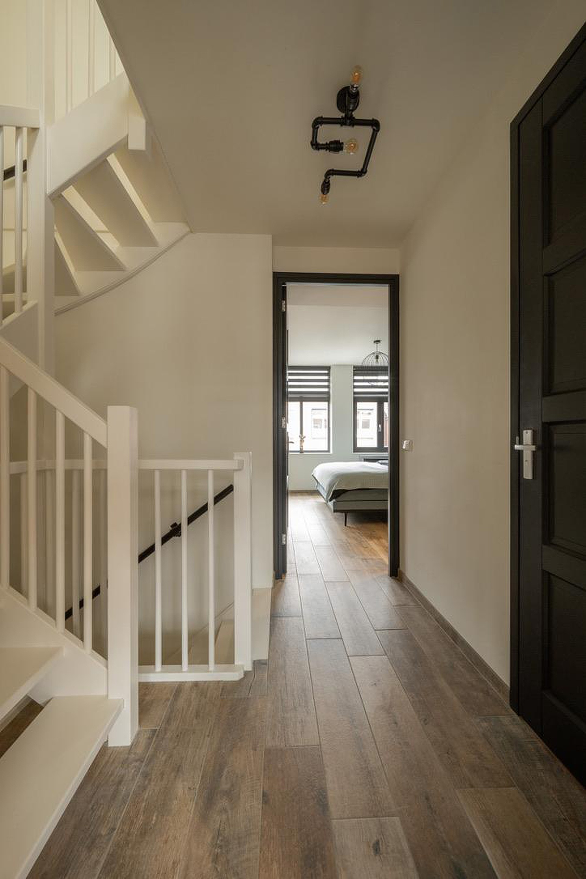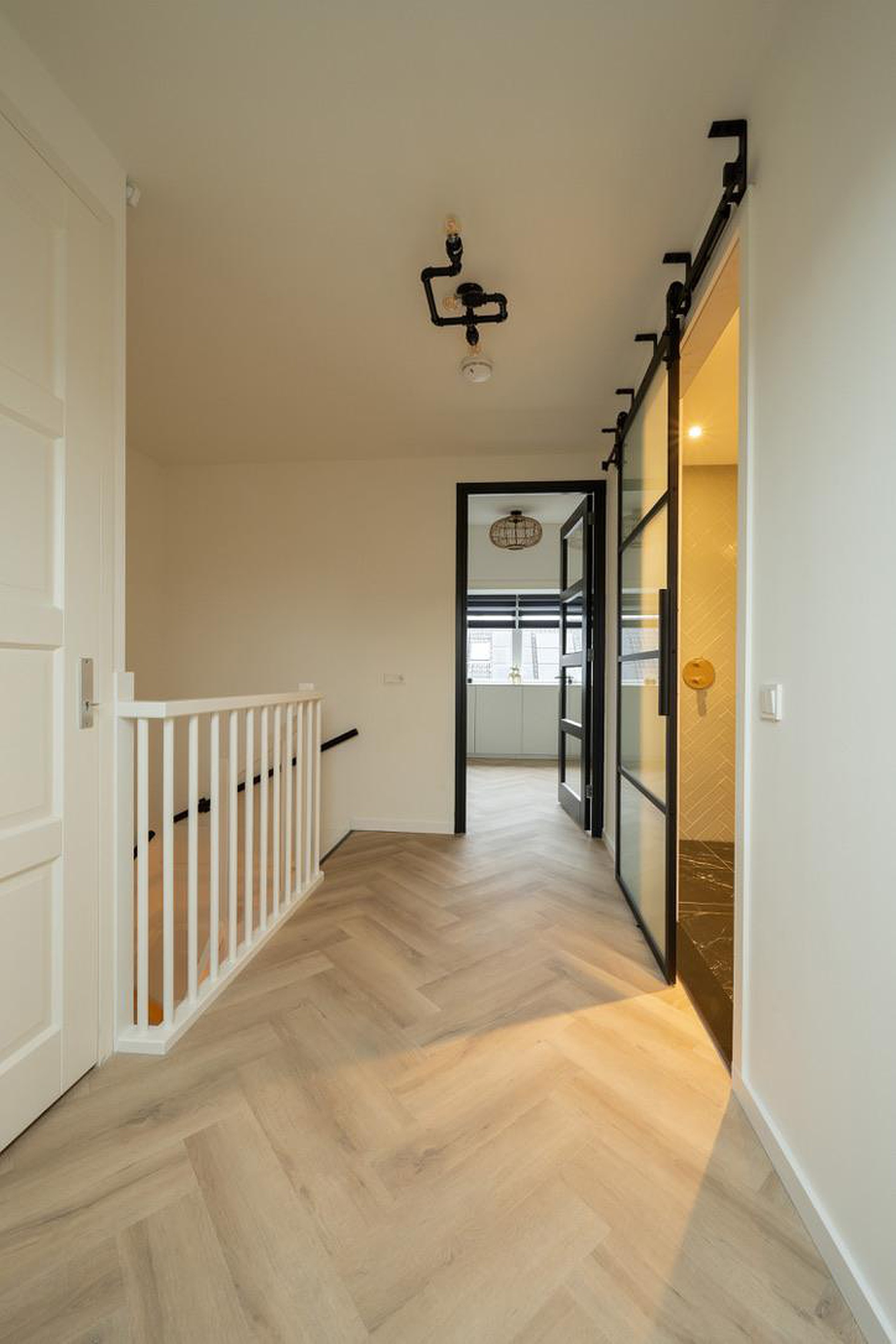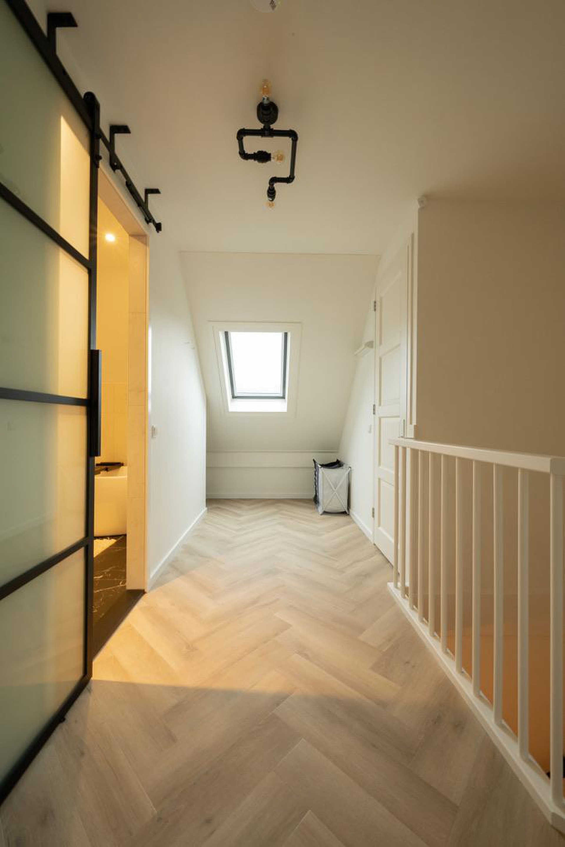 Op de overloop zijn de CV-opstelling, WTW-installatie en de witgoedaansluitingen netjes weggewerkt in separate ruimte.
