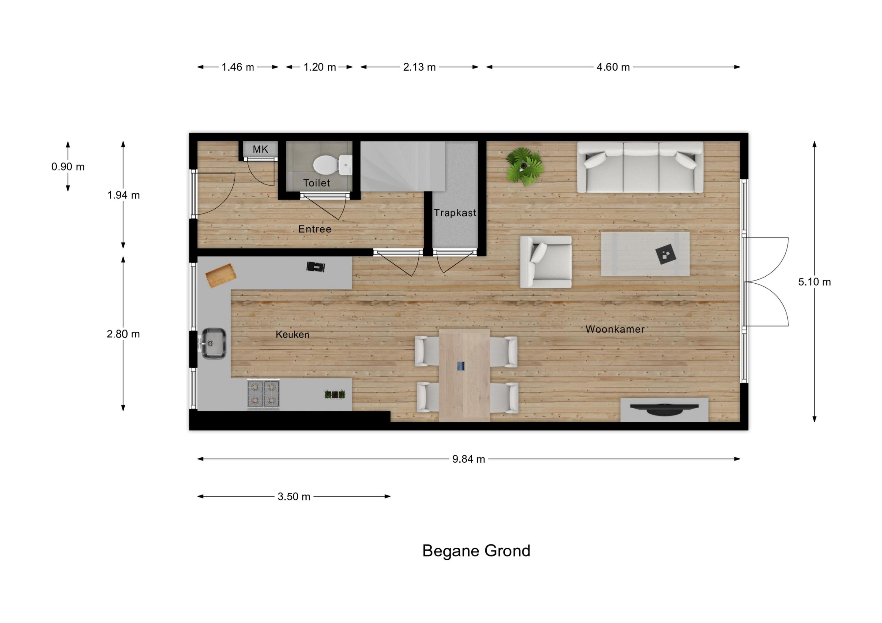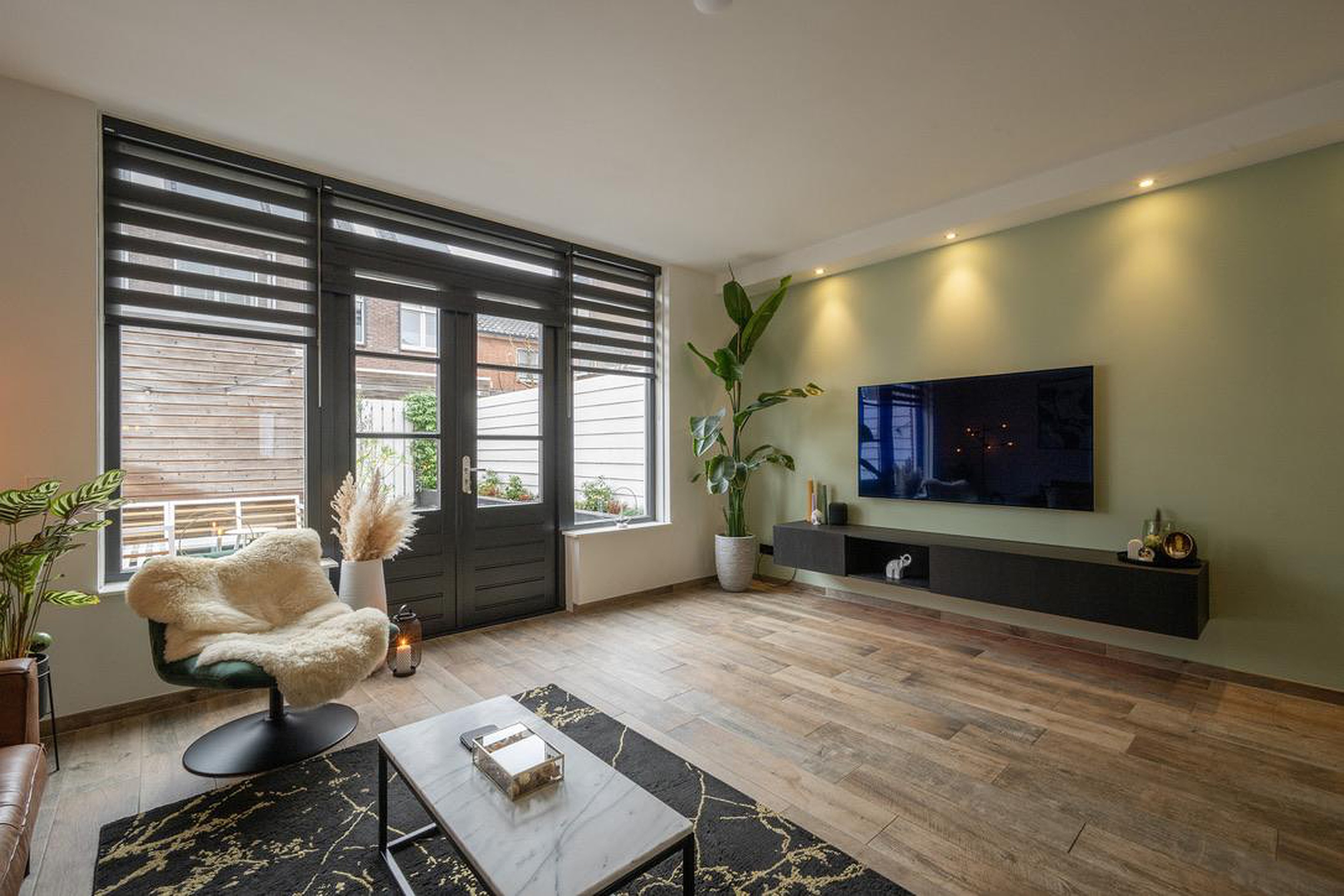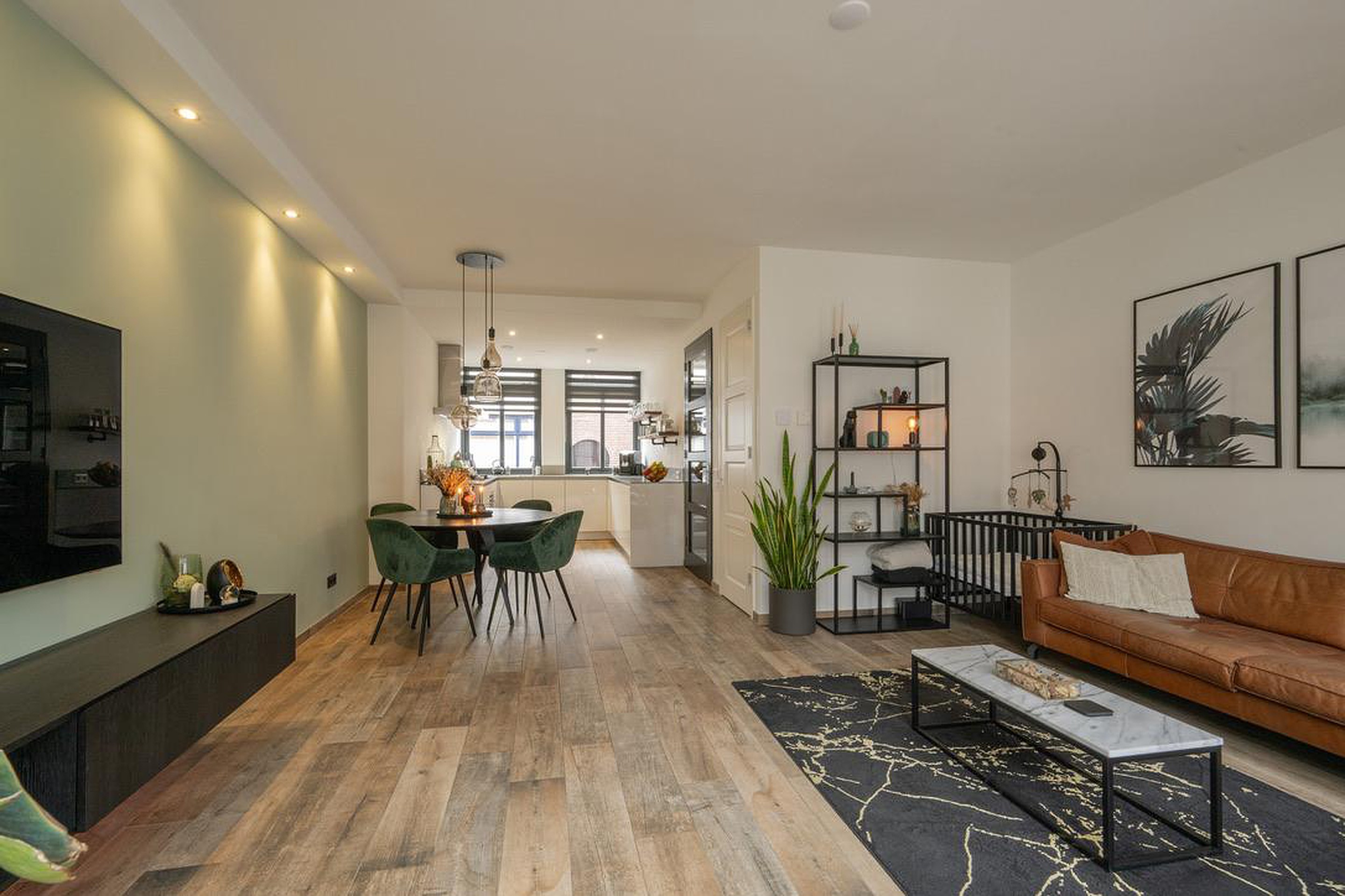 De woonkamer is ruim en licht, met dubbele deuren naar de achtertuin en een flinke trapkast. De indeling biedt voldoende ruimte voor zowel een comfortabele zithoek als een royale eethoek.