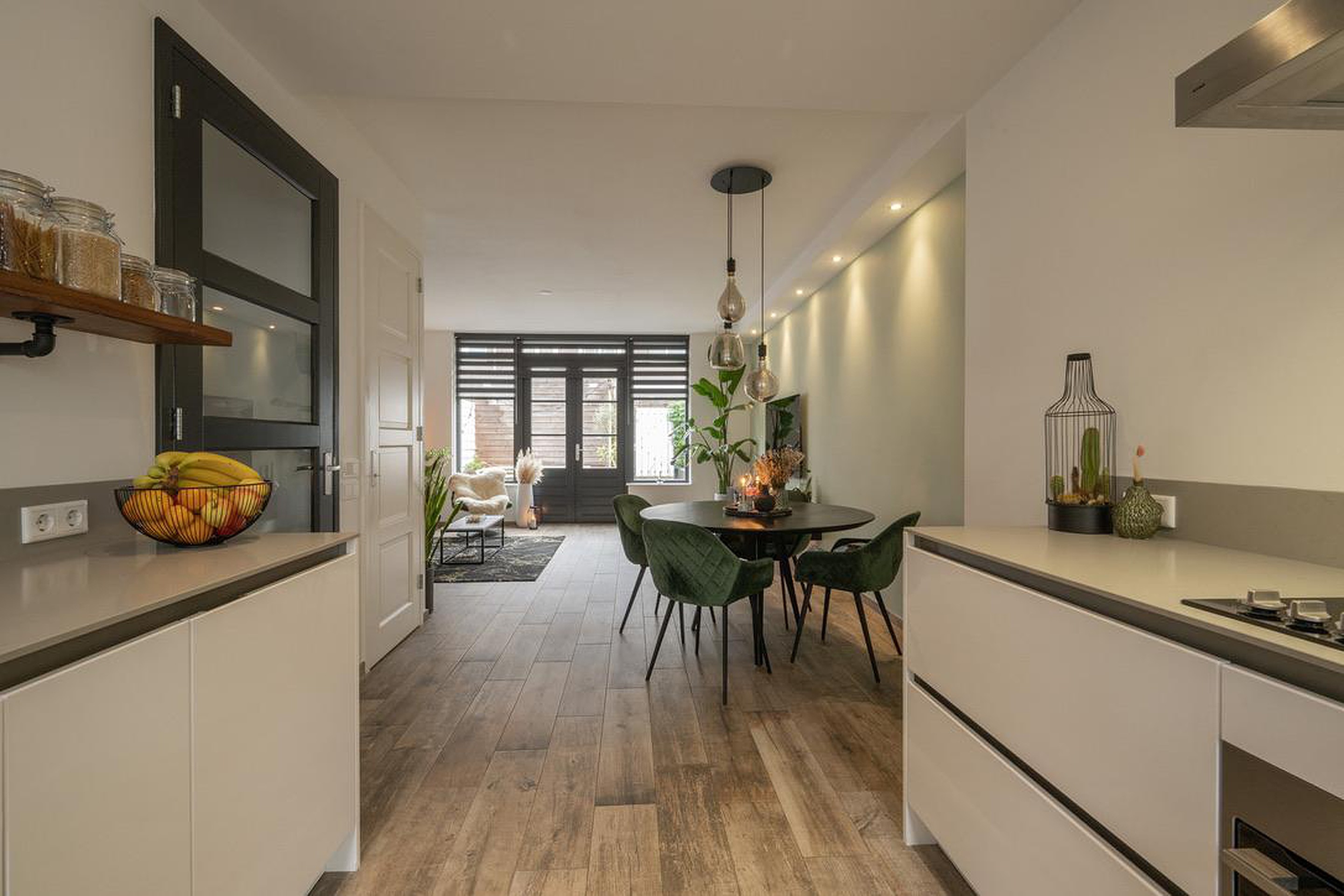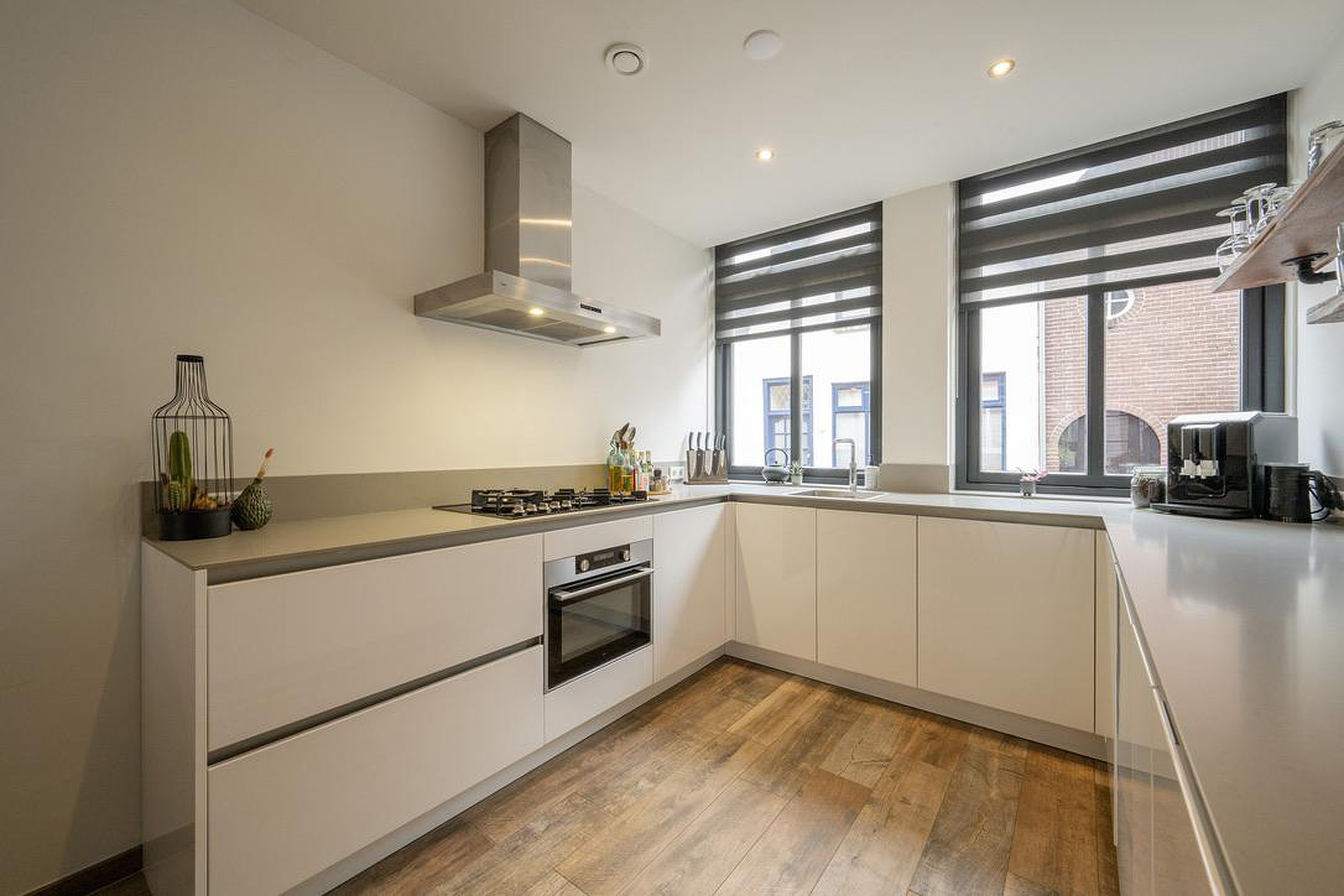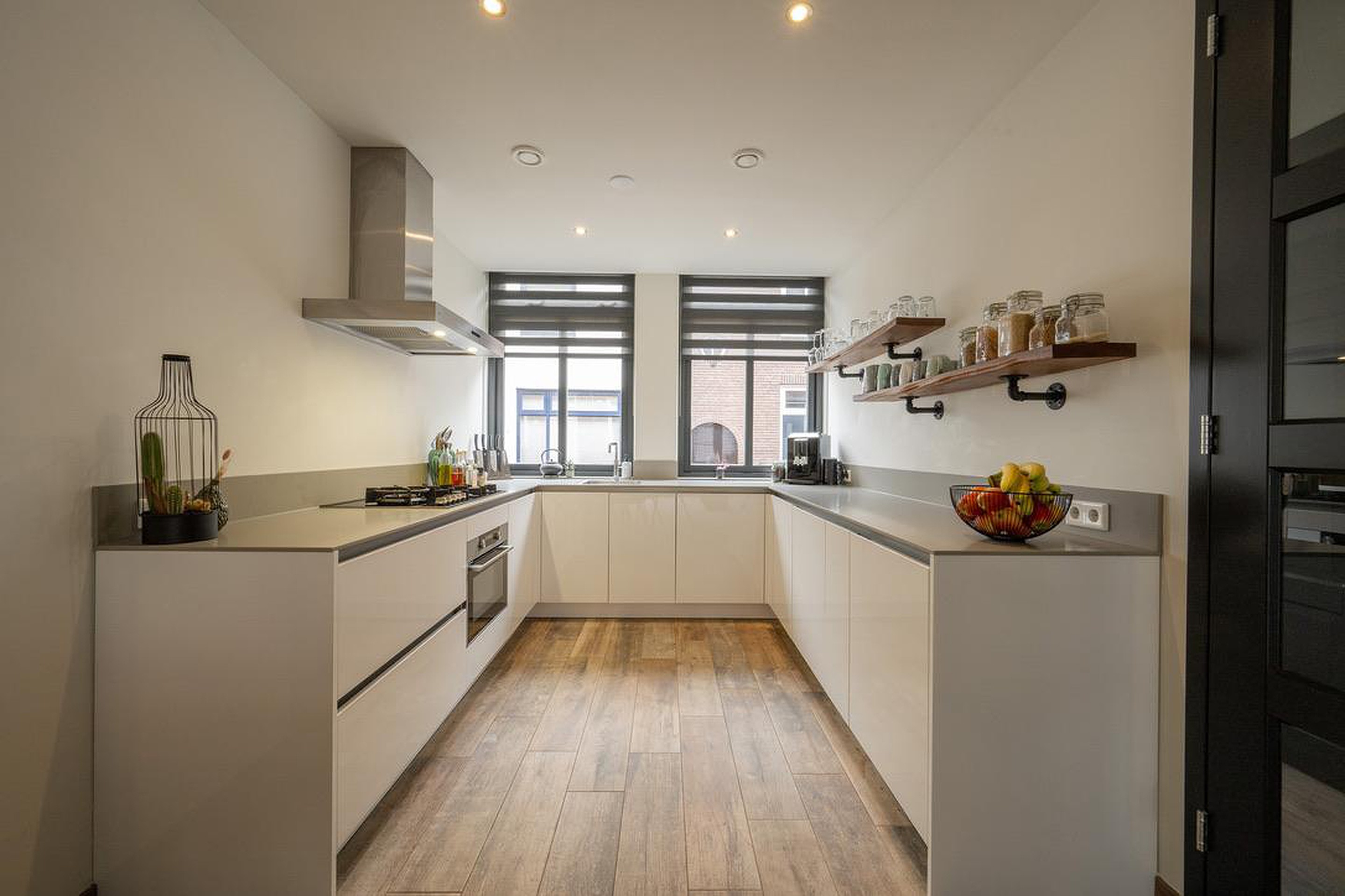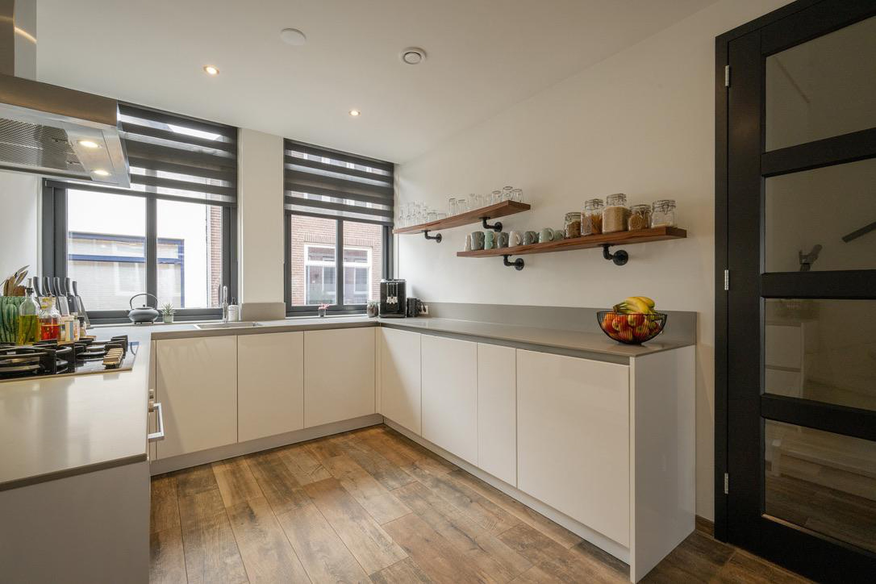 De open keuken is modern uitgevoerd en voorzien van alle gewenste inbouwapparatuur, waaronder een 5 pits gaskookplaat, afzuigkap, combi-oven, vaatwasser, koelkast, vriezer en Quooker kraan. Het geheel is afgewerkt met een composiet werkblad en de U-vorm biedt veel bergruimte.