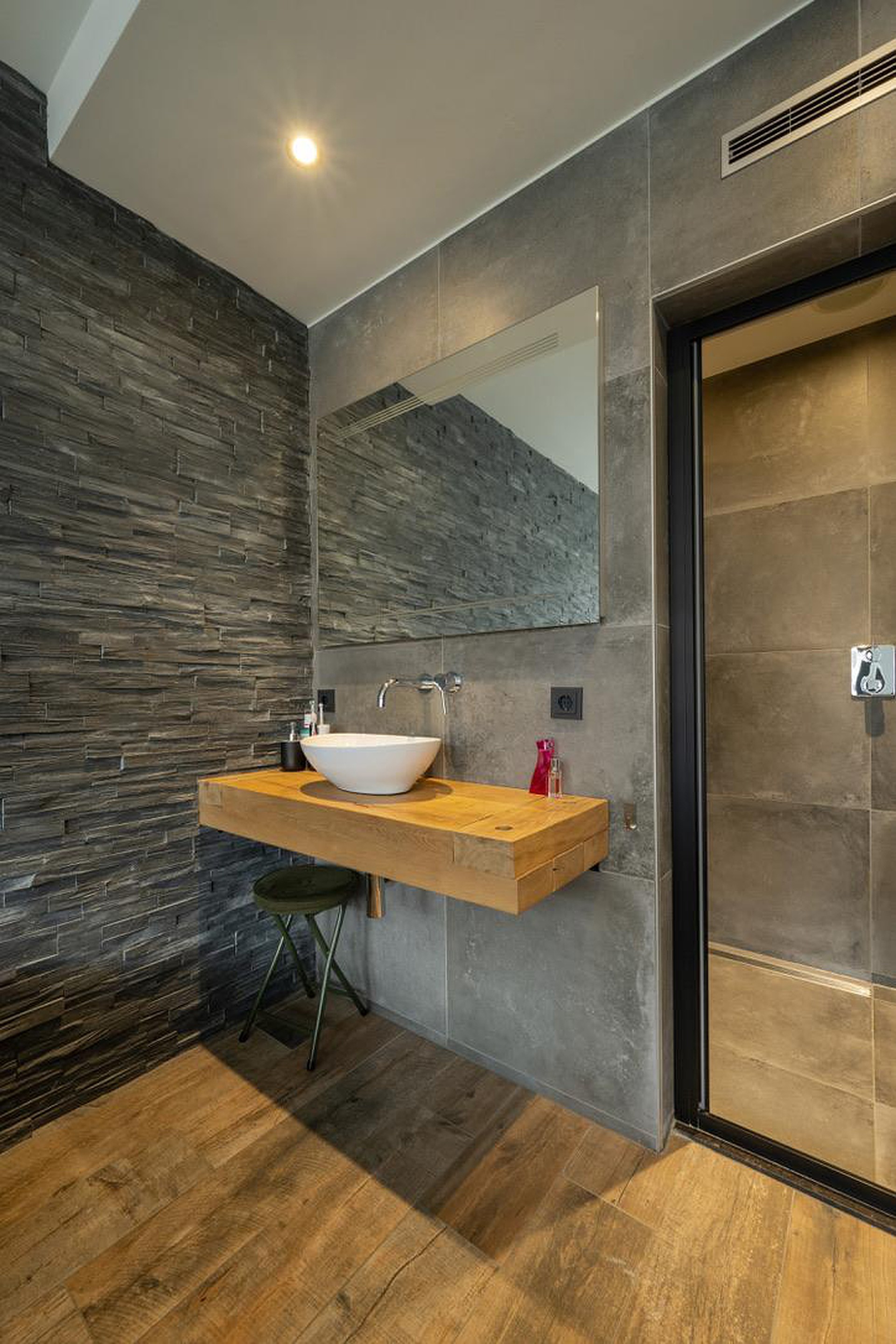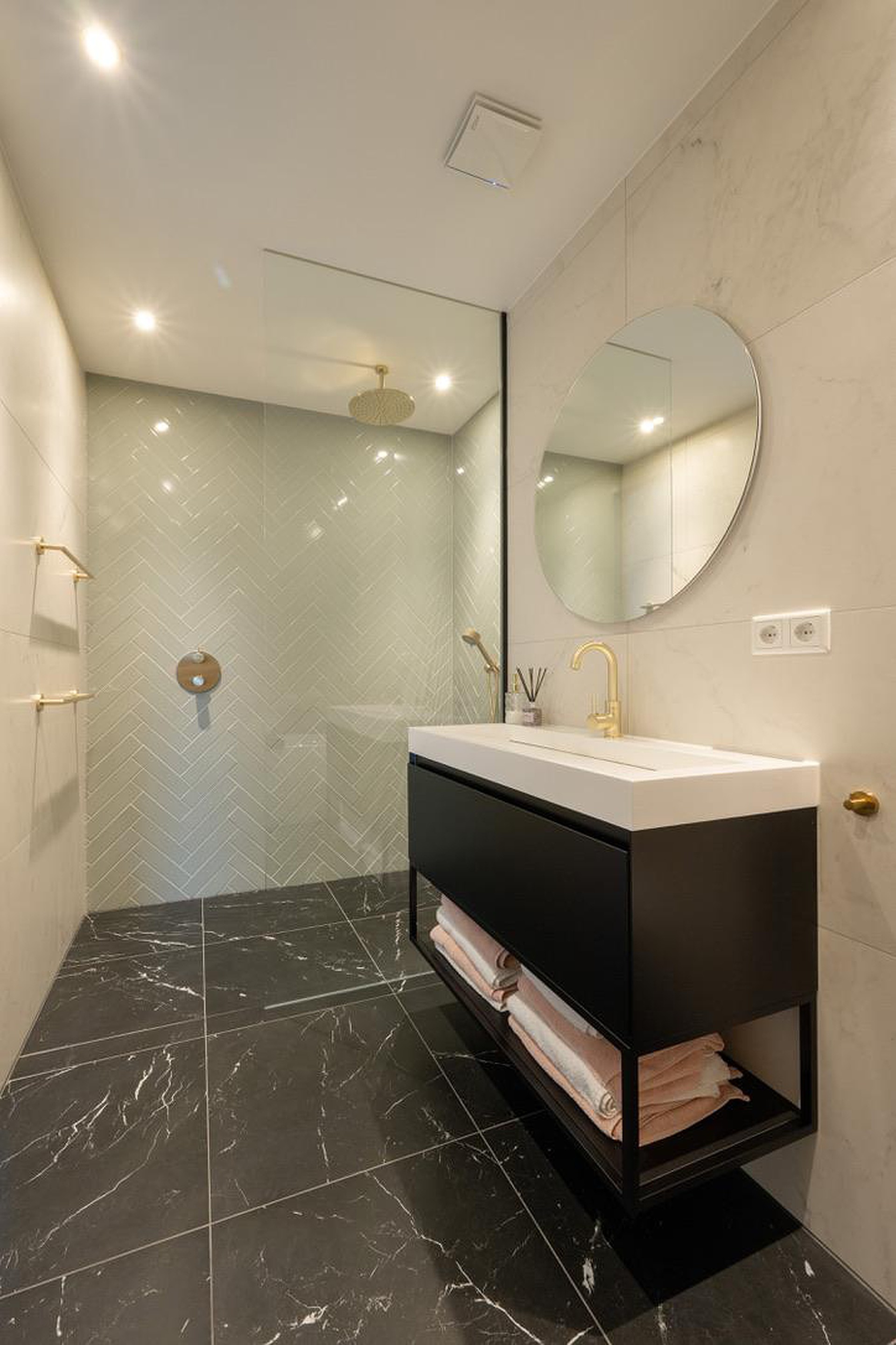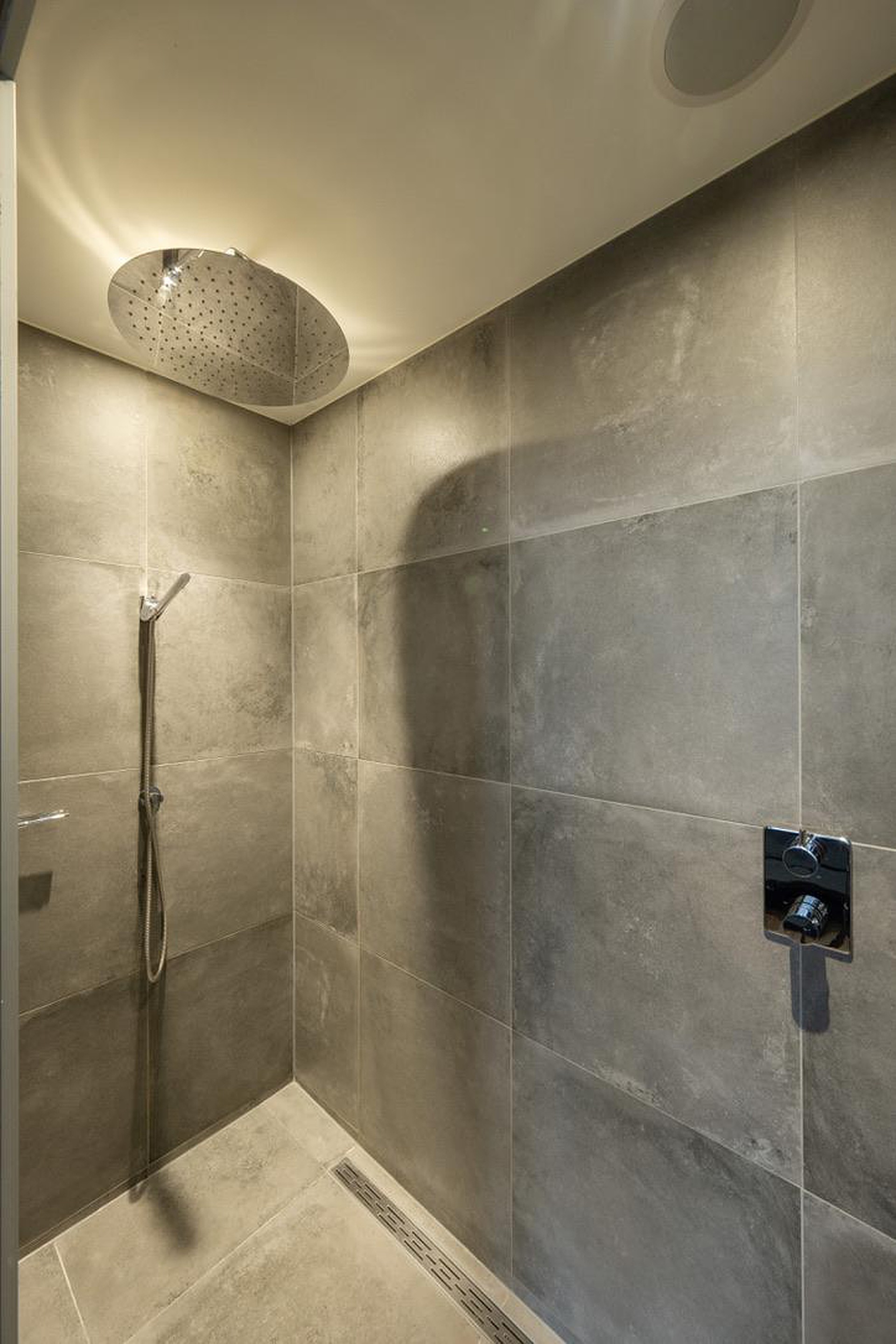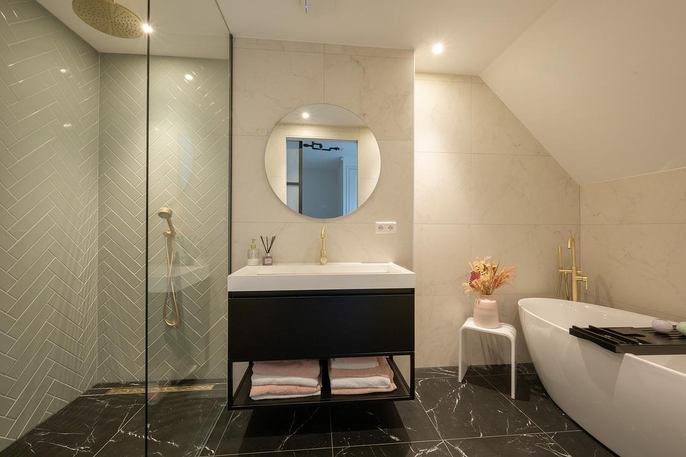 Daarnaast is hier een stijlvolle tweede badkamer met vloerverwarming aanwezig. Net als de andere badkamer is deze stijlvol afgewerkt en uitgerust met een wastafelmeubel, een vrijstaand ligbad en een inloop (regen)douche.