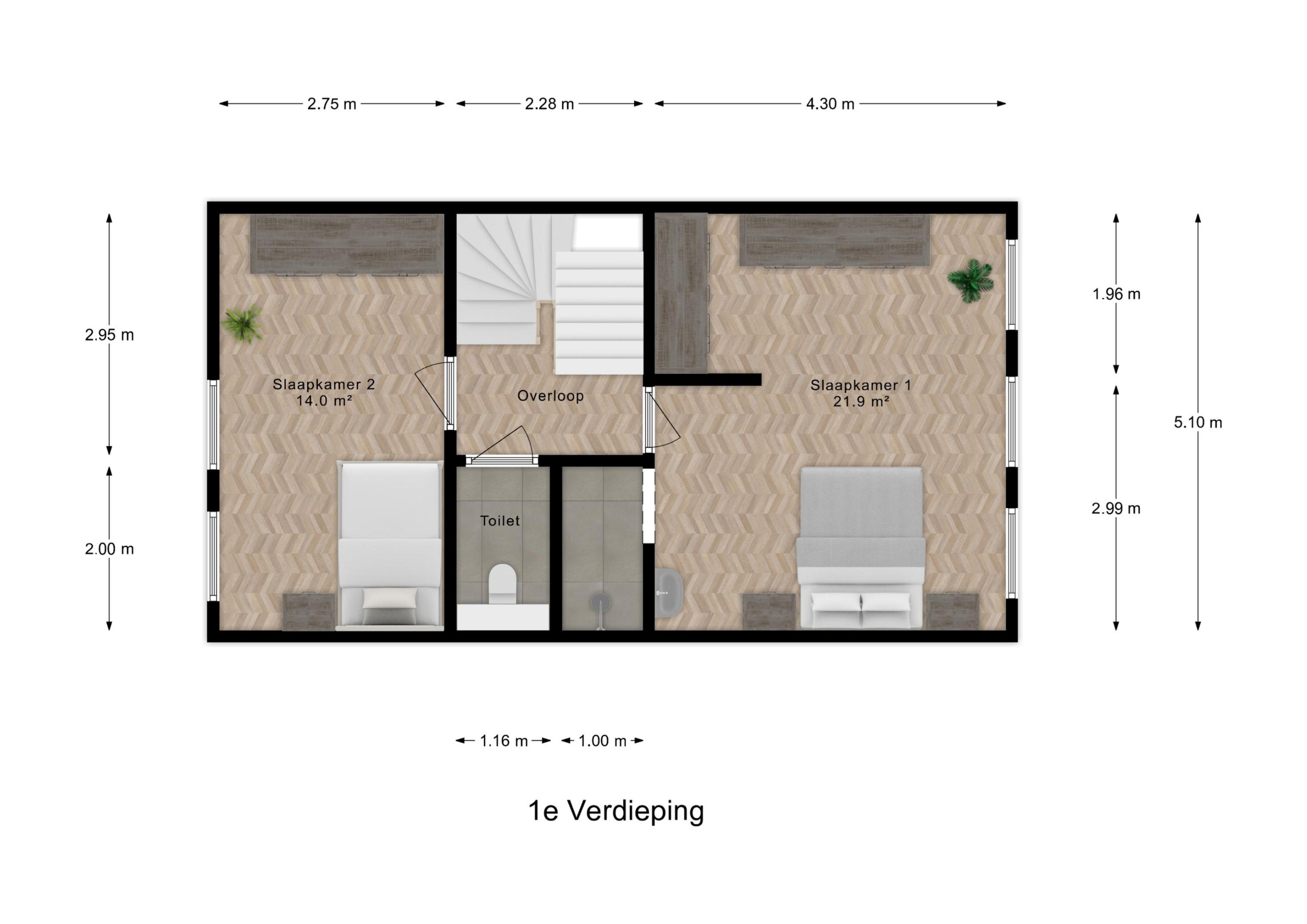 Eerste verdieping Op de eerste verdieping bevinden zich twee flinke slaapkamers.