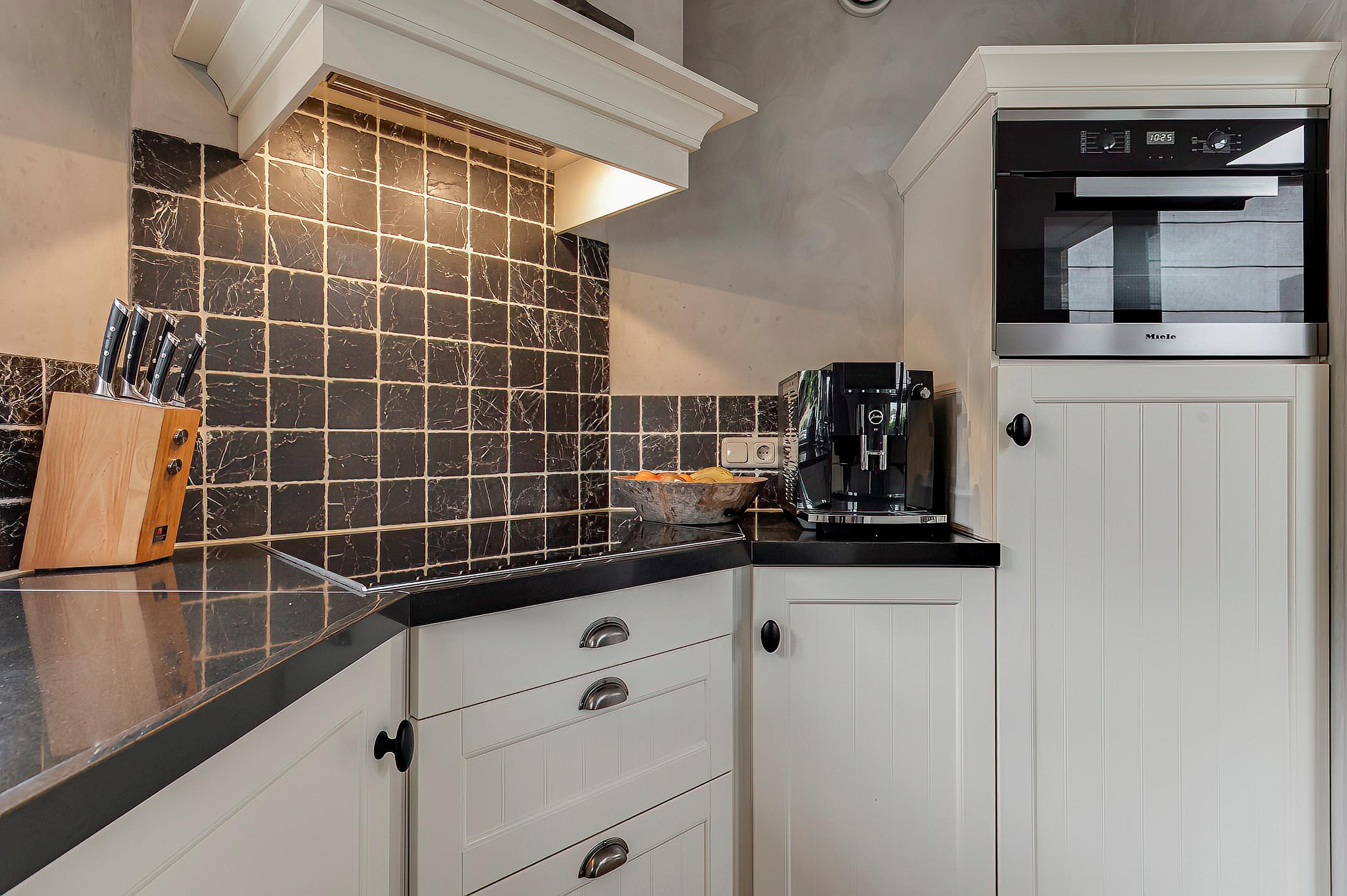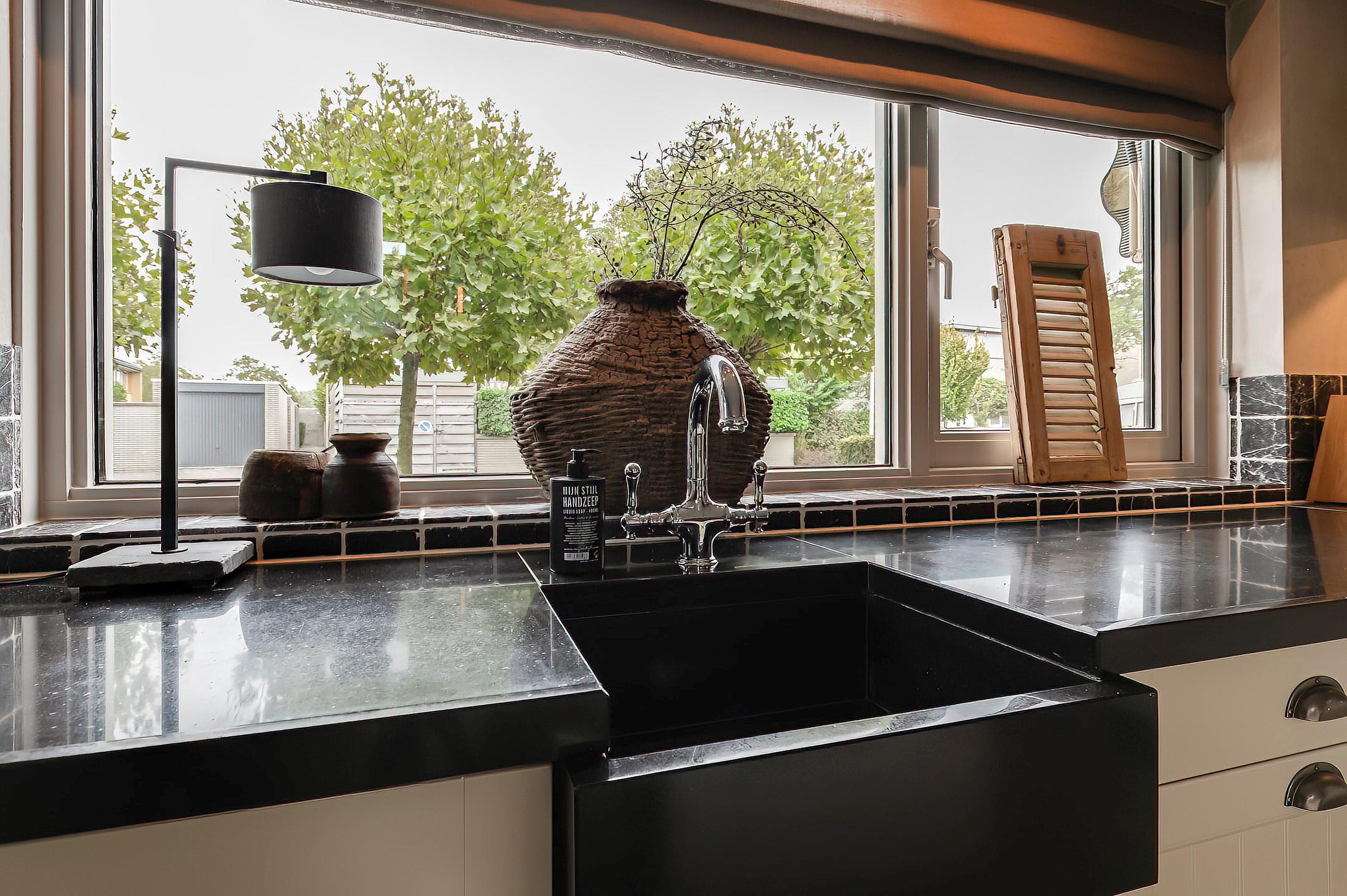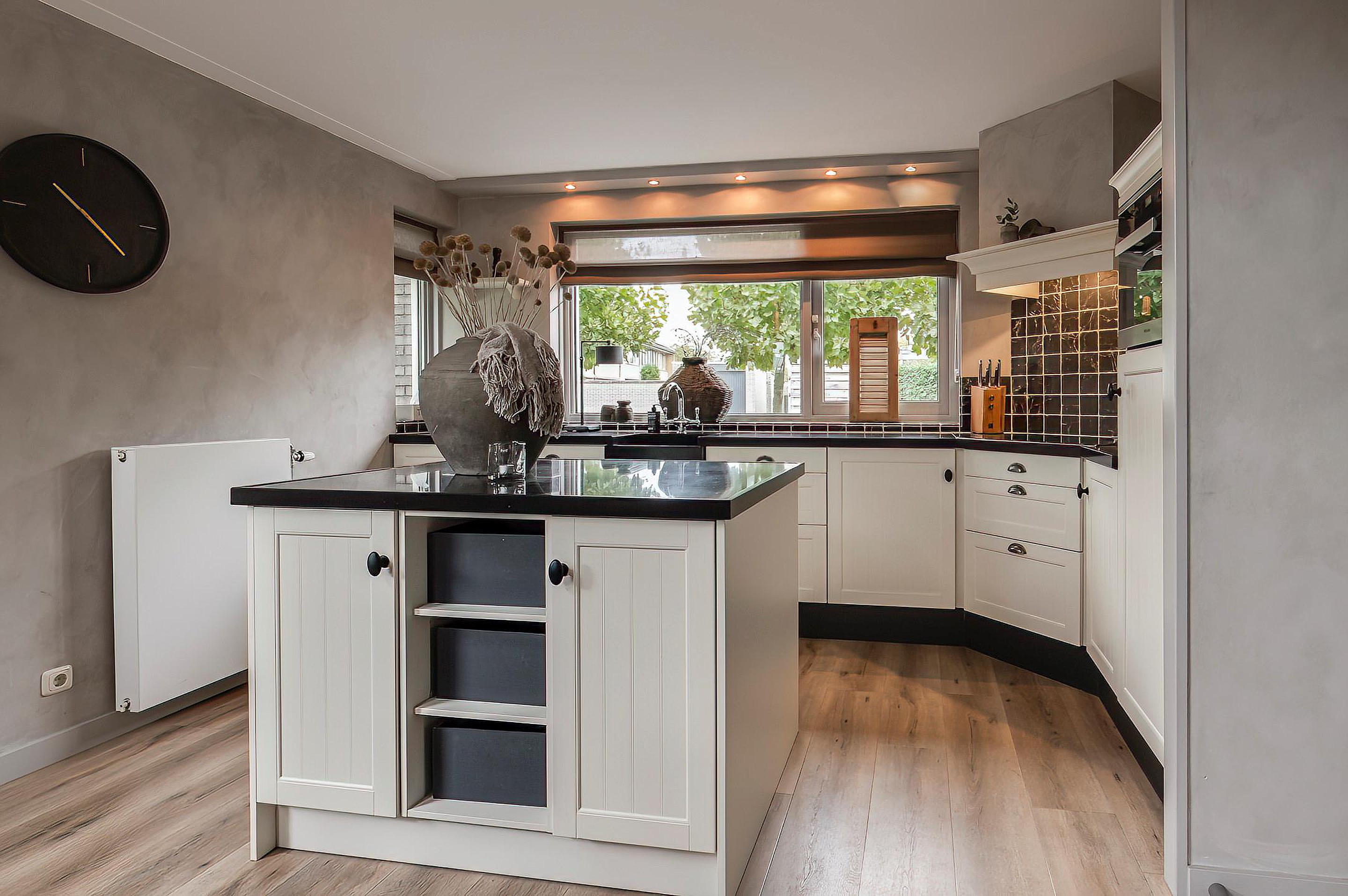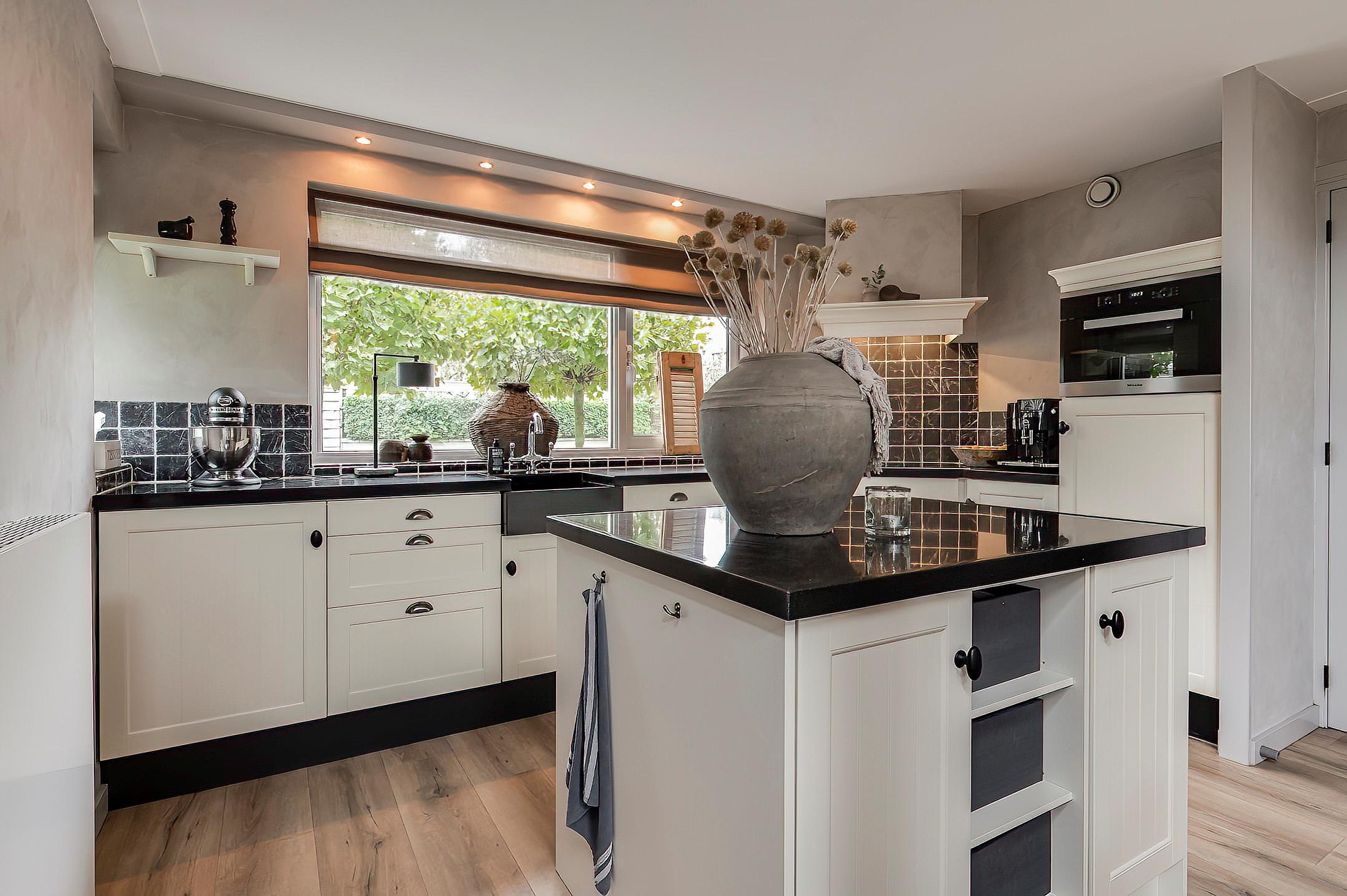 De woonkeuken is aan de voorkant van de woning gesitueerd. Er is een inductie kookplaat, afzuigkap, oven, koelkast en een vaatwasser. Het geheel is stijlvol uitgevoerd en mede door het eiland is er veel kast- en werkruimte.