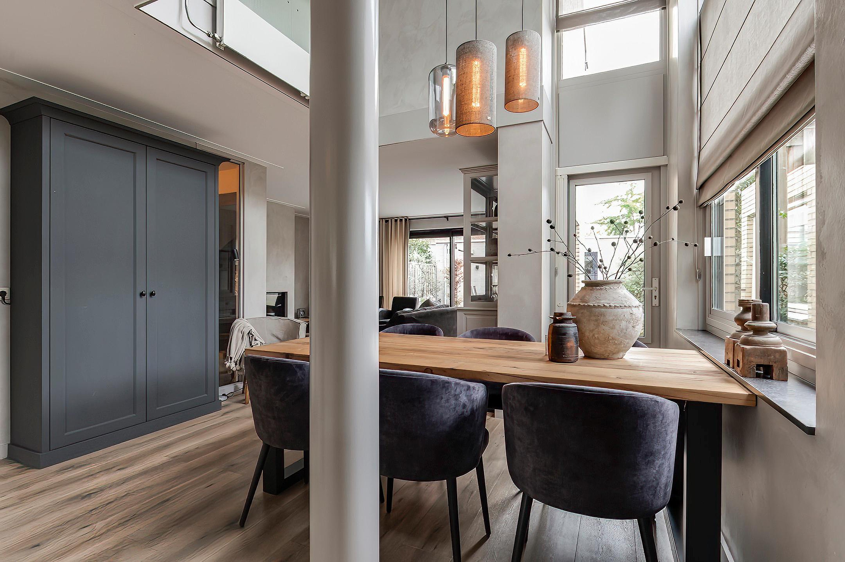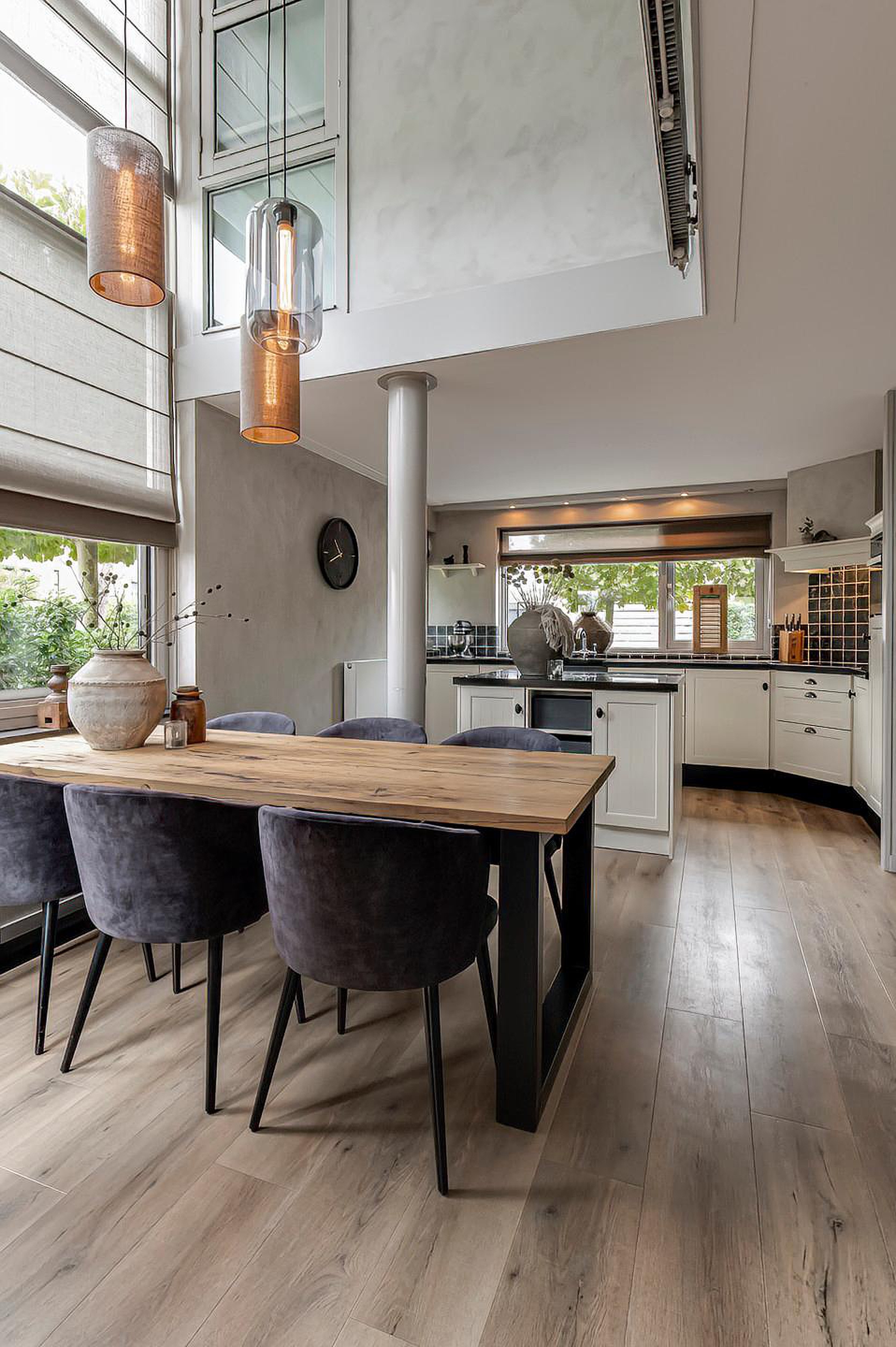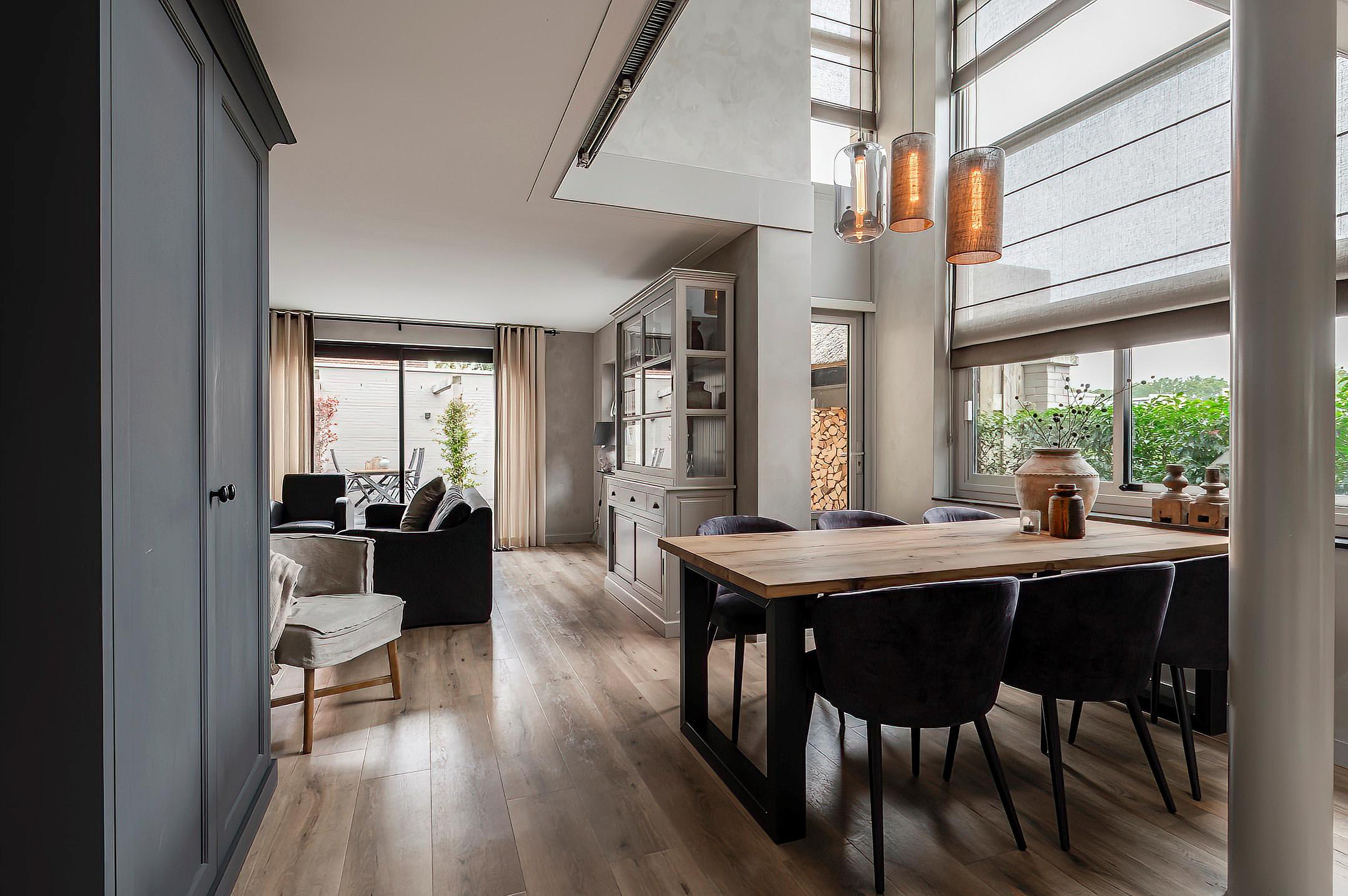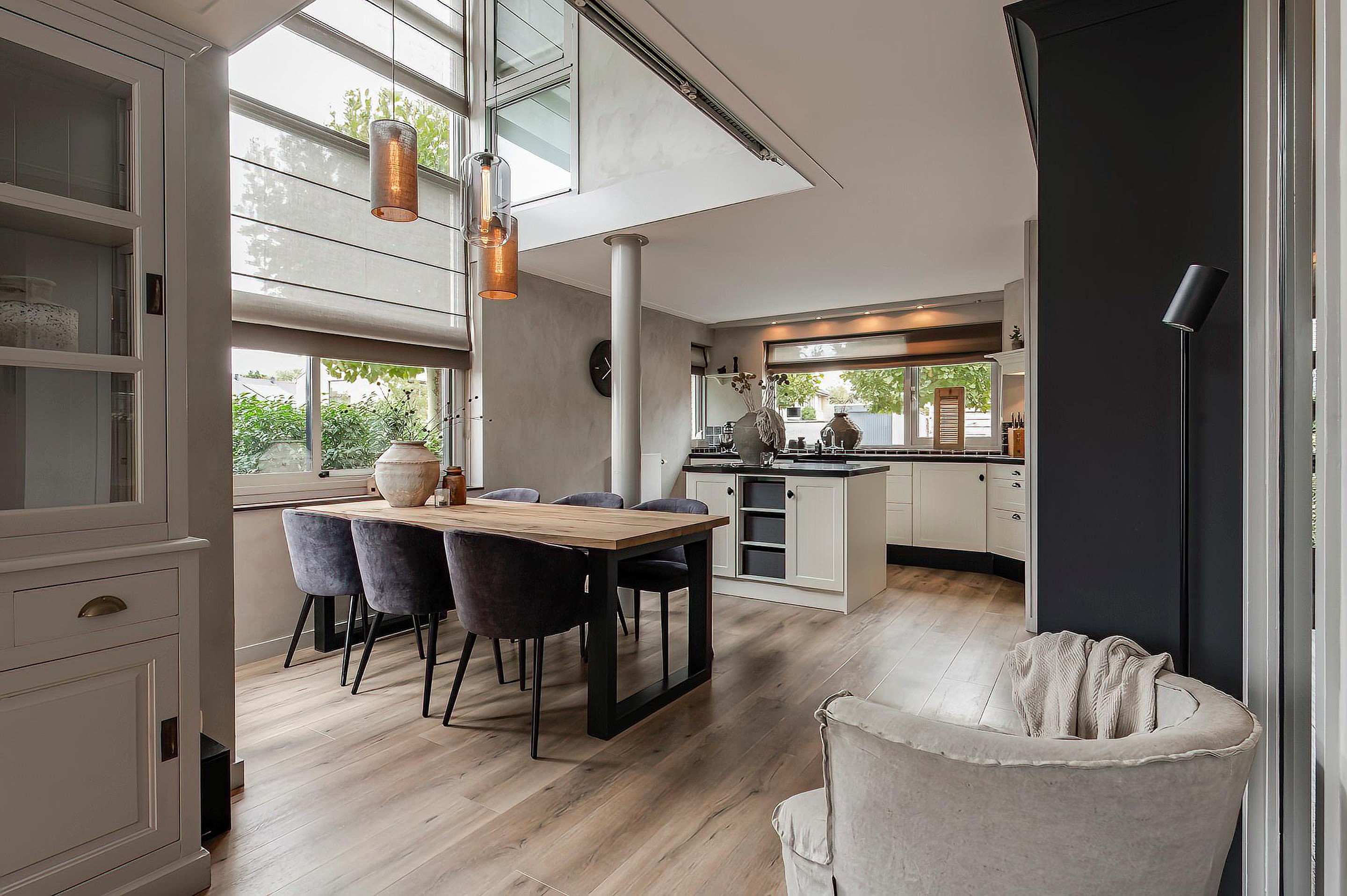 De woonkeuken is aan de voorkant van de woning gesitueerd. Er is een inductie kookplaat, afzuigkap, oven, koelkast en een vaatwasser. Het geheel is stijlvol uitgevoerd en mede door het eiland is er veel kast- en werkruimte.