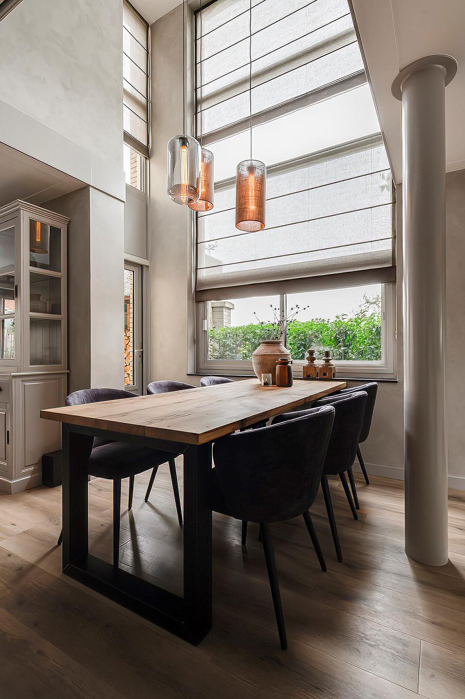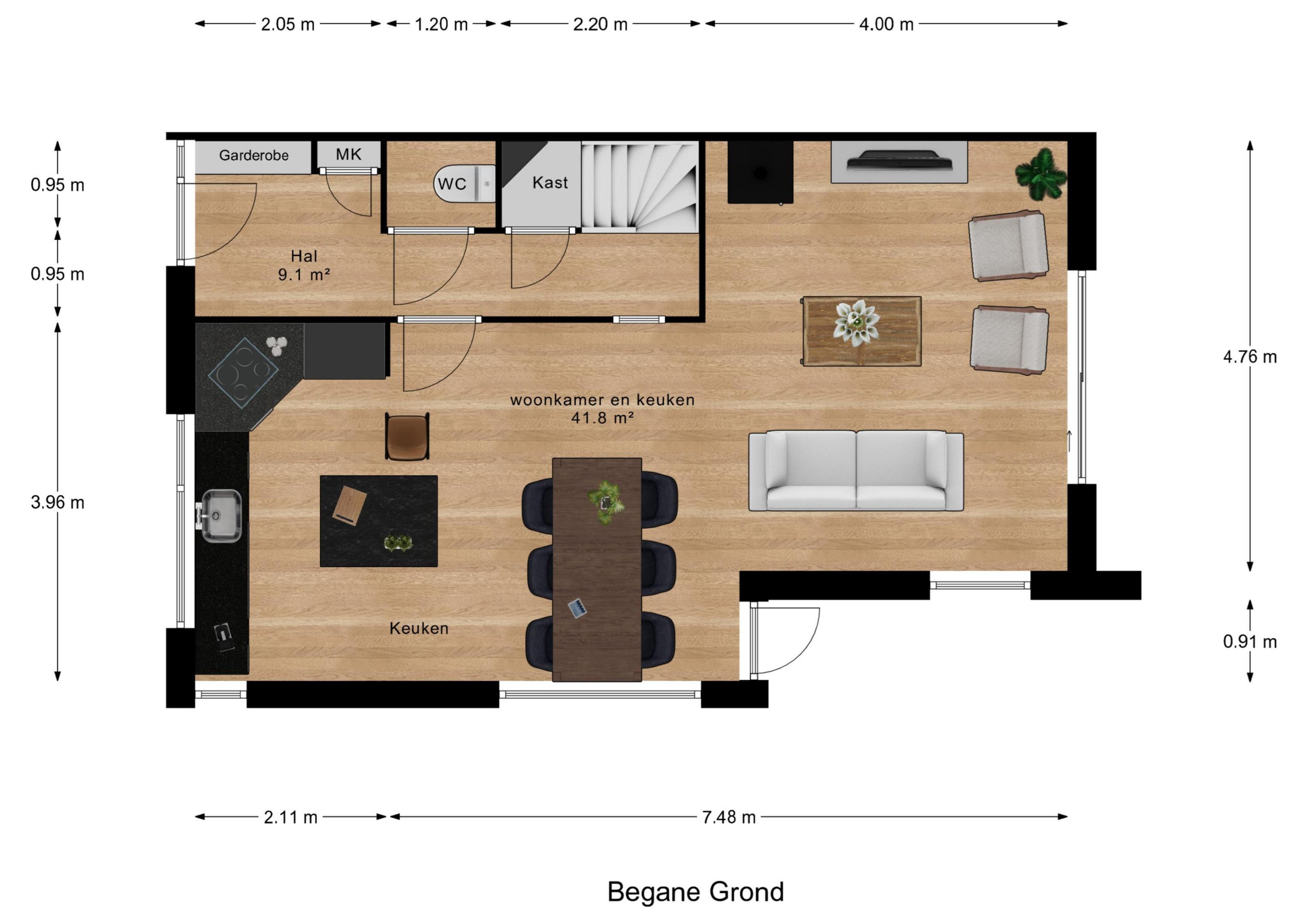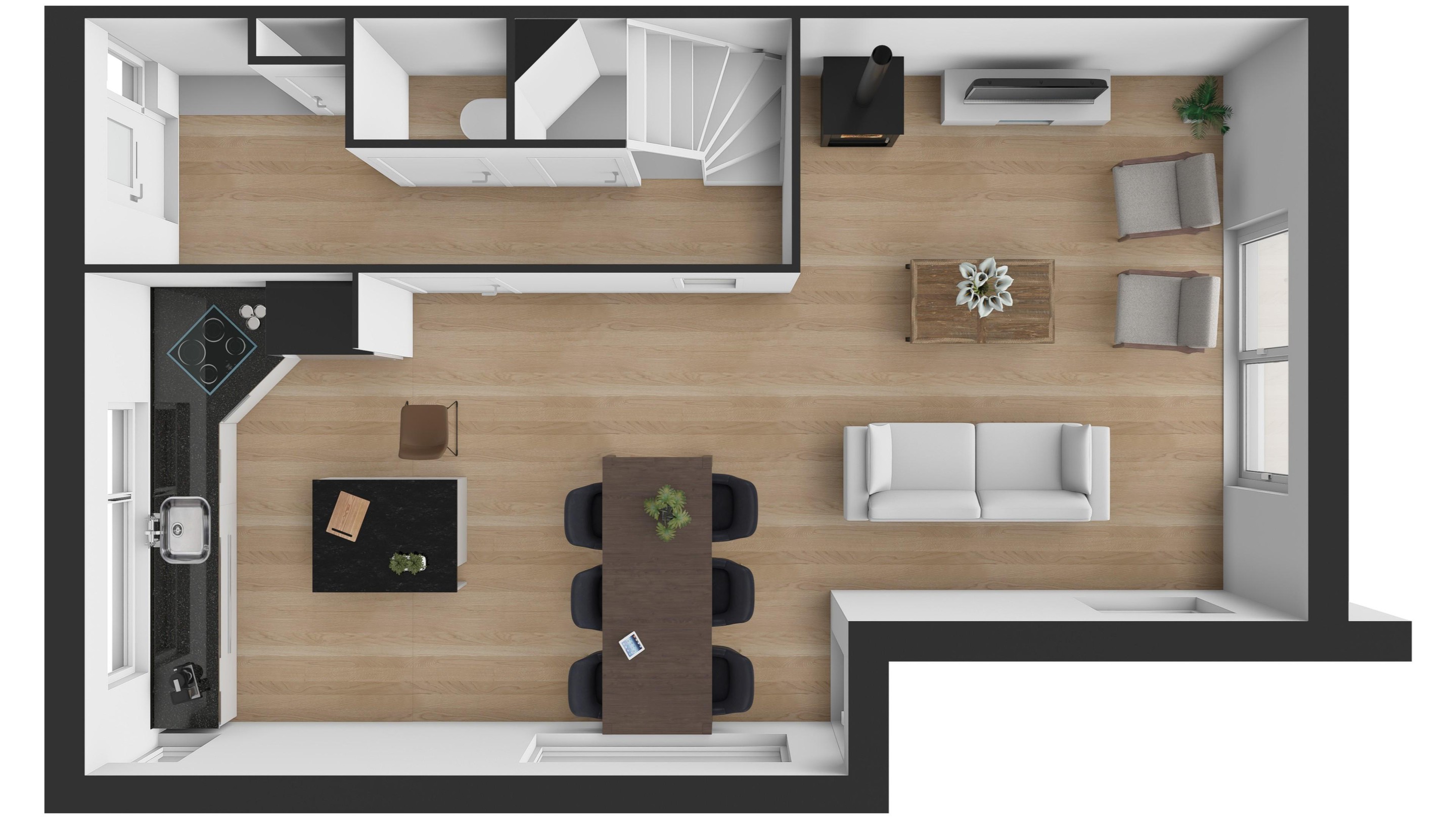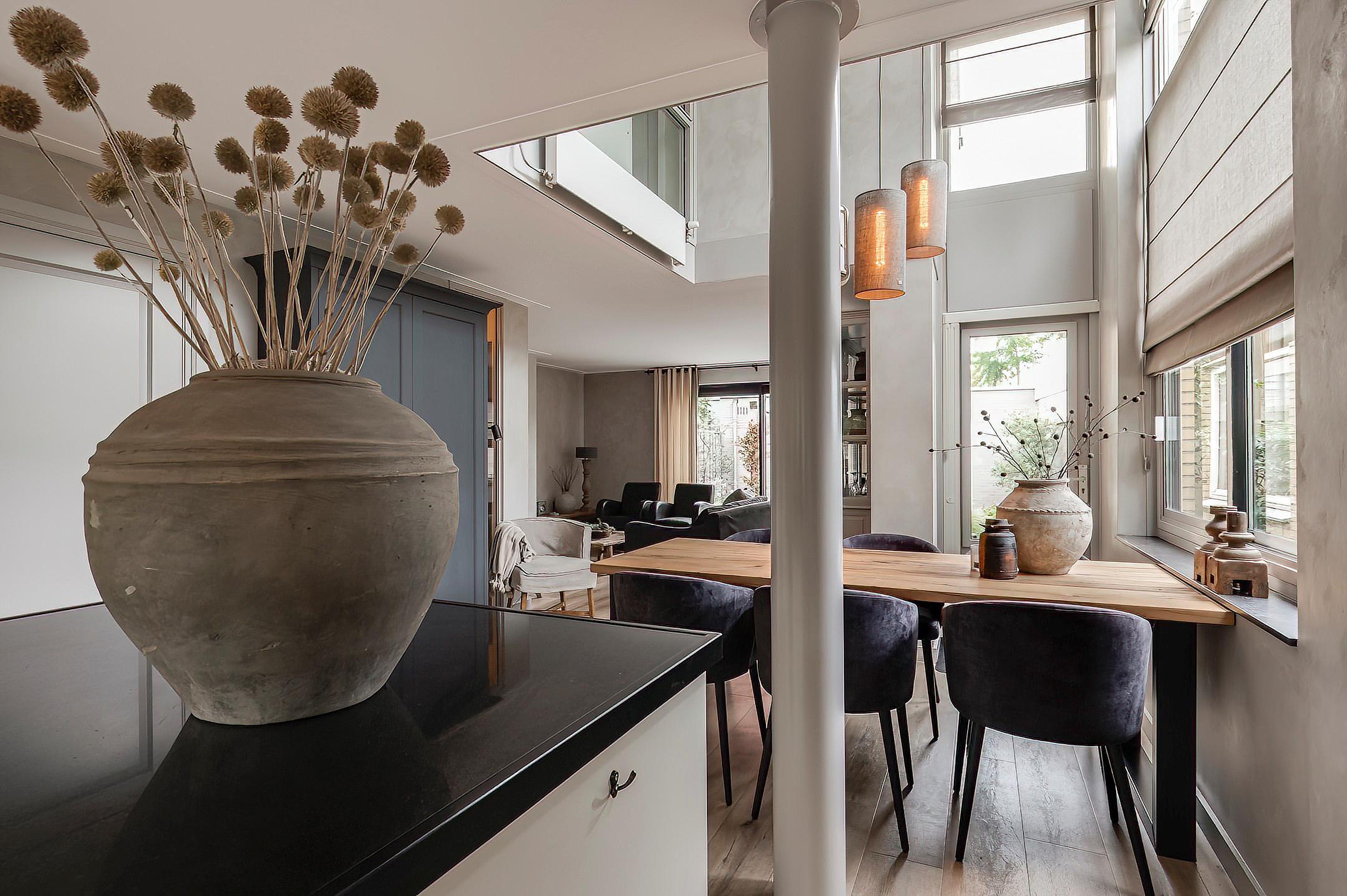 De woonkeuken is aan de voorkant van de woning gesitueerd. Er is een inductie kookplaat, afzuigkap, oven, koelkast en een vaatwasser. Het geheel is stijlvol uitgevoerd en mede door het eiland is er veel kast- en werkruimte.