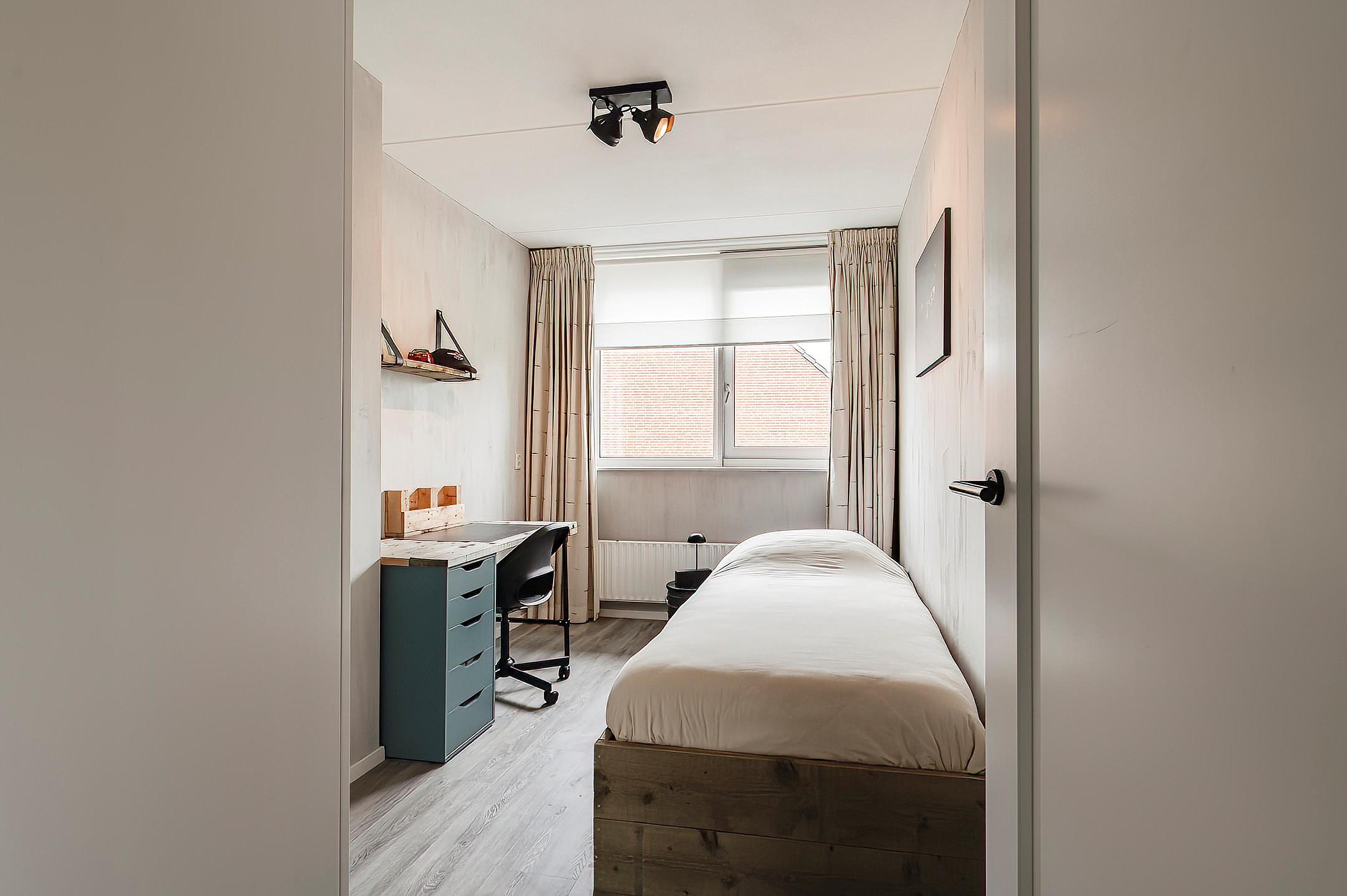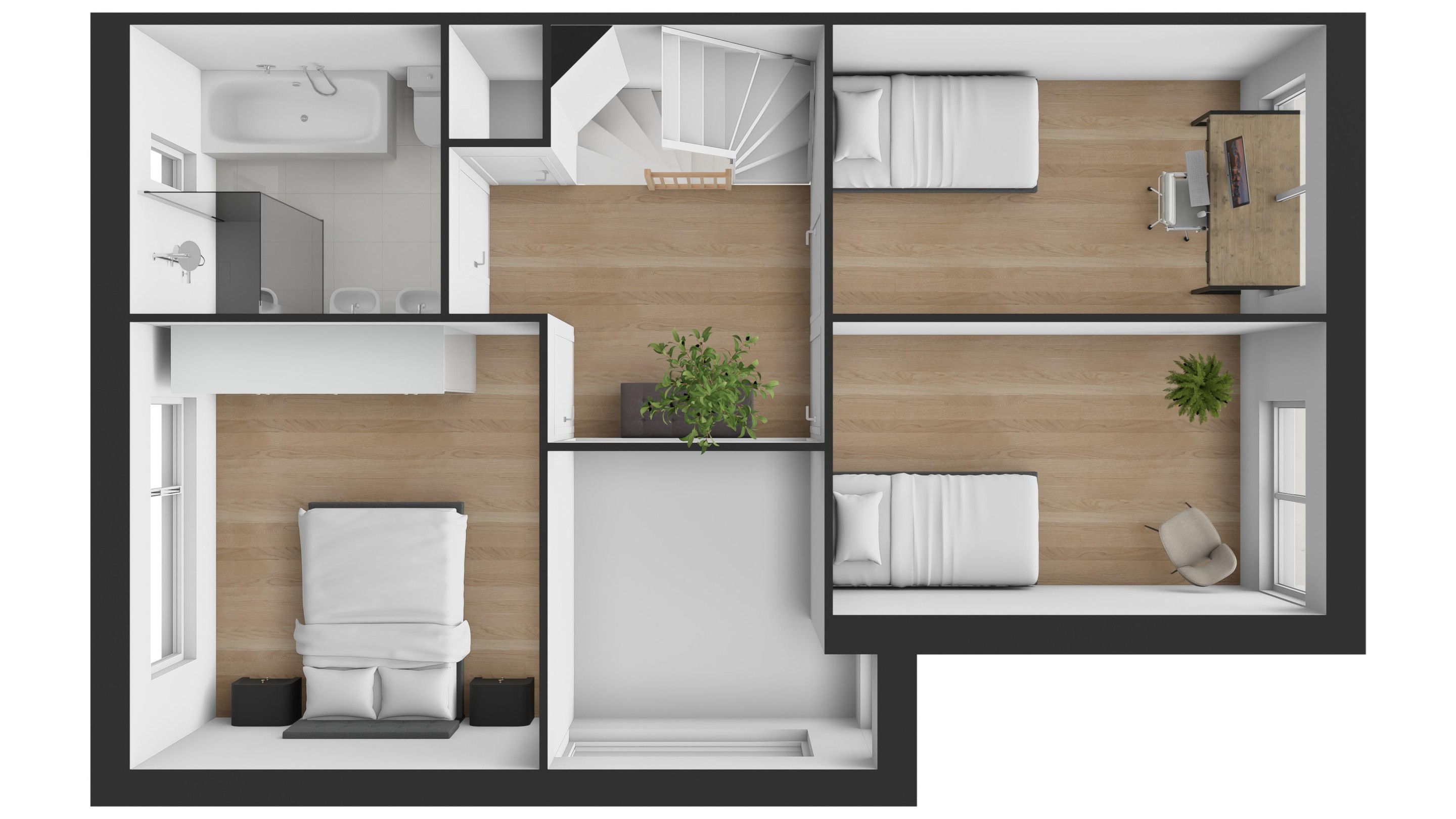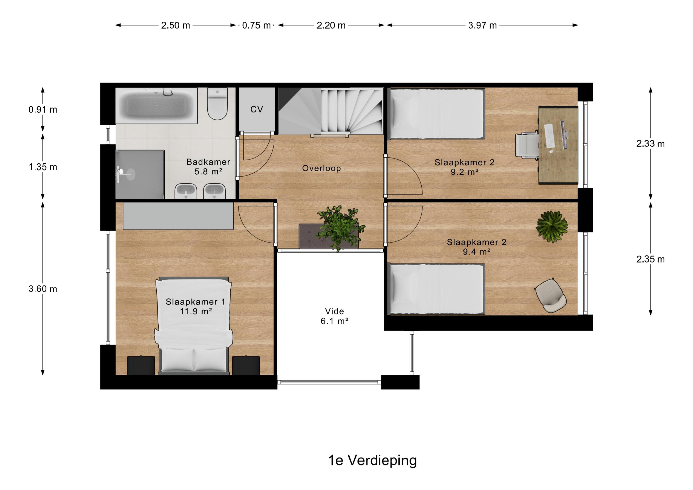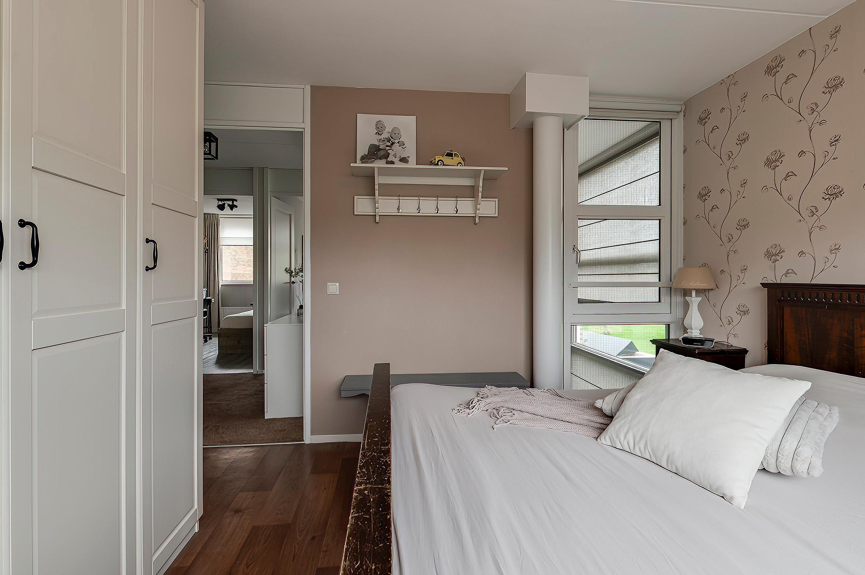 De ruime overloop biedt toegang aan een drietal slaapkamers van respectievelijk 12, 9 en 9 m2. Ruime kamers dus.
